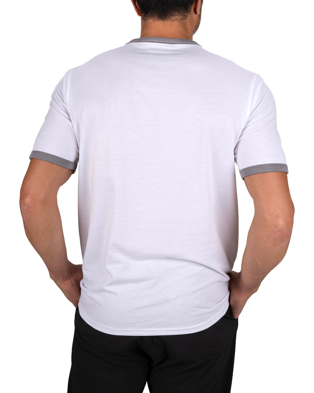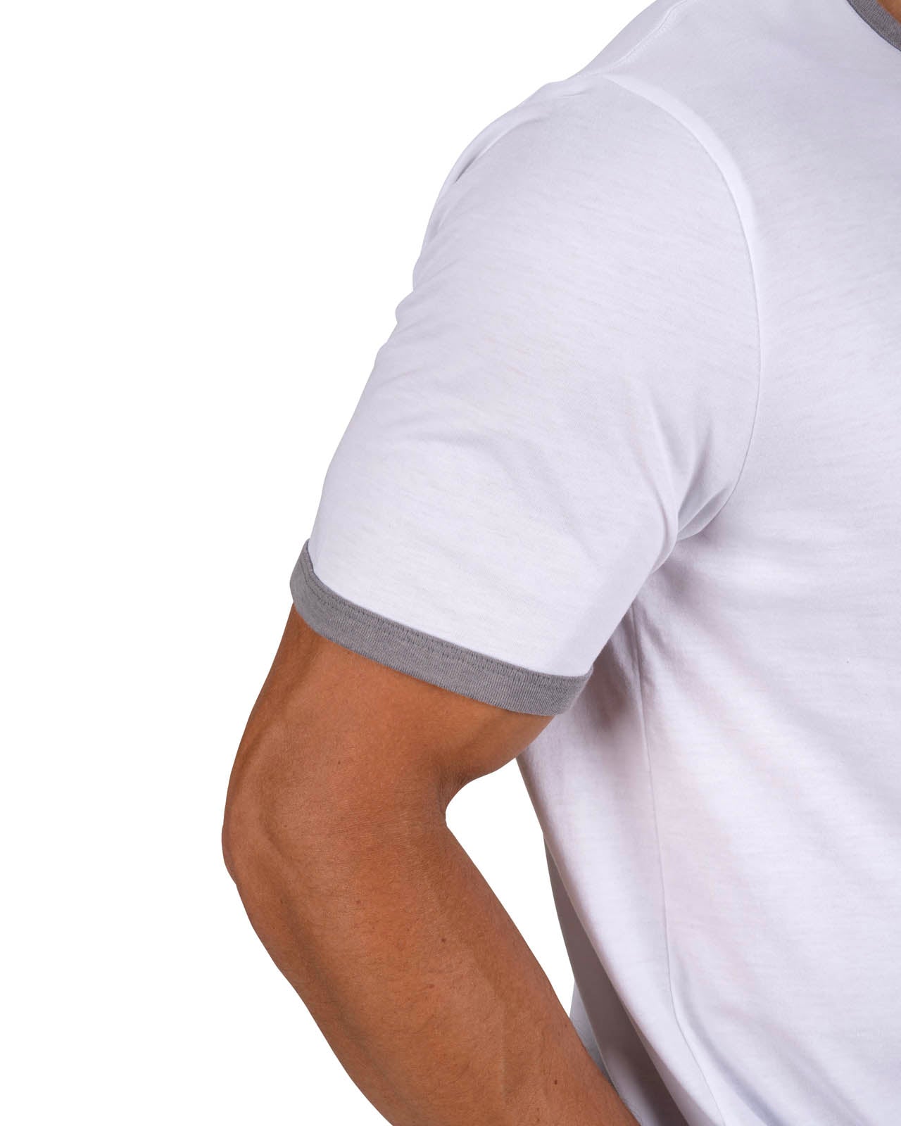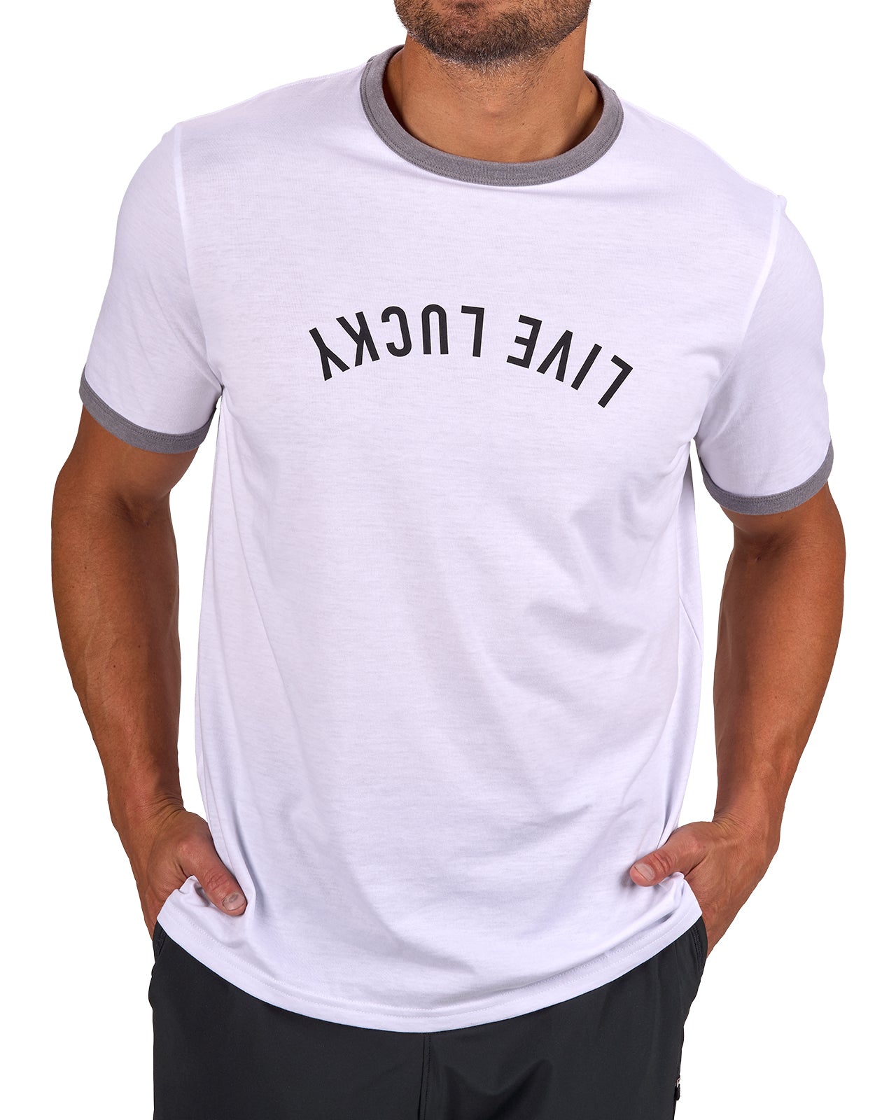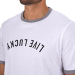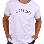 Stay stylish and comfortable in this men's white graphic t-shirt with sporty grey trim and a fun upside down Live Lucky print. Made from a soft cotton poly spandex blend, this tee stretches with every movement while offering moisture wicking comfort to keep you cool. Built in shape retention ensures it stays looking fresh wear after wear. Pair with a blazer or go for a casual look with this athletic tee, perfect for dressing up or down with ease.