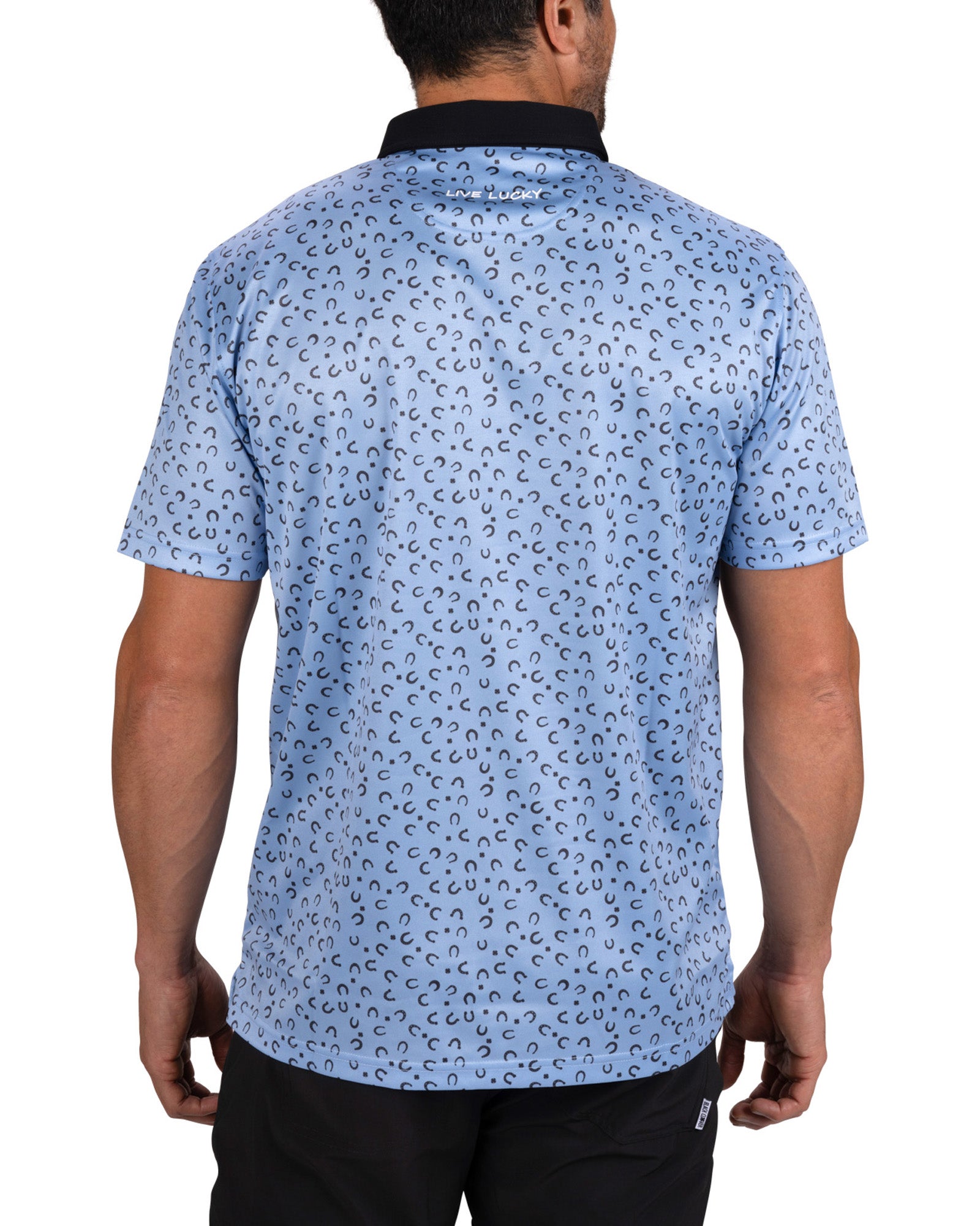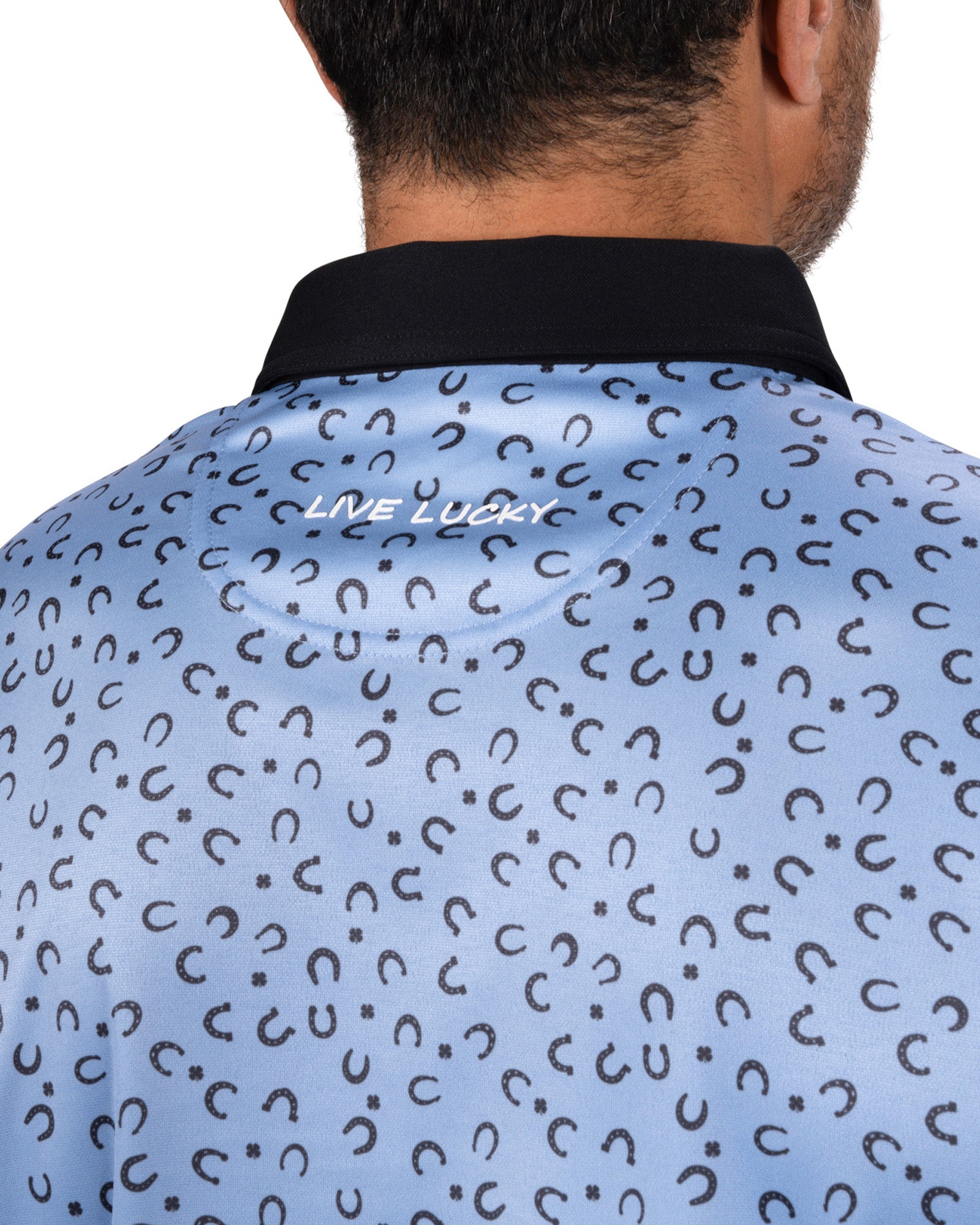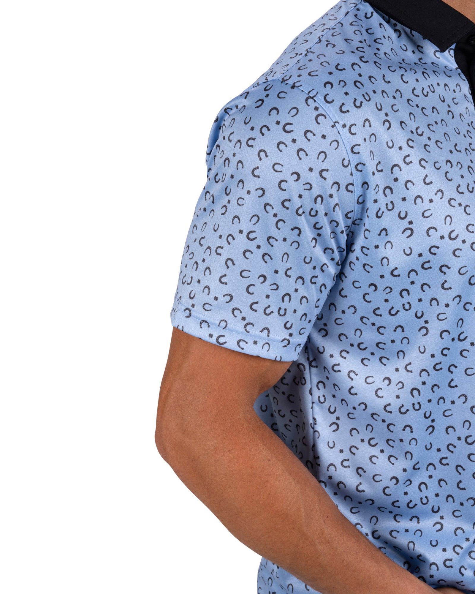 Luck meets performance with The Good Luck Polo in peri blue features a playful mix of navy horseshoe and clover patterns for a design that stands out with subtle charm. Crafted with polyester and Syntrel stretch, this light blue golf polo moves naturally with you and stays breathable all day. The fabric is engineered to resist shrinking, retain its shape, and deliver a soft stretch that feels great during golf and everyday style.