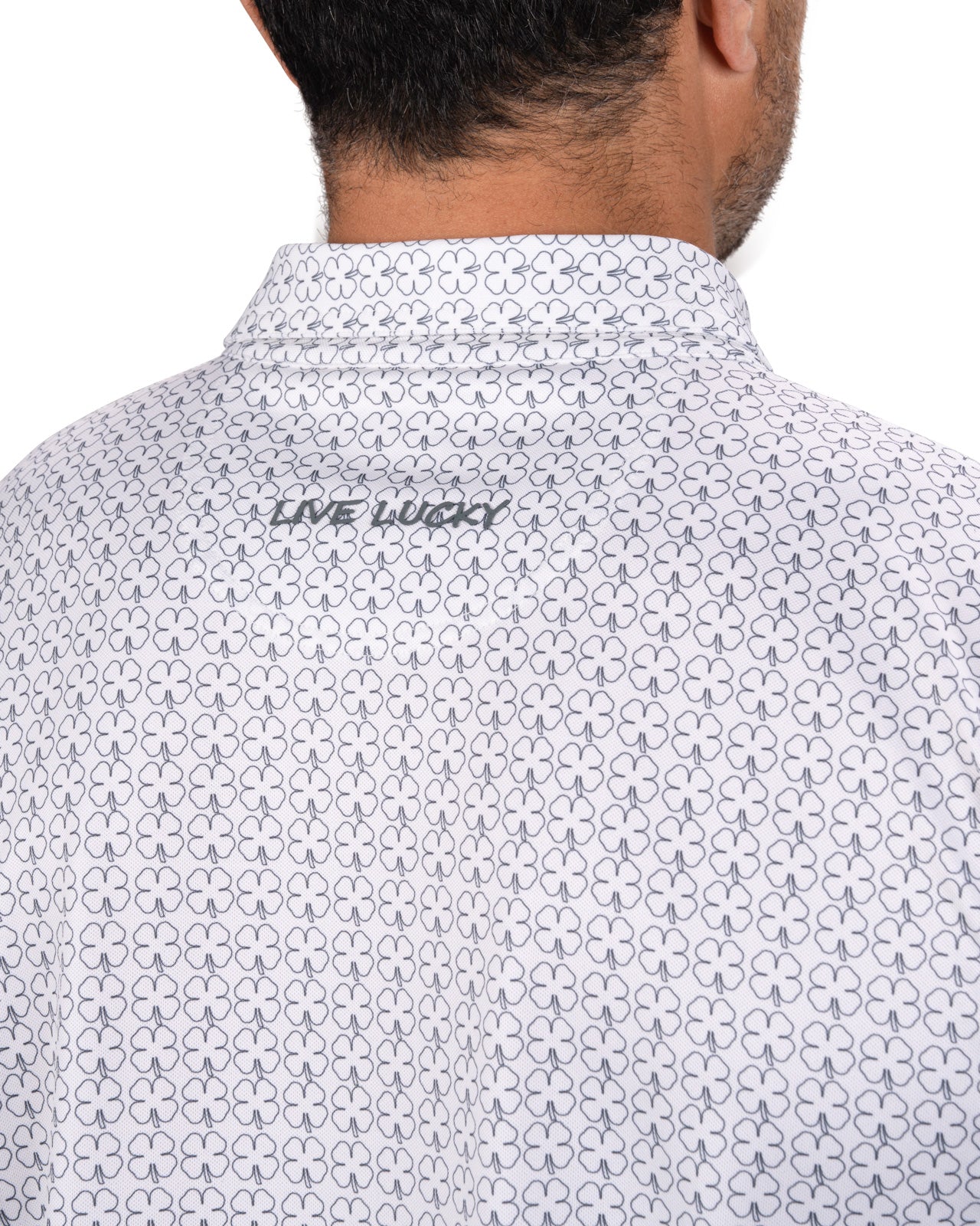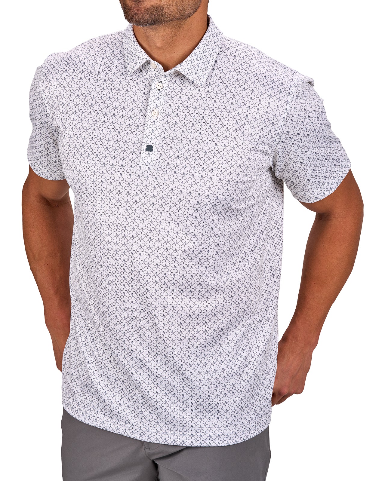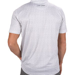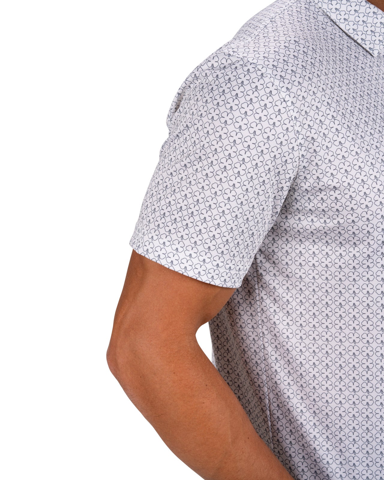 The Clover Crush Polo in vanilla delivers unbeatable style with an all-over subtle clover outline pattern on a white base. Its poly spandex blend and soft pique stretch fabric provides all-day comfort. Its breathability and high moisture transportation will keep you looking stylish while staying cool and dry for the entire day. Style this bold and versatile polo up or down on the course, in the office, or for your downtown style.