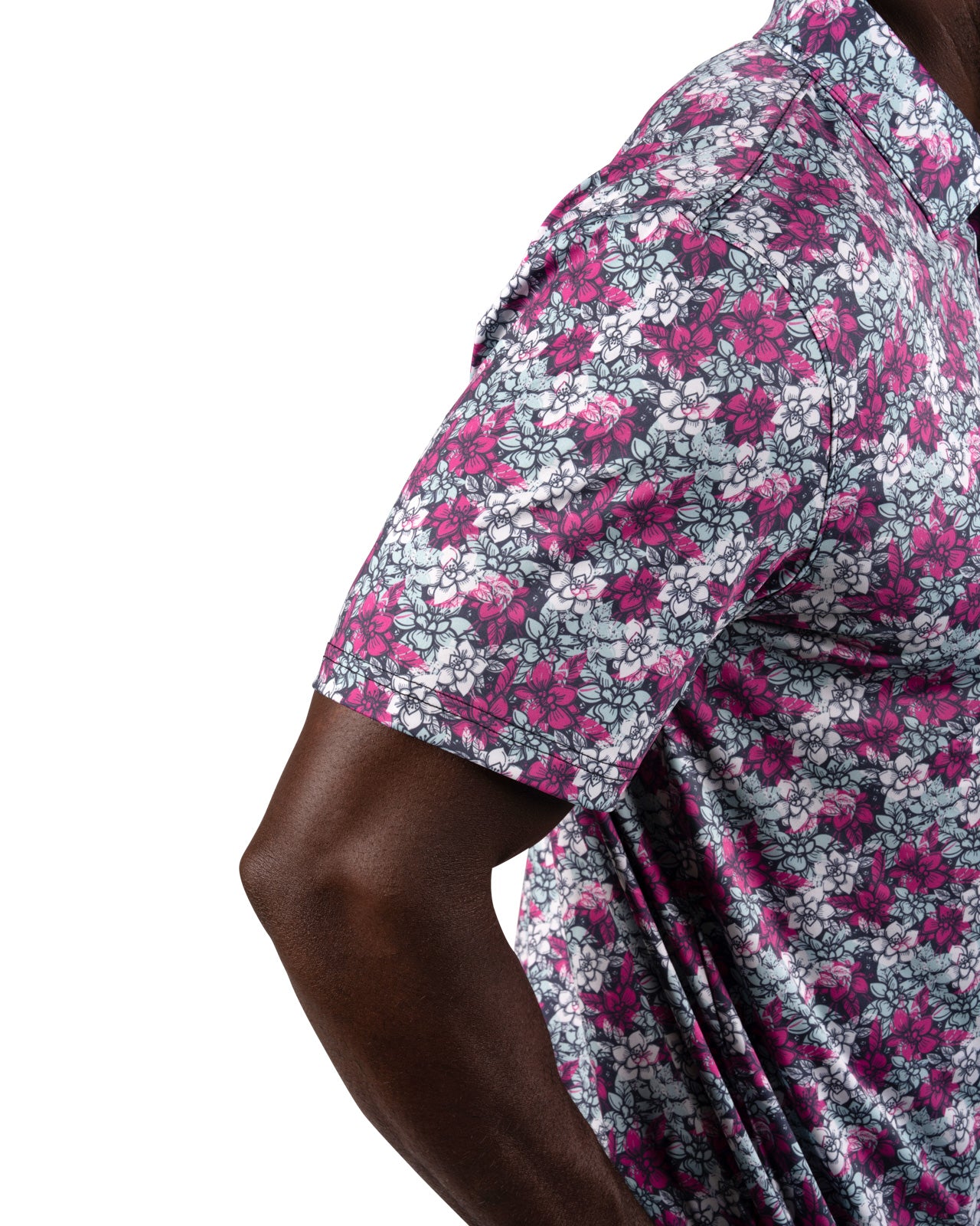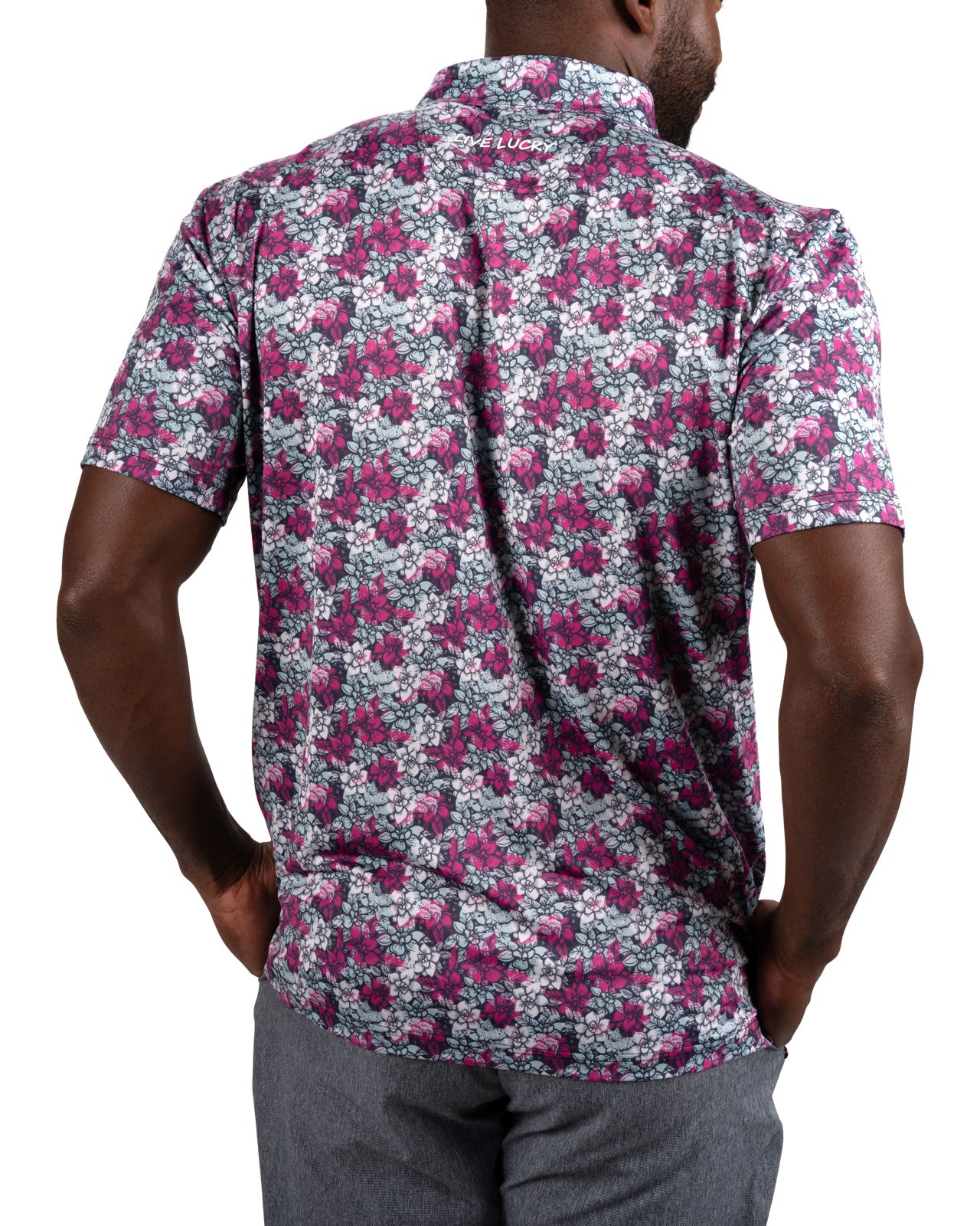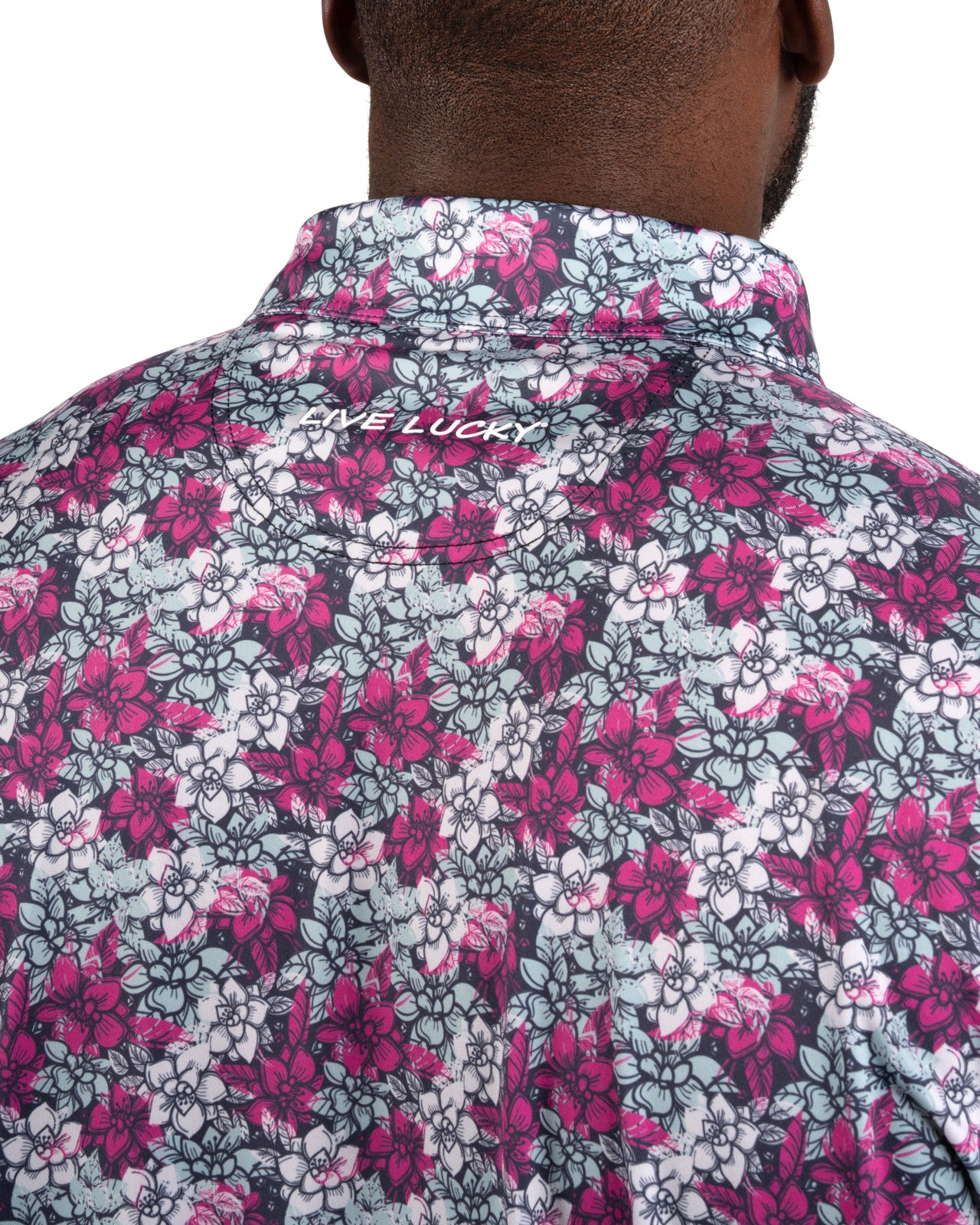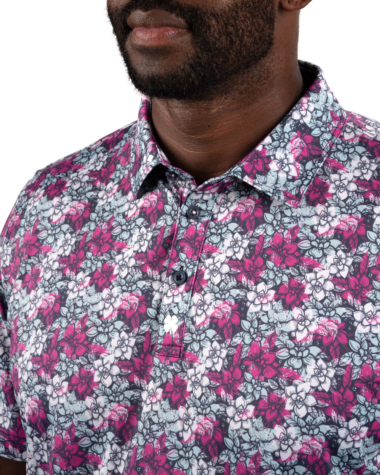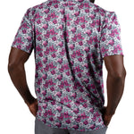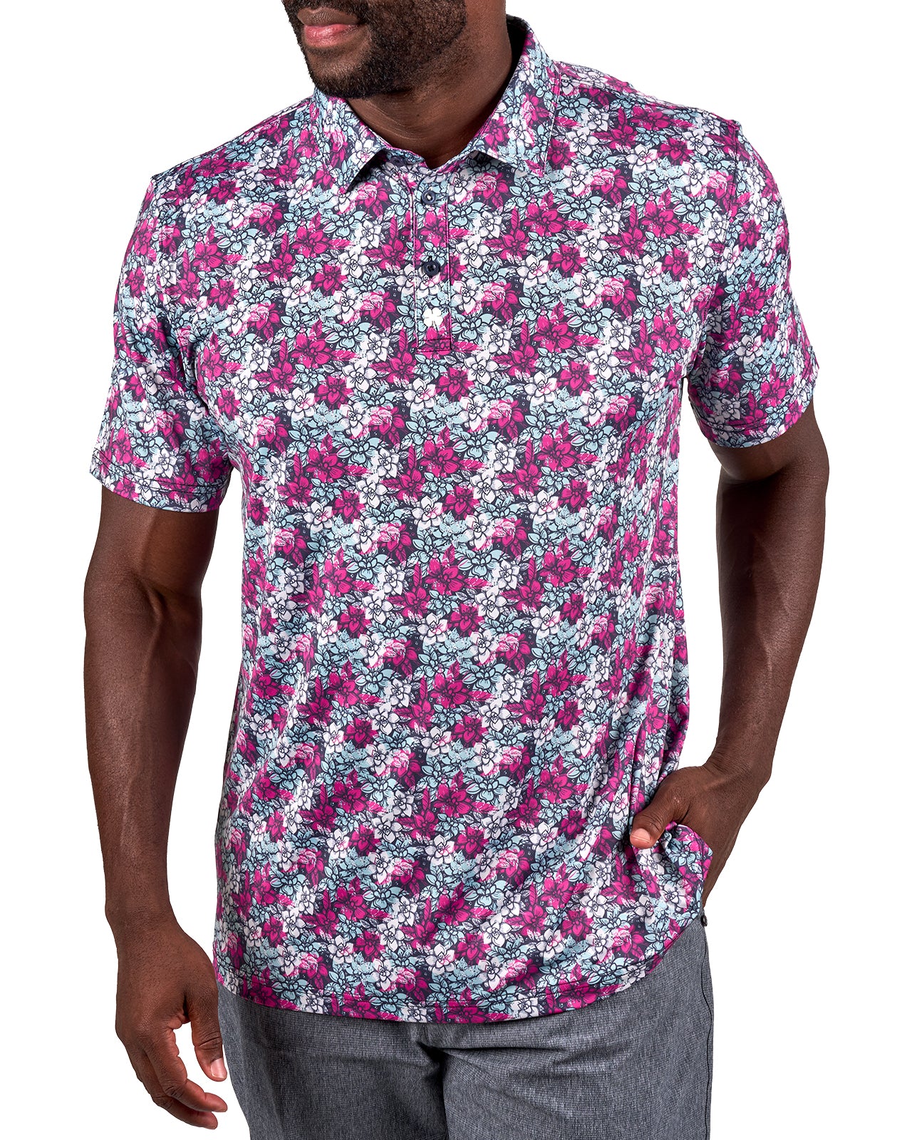 Stand out and bring energy to your game with the Flower Power Polo, featuring a striking floral pattern in electric rose, white, and light blue set against a black sand base. Its breathable, high-moisture transport and Chilled Luck technology keep you cool and dry through all movement whether it's on the golf course or out on the town. Built with shape-retention and low-shrinkage fabric, this men’s floral golf polo stays sharp and comfortable round after round.