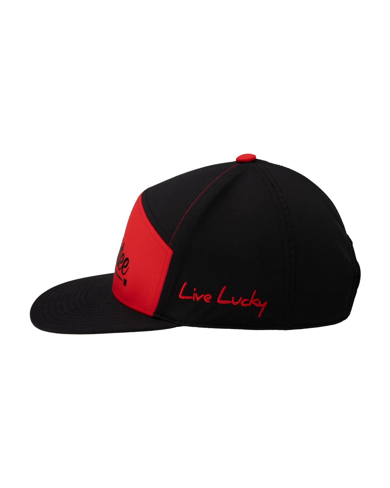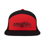 Our adjustable Naughtee hat is a fantastic addition to any wardrobe. In red and black with laser perforation, this flat-brim five-panel arch fitted hat will keep you stylish, on-trend, and looking like a pro. Perfect for the golf course or for a night on the town, this edgy hat is sure to add a little fun to any outfit.