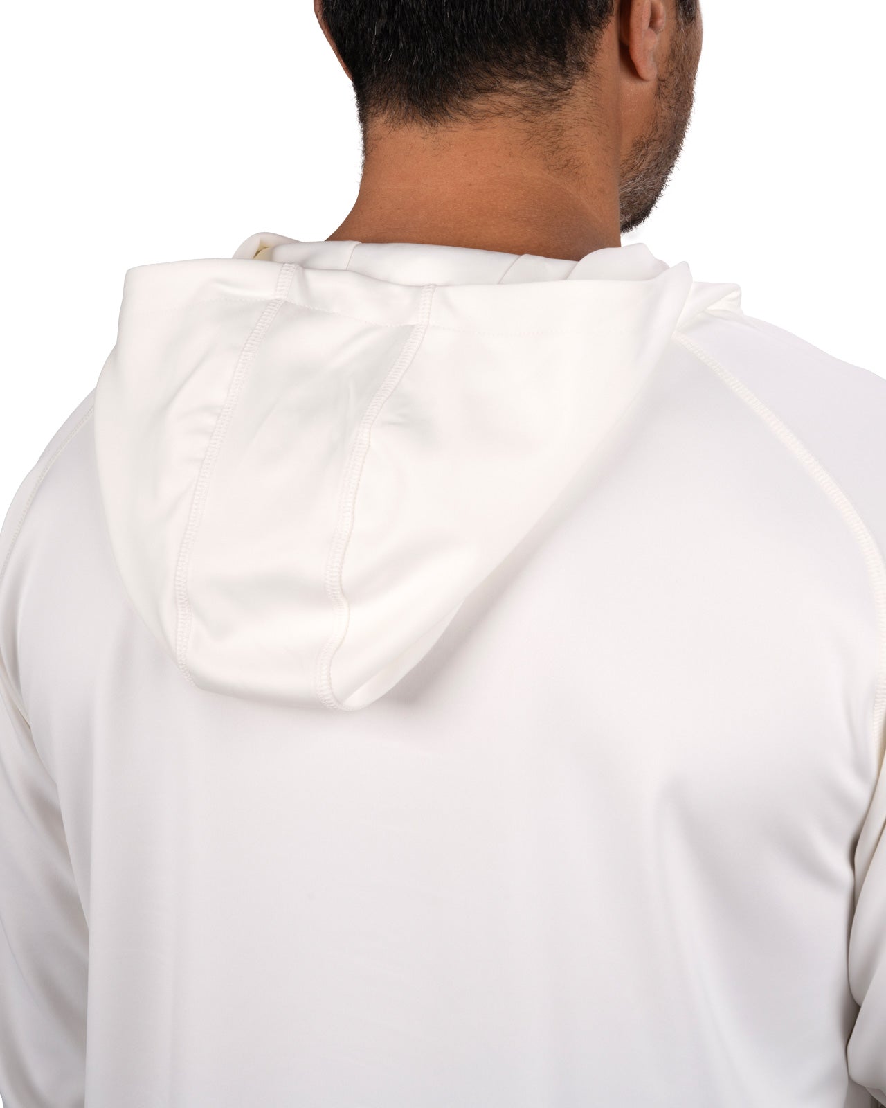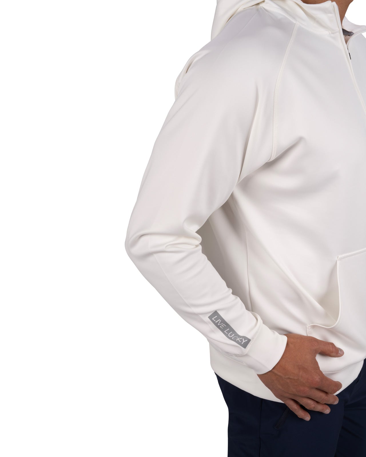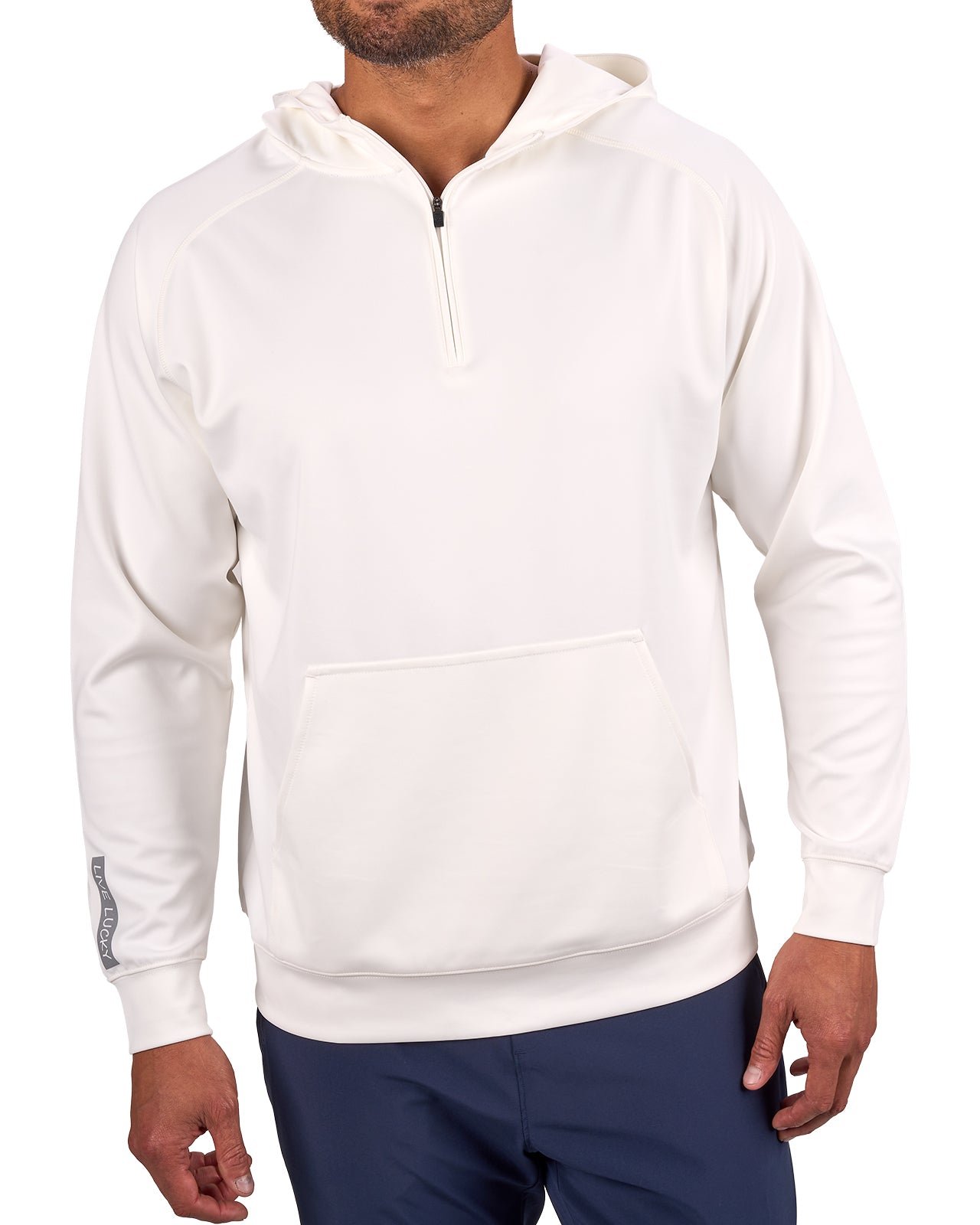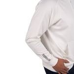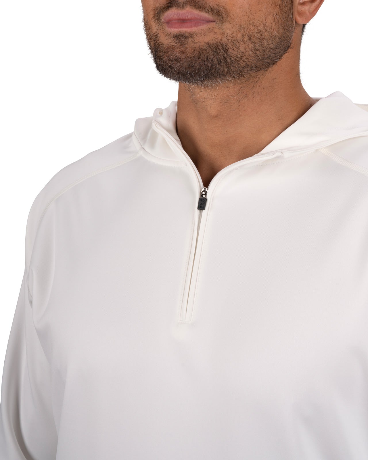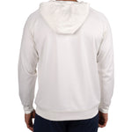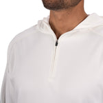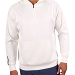 Introducing the Antony Hoodie in vanilla. This off-white quarter-zip hoodie, crafted from double knit stretch fabric, offers low shrinkage, moisture-wicking capabilities, shape retention, wrinkle-free ease, and breathability. Perfect for combining style and functionality.