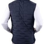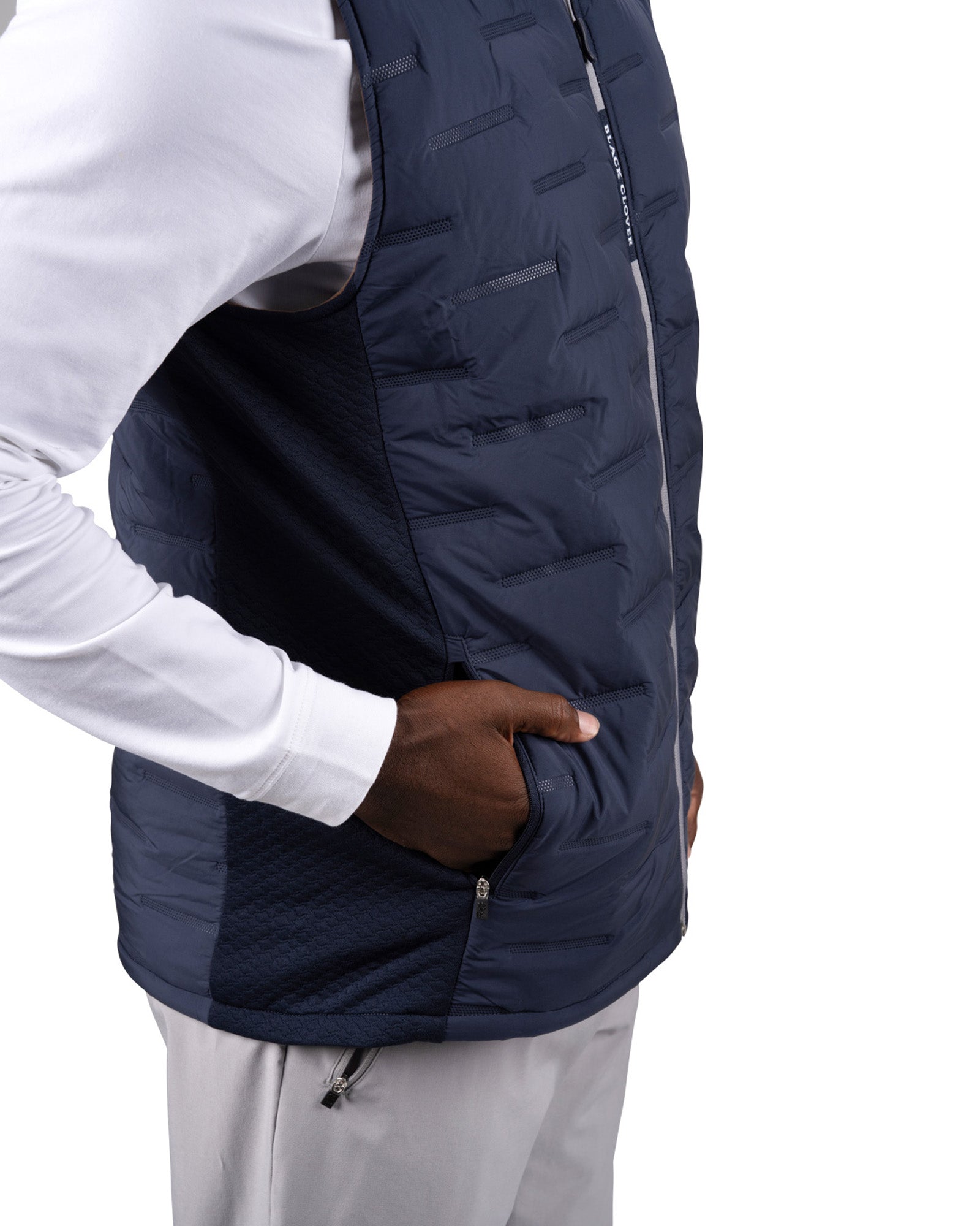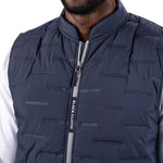The Fore Play Vest in navy blue is built for movement, made for comfort, and styled for performance on or off the course. Crafted with a 100% polyester quilted jacquard body and stretch-enhanced side panels, this men’s golf vest delivers breathable warmth without feeling bulky. Shape-retention technology and low-shrinkage fabric ensure it holds up over time, while high moisture-wicking capability keeps you dry under pressure. This versatile blue golf vest is the perfect lightweight layer for cool mornings, crisp swings, and every daily movement.
