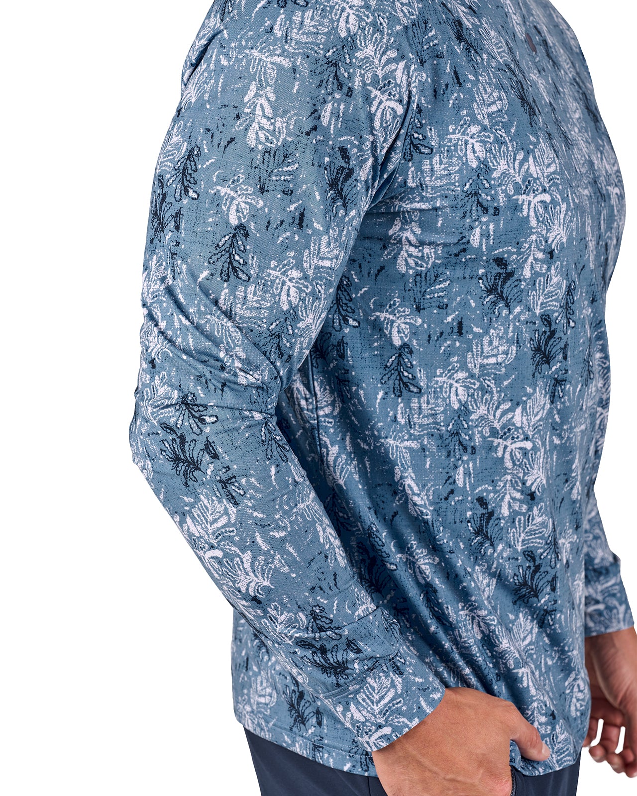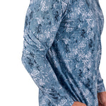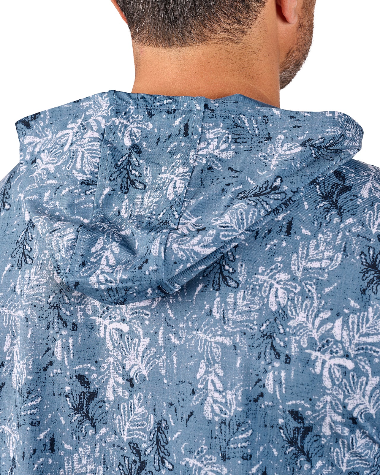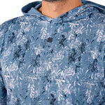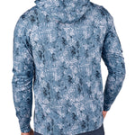 This lightweight Mi Amigo hoodie boasts a blue and navy print and is crafted from a breathable poly-spandex blend. Designed for all-day comfort, it features shape retention technology, is super soft, quick drying, wrinkle-free, and easy to care for—a perfect mix of style and function.