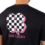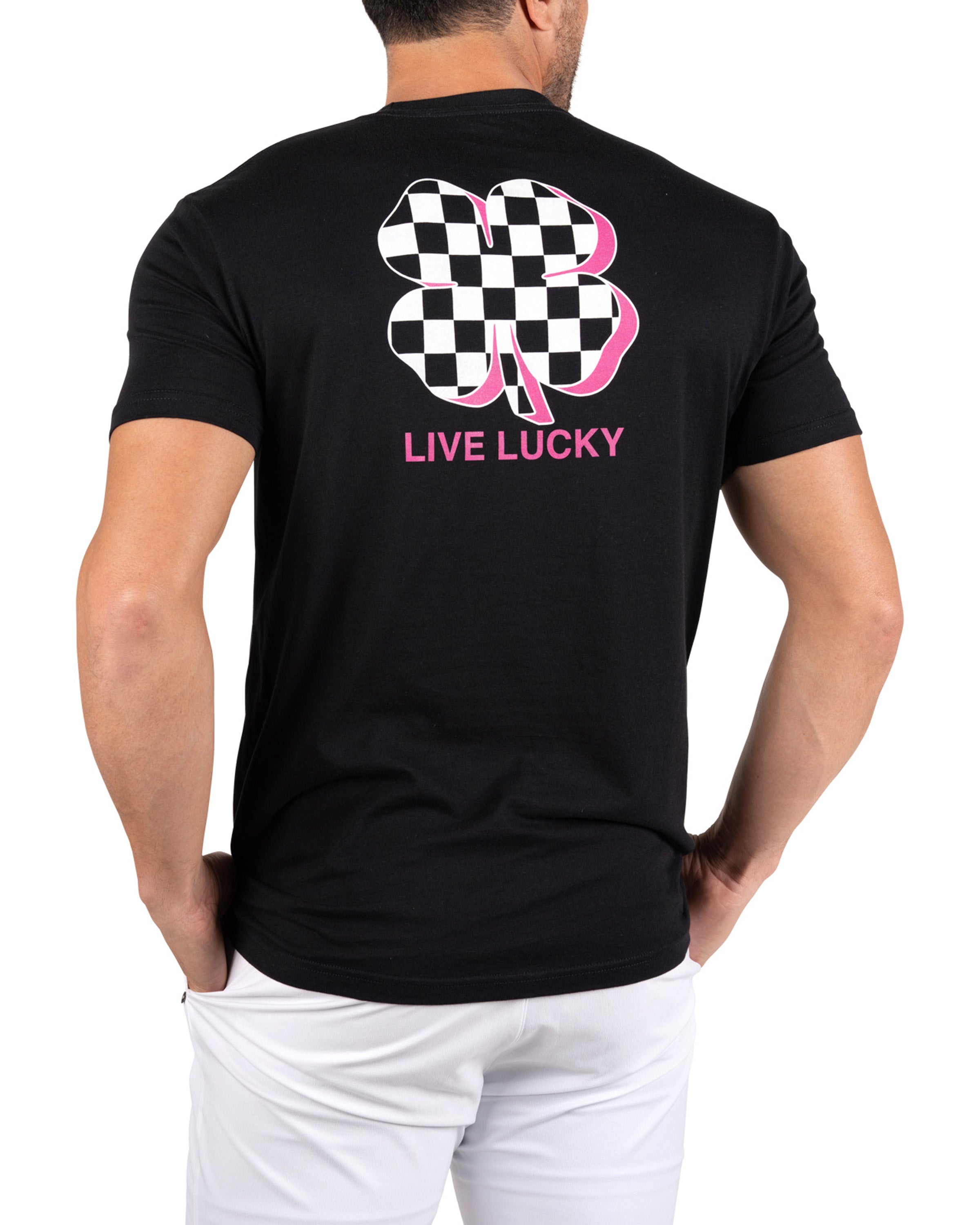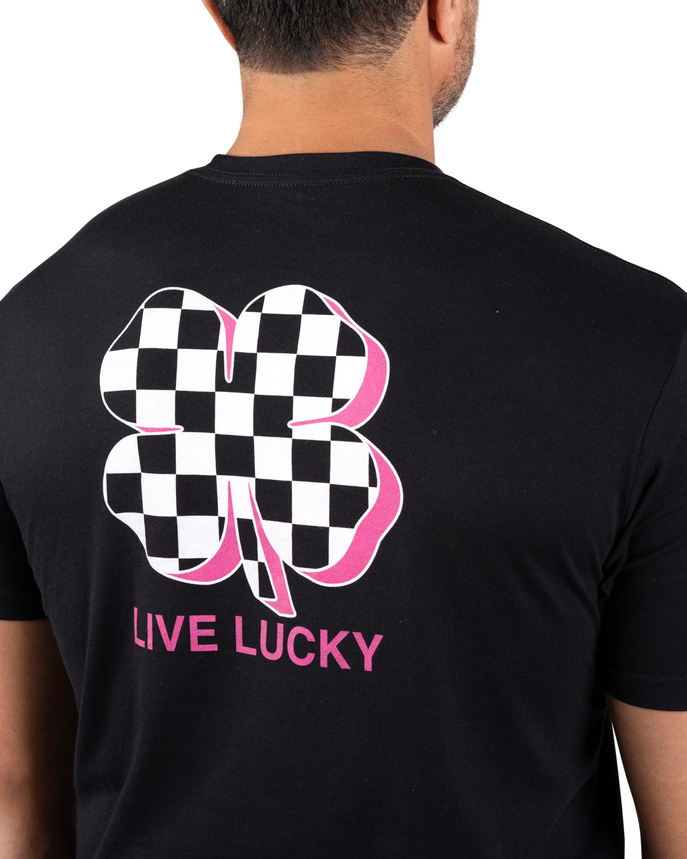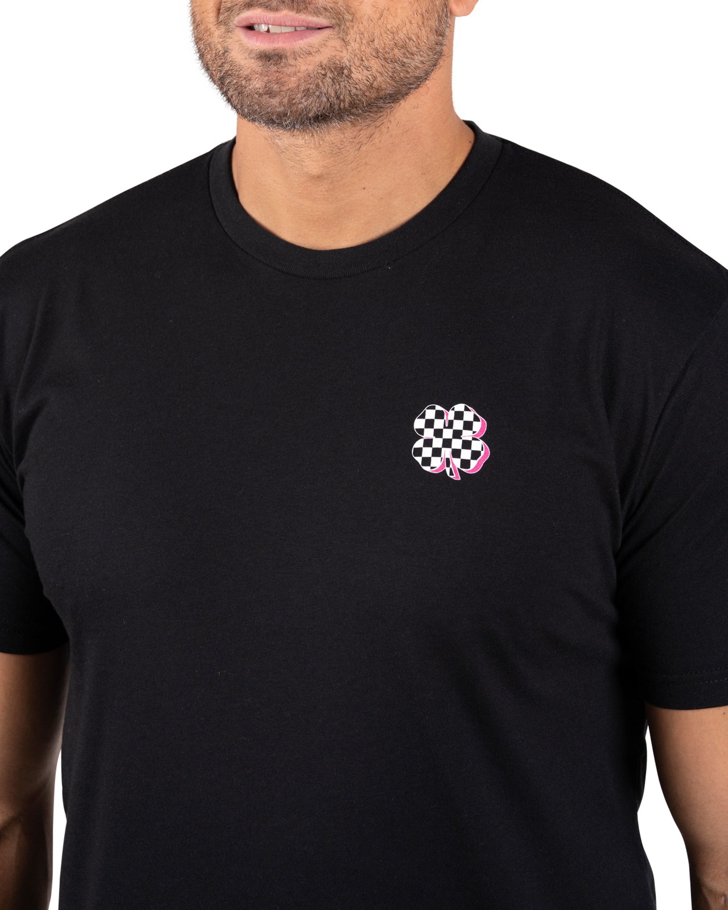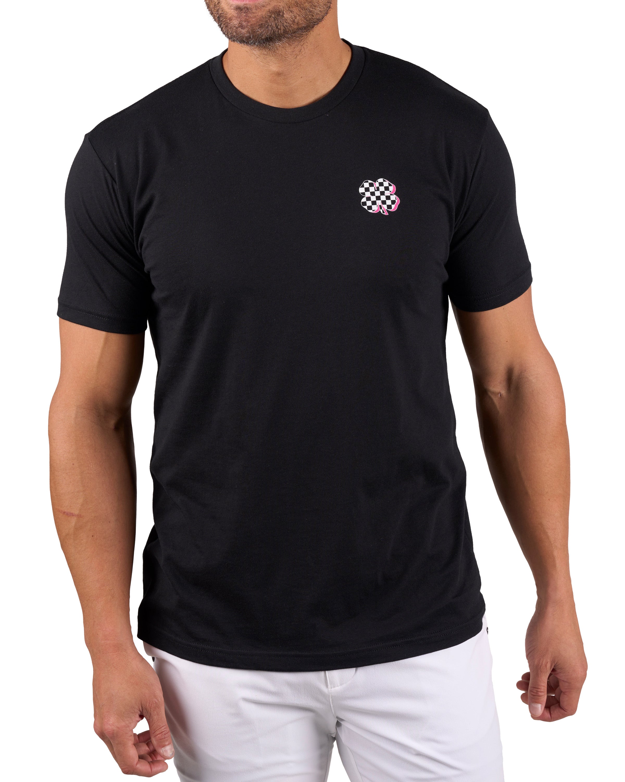 • Checkerboard clover design with neon pink details