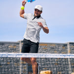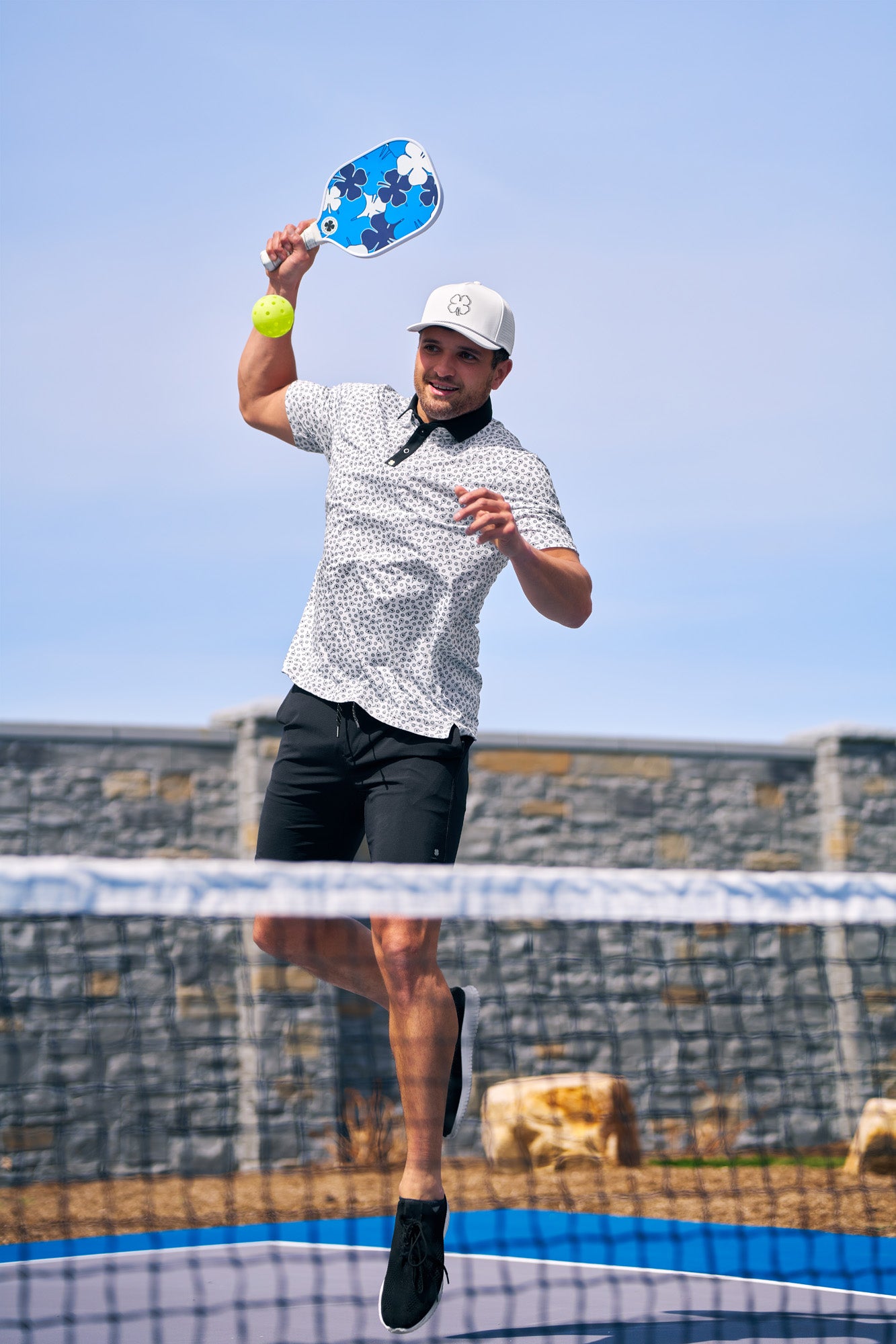 The Lucky Smash Polo brings athletics and performance together with an all-over pickleball paddle and ball pattern in black and white that celebrates the sport. Designed with a Poly Spandex blend and Syntrel stretch mesh, it moves effortlessly with every swing or serve. This pickleball patterned golf polo for men delivers comfort, durability, and a touch of fun on and off the court.