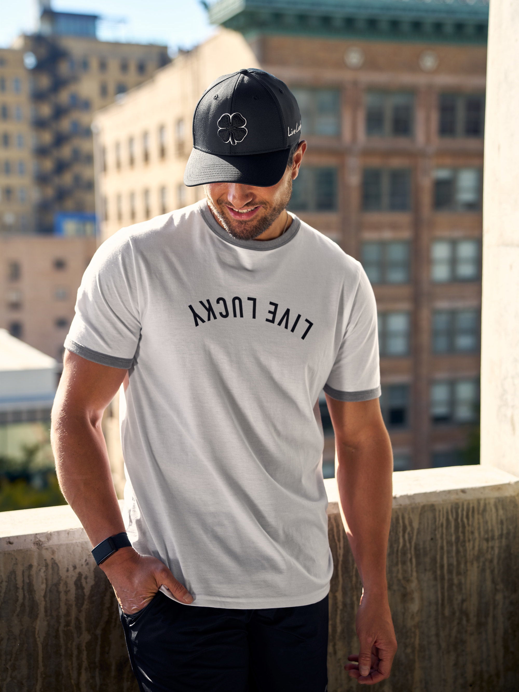 Stay stylish and comfortable in this men's white graphic t-shirt with sporty grey trim and a fun upside down Live Lucky print. Made from a soft cotton poly spandex blend, this tee stretches with every movement while offering moisture wicking comfort to keep you cool. Built in shape retention ensures it stays looking fresh wear after wear. Pair with a blazer or go for a casual look with this athletic tee, perfect for dressing up or down with ease.