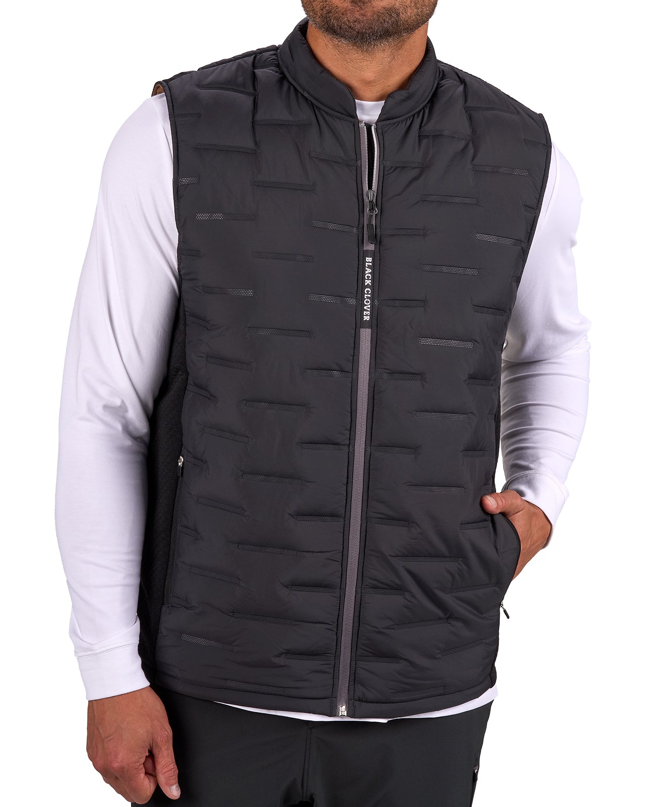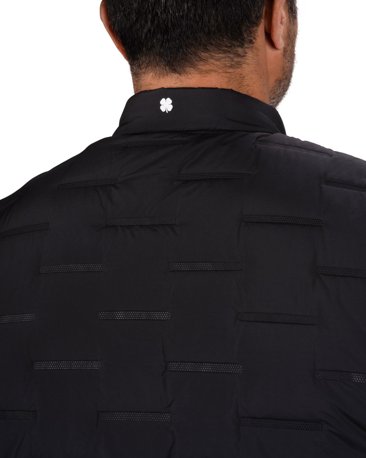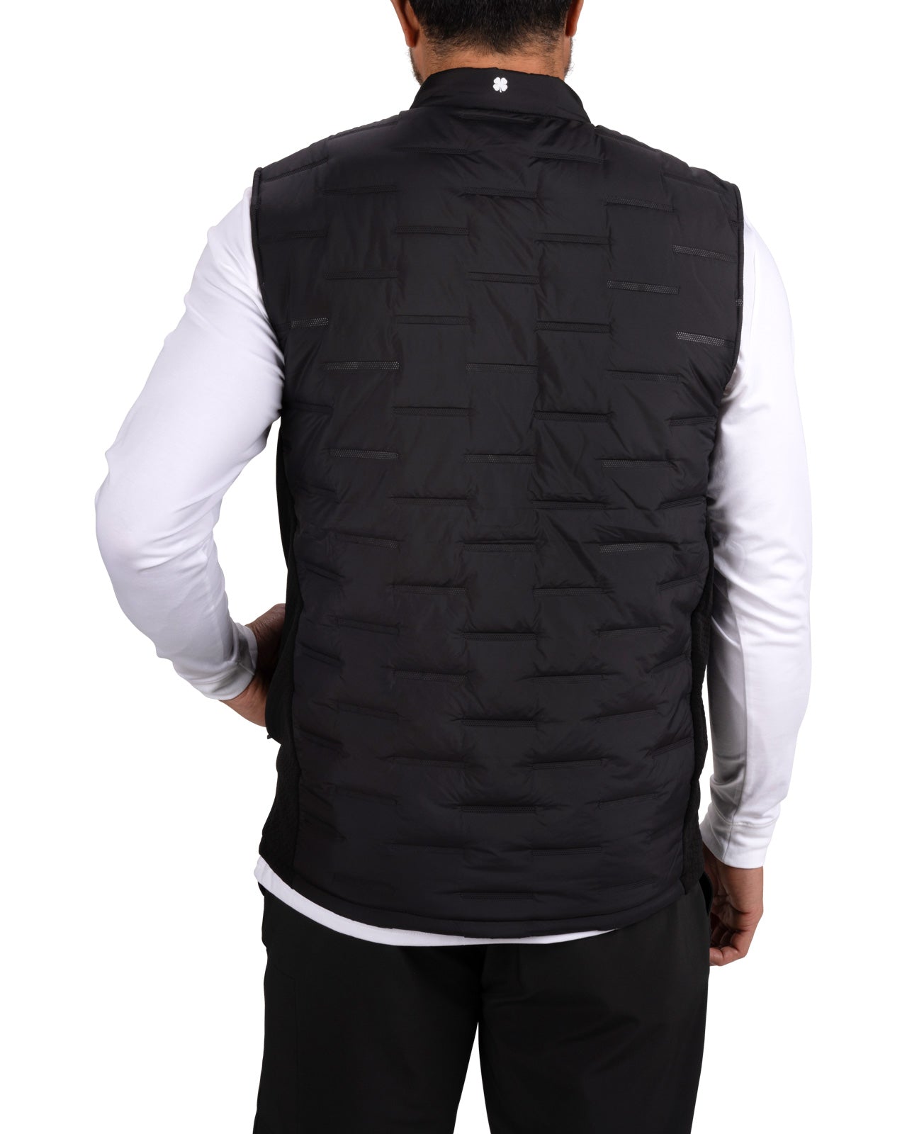 The Fore Play Vest in black is built for movement, made for comfort, and styled for performance on or off the course. Crafted with a 100% polyester quilted jacquard body and stretch-enhanced side panels, this men’s golf vest delivers breathable warmth without feeling bulky. Shape-retention technology and low-shrinkage fabric ensure it holds up over time, while high moisture-wicking capability keeps you dry under pressure. This versatile black golf vest is the perfect lightweight layer for cool mornings, crisp swings, and every daily movement.