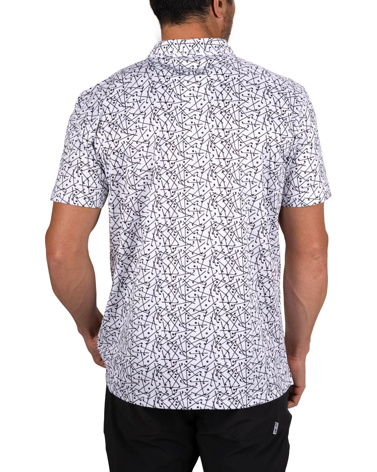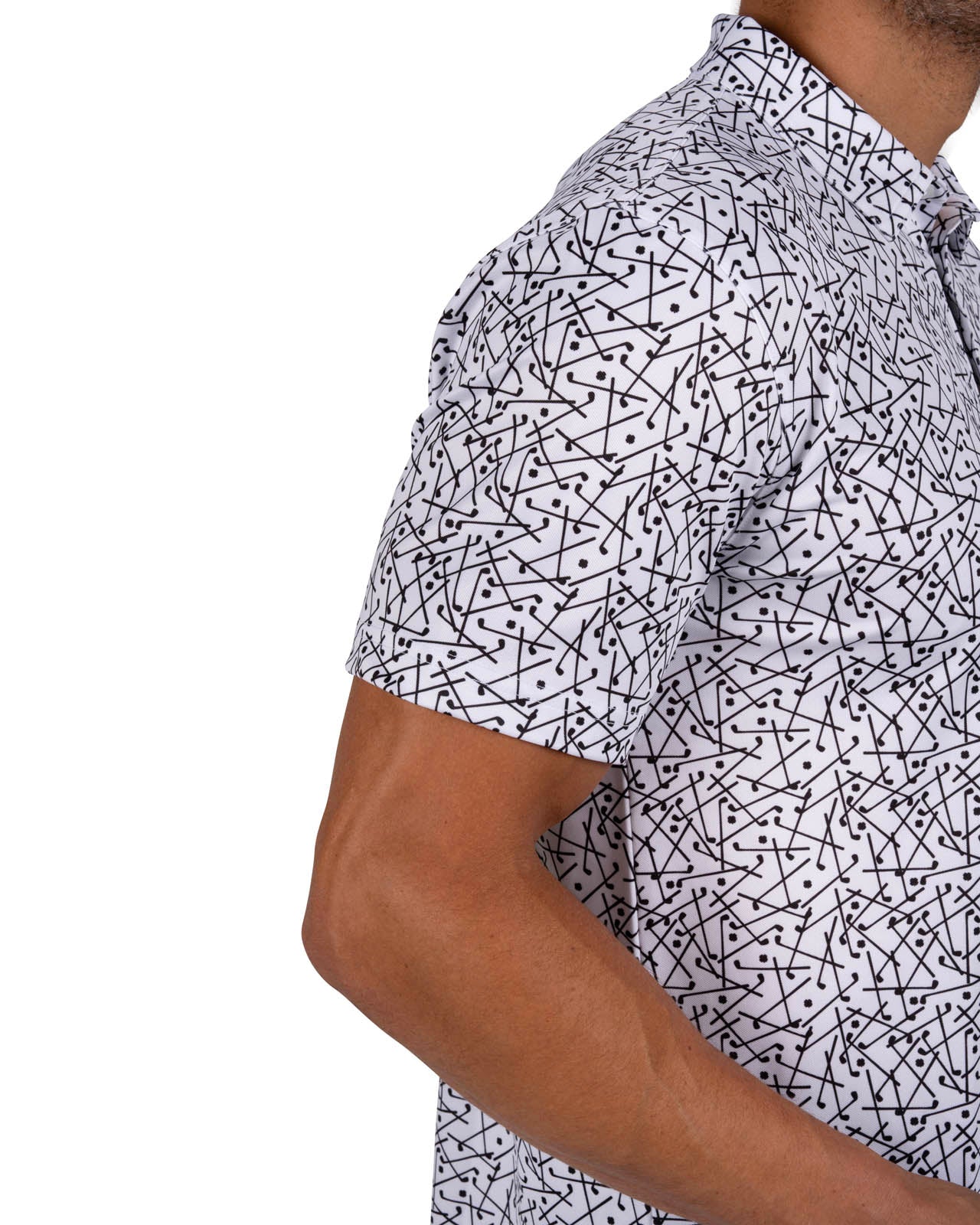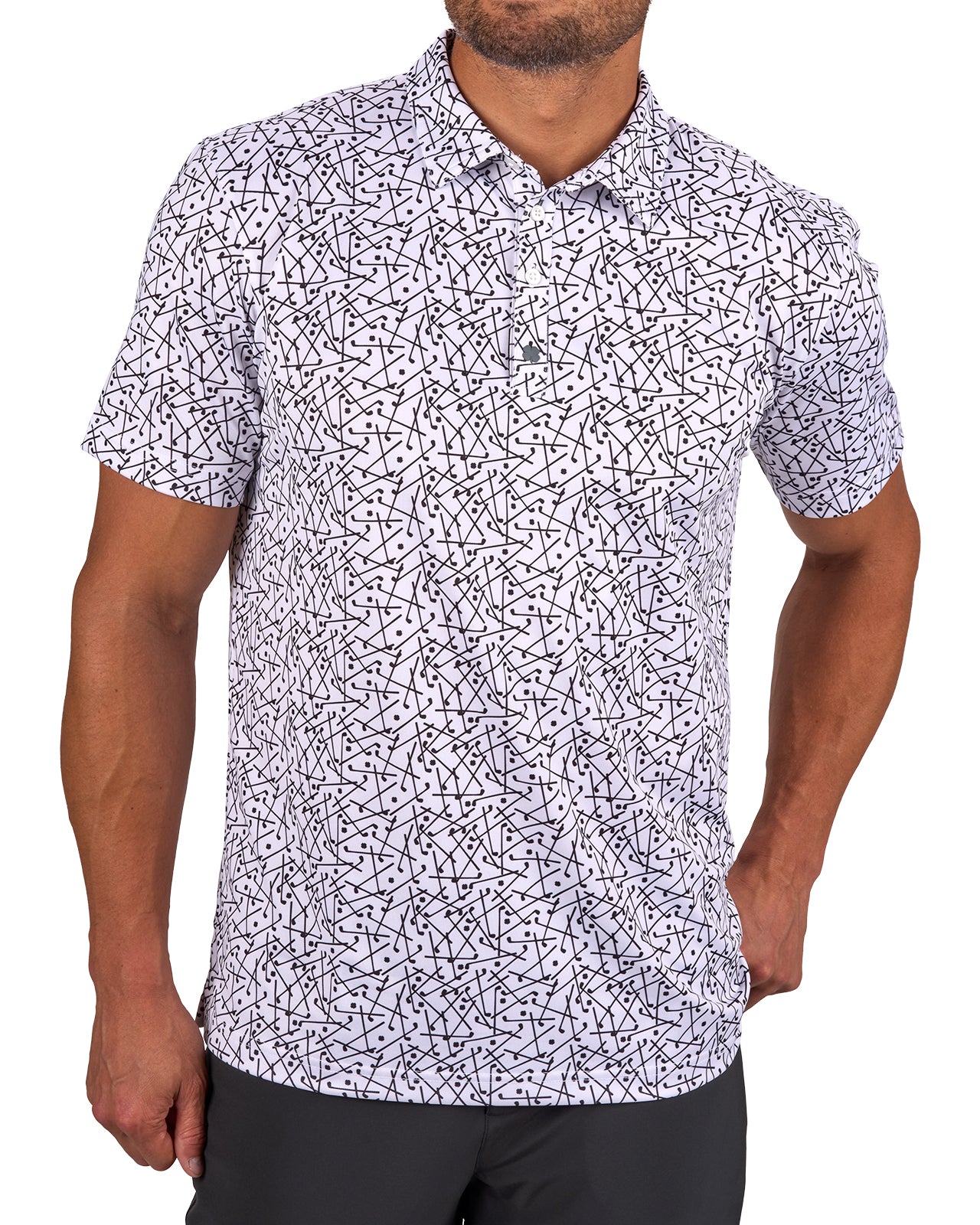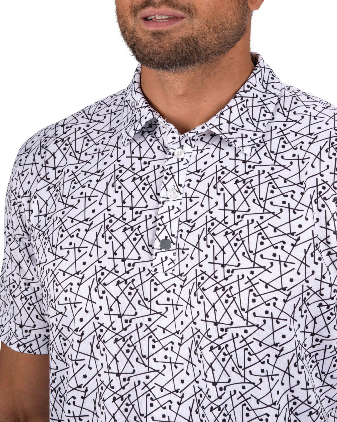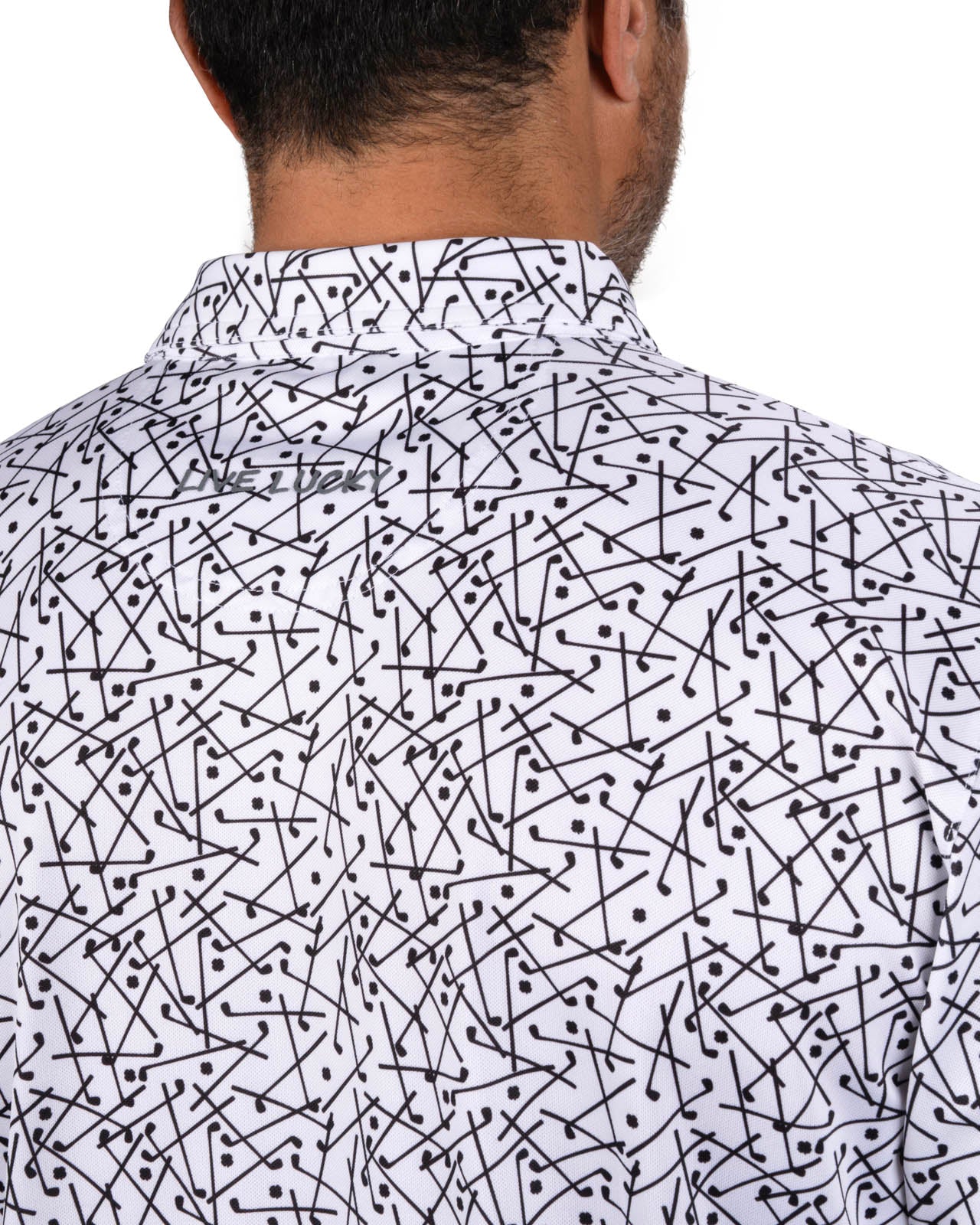 The Lucky Swing Polo combines personality with performance. Crafted from a Poly/Spandex stretch blend, it moves with you through every swing. Soft pique stretch fabric delivers the ultimate comfort, while its shape-retention technology keeps it sharp after washing. This polo brings both luck and style to every round in white with a subtle black golf club pattern.