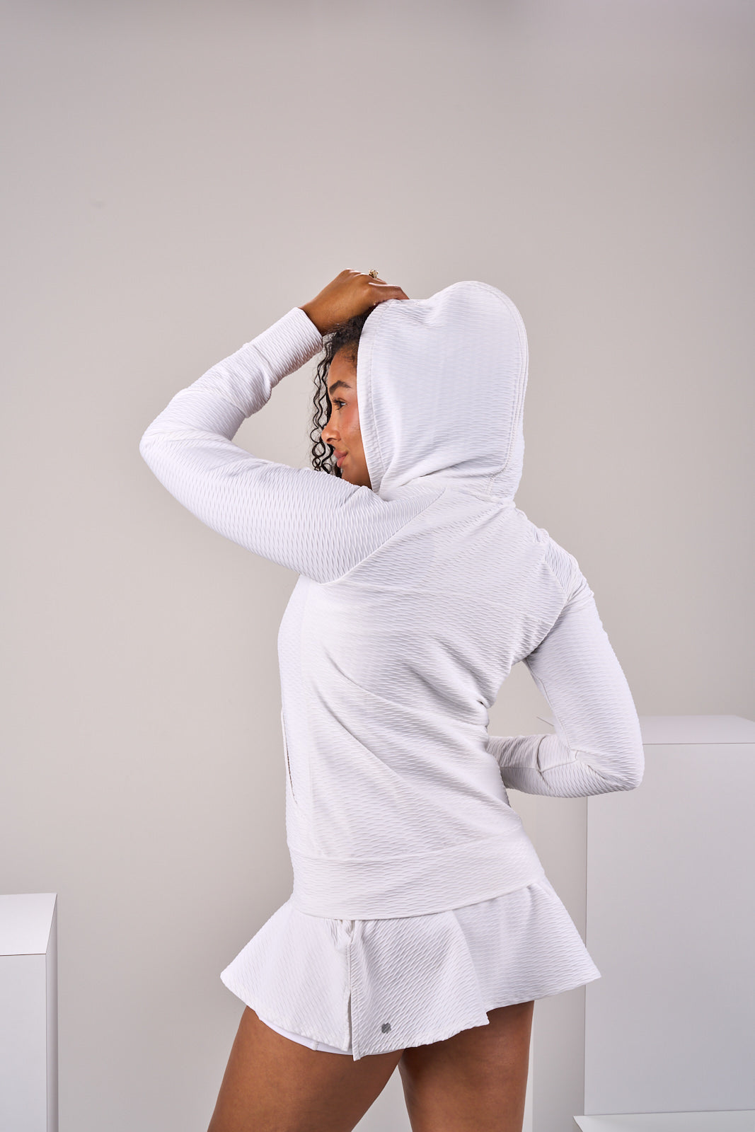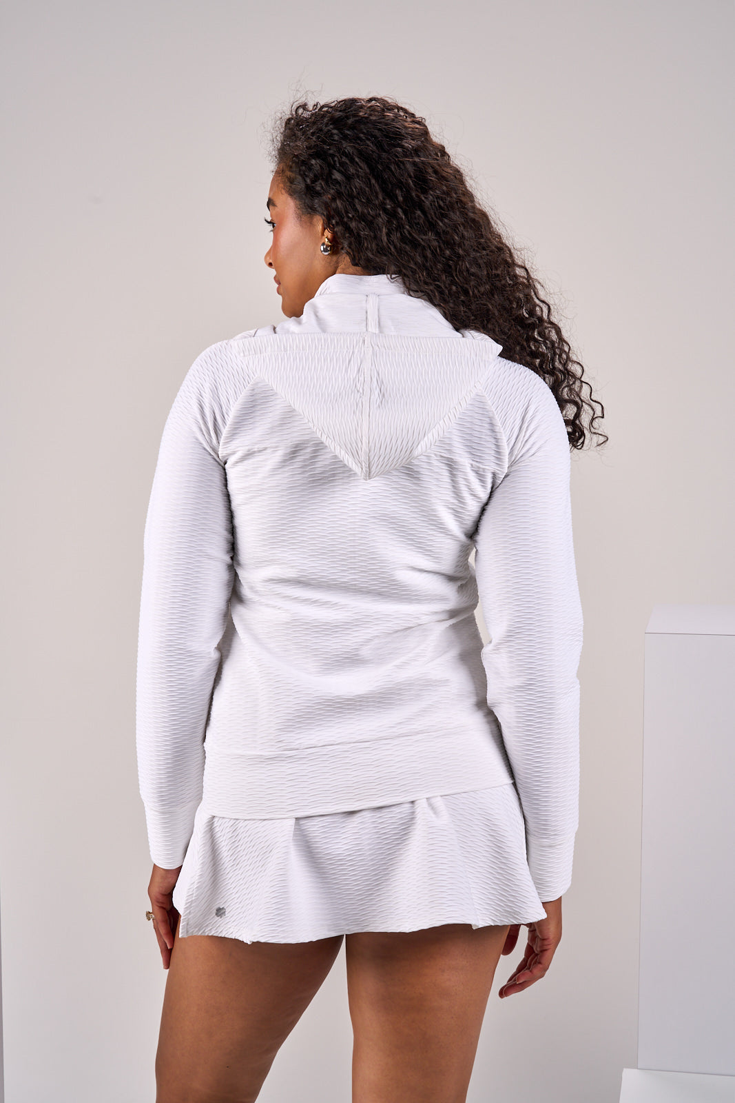 The Nala Jacket is the perfect blend of sporty function and sleek style, built to take you from warm-ups to nights out with ease. Designed with a soft nylon spandex Syntrel blend, this lightweight women’s white jacket features jacquard texture stretch for added visual interest and all-day comfort. Adjustable drawstrings and a full zipper let you control the fit and coverage, while shape-retention and low-shrinkage fabric ensure it stays fresh wear after wear. Ultra soft and easy to layer, it’s the ideal performance jacket for golf, travel, or everyday movement.