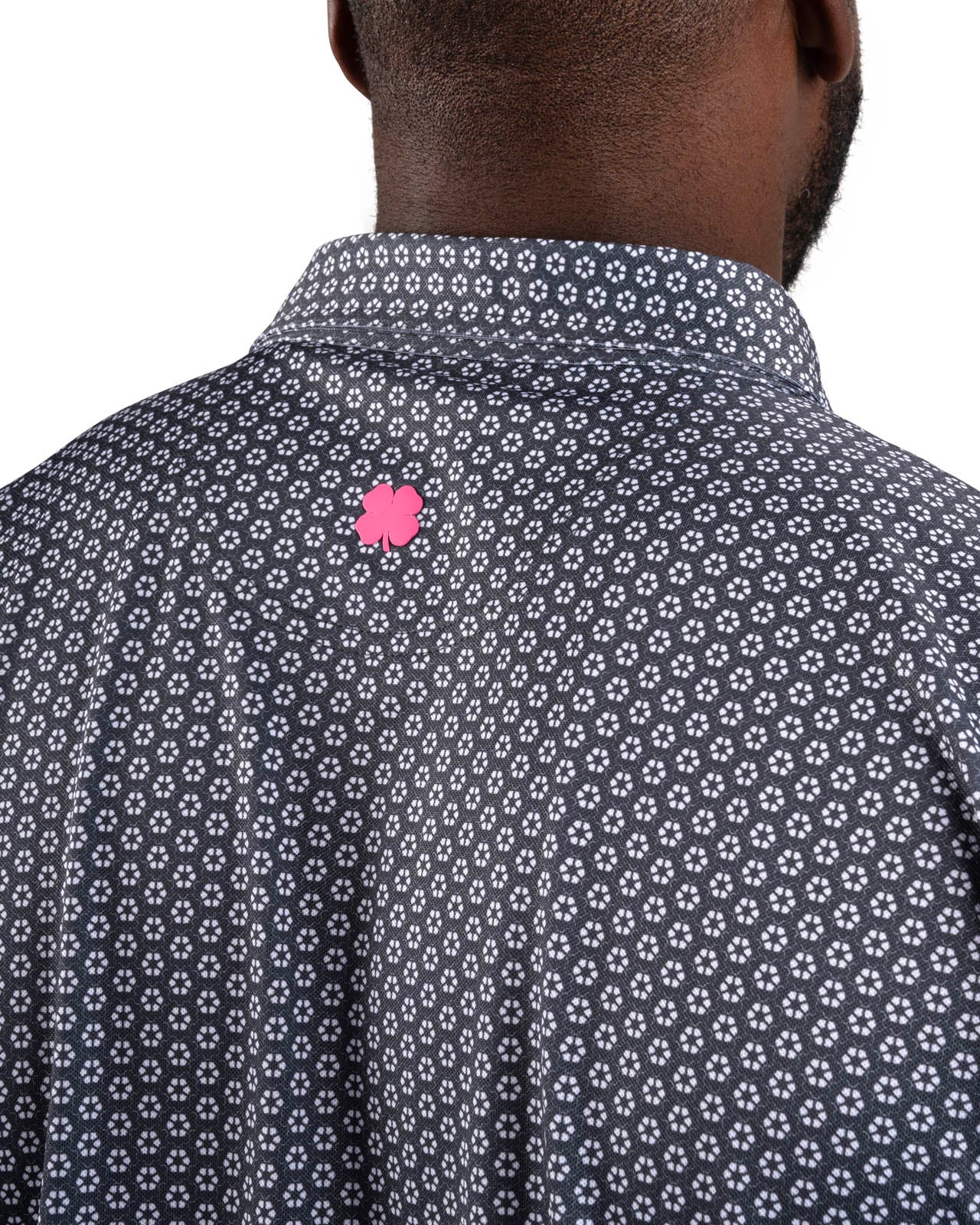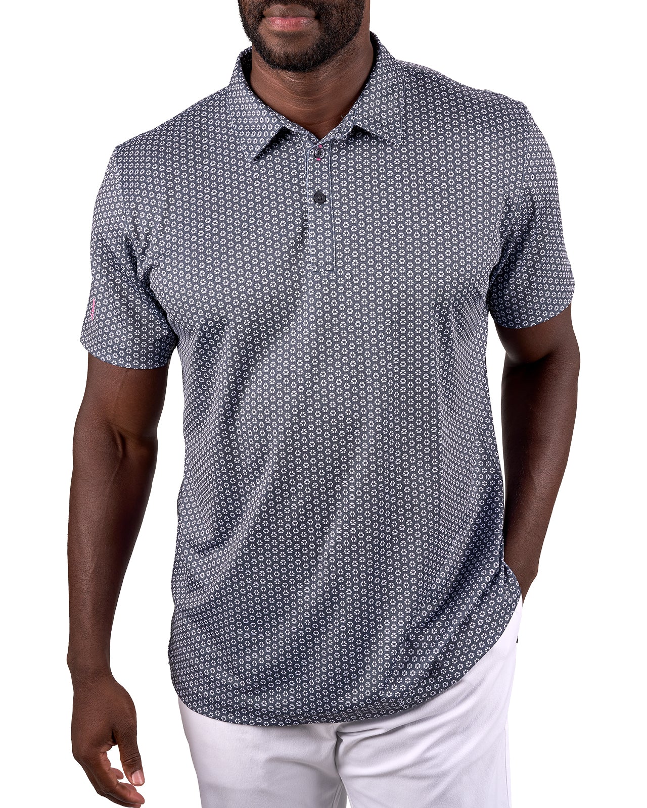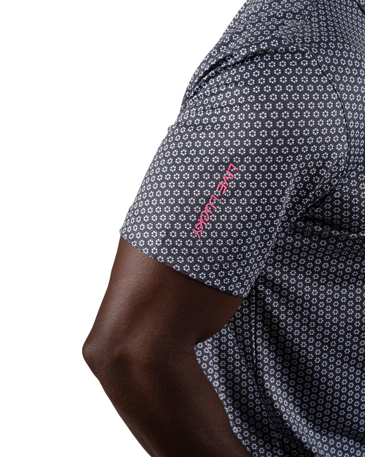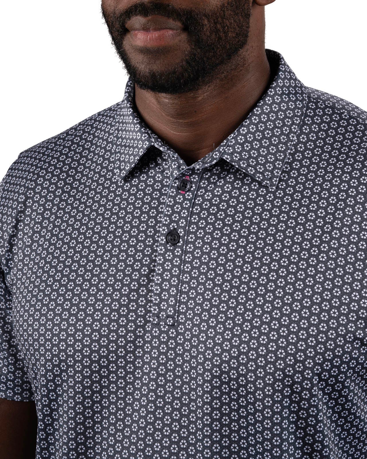 The Radiance Polo in Black Sand is a vibrant dark grey polo with a white floral design made to turn heads. It feels as good as it looks and moves with you through every round with its flexible Poly Spandex blend with soft pique stretch. The fabric is designed to keep its shape and resist shrinking so your style stays sharp season after season. Bold, comfortable, and exclusive, the Radiance Polo brings fresh energy to your golf and lifestyle wardrobe.