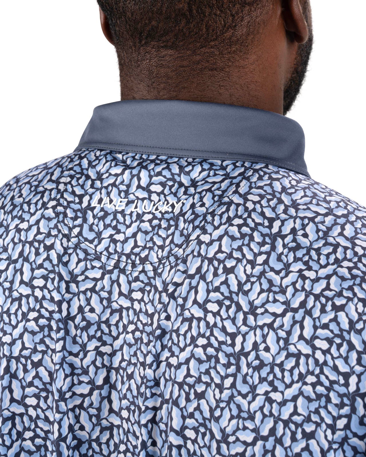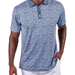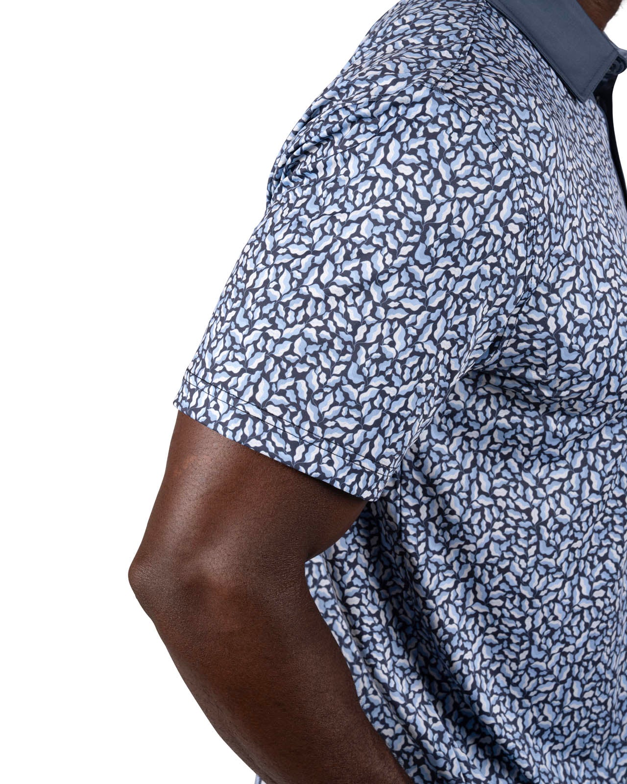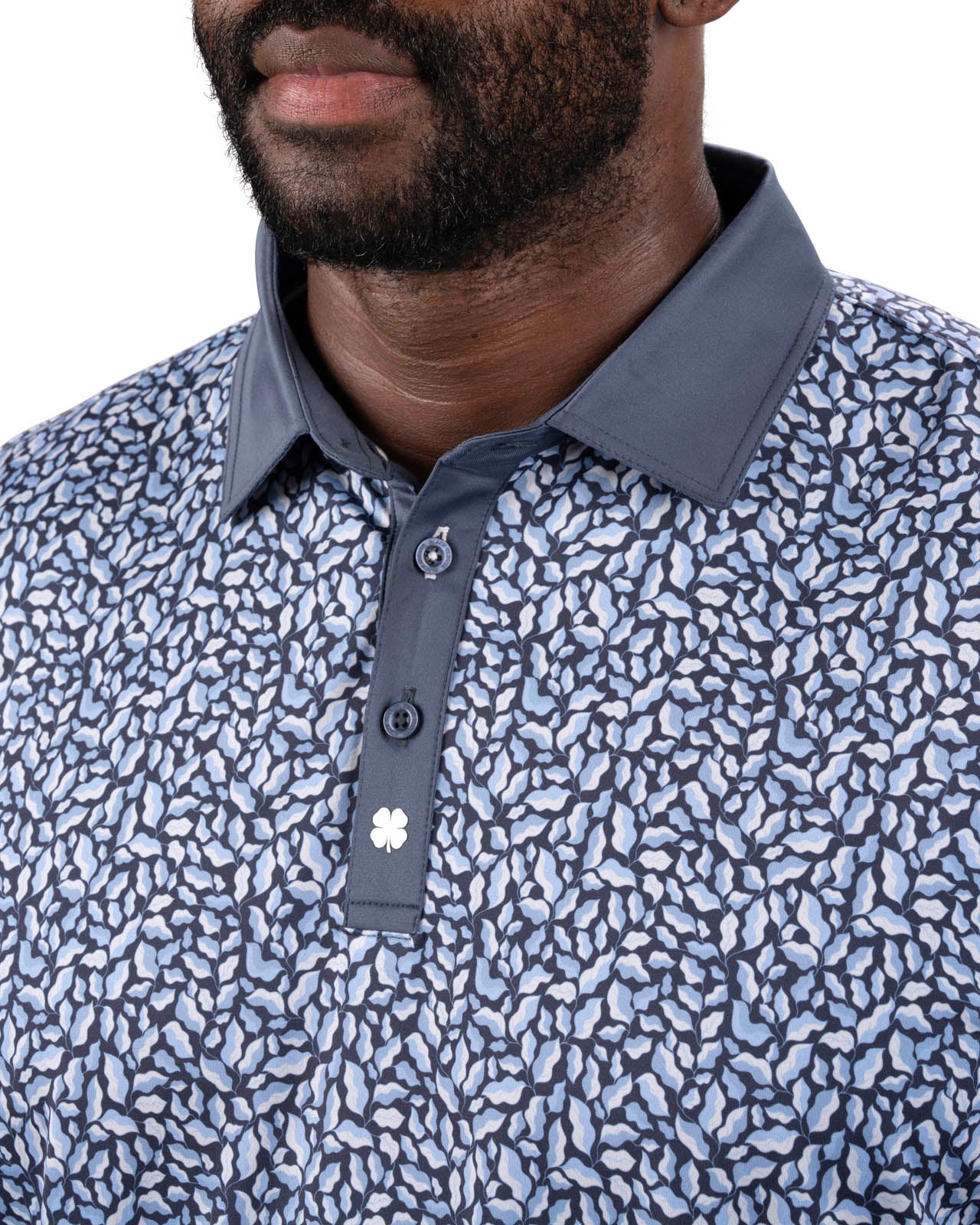 Our Spring Fortunes polo combines sleek style and comfort. Featuring a moody blue floral pattern on the body with a dark grey collar and placket, it’s crafted from super-soft fabric with a framed white clover icon. Designed for performance, it offers breathability, wrinkle-free ease, low shrinkage, and shape retention technology.