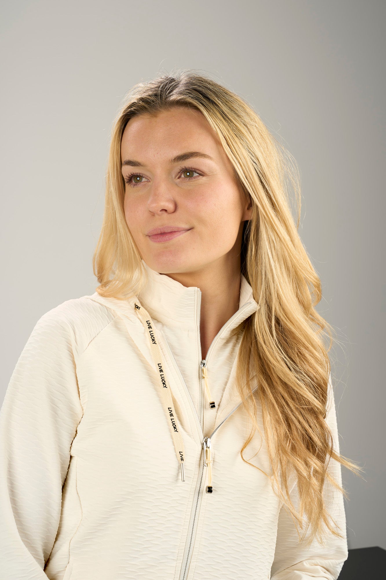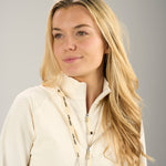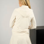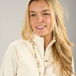 The Nala Jacket in vanilla is the perfect blend of sporty function and sleek style, built to take you from warm-ups to nights out with ease. Designed with a soft nylon spandex Syntrel blend, this lightweight women’s cream jacket features jacquard texture stretch for added visual interest and all-day comfort. Adjustable drawstrings and a full zipper let you control the fit and coverage, while shape-retention and low-shrinkage fabric ensure it stays fresh wear after wear. Ultra soft and easy to layer, it’s the ideal performance jacket for golf, travel, or everyday movement.