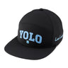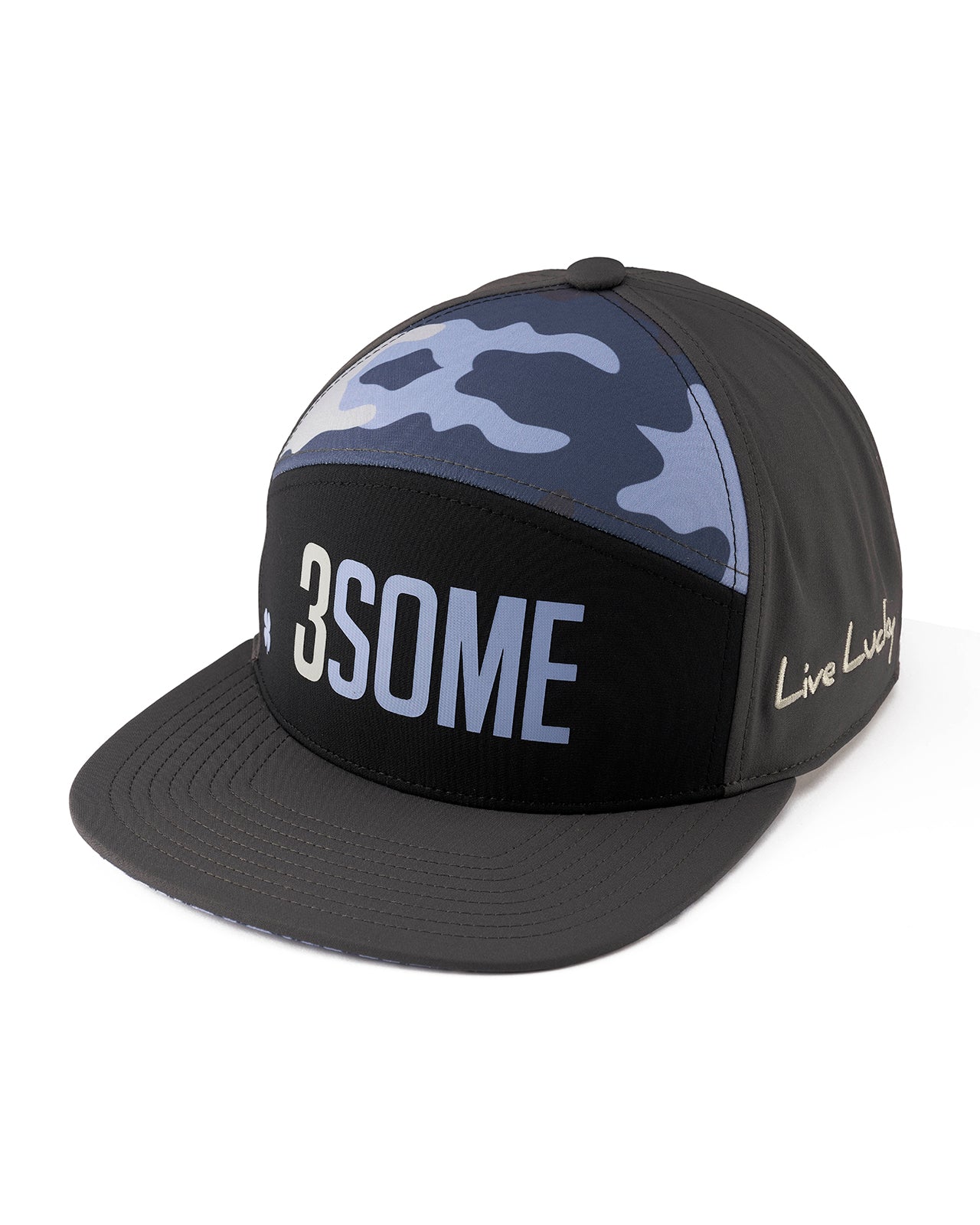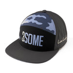 Our adjustable 3Some hat is a fantastic addition to any wardrobe. In black with navy camo accents and laser perforation, this flat-brim five-panel arch fitted hat will keep you stylish, on-trend, and looking like a pro. Perfect for the golf course or for a night on the town, this edgy hat is sure to add a little fun to any outfit.