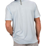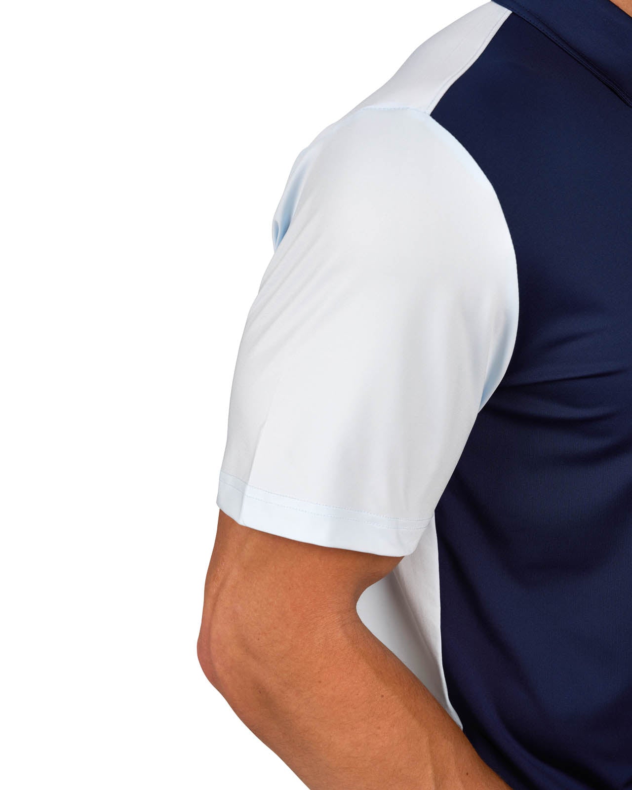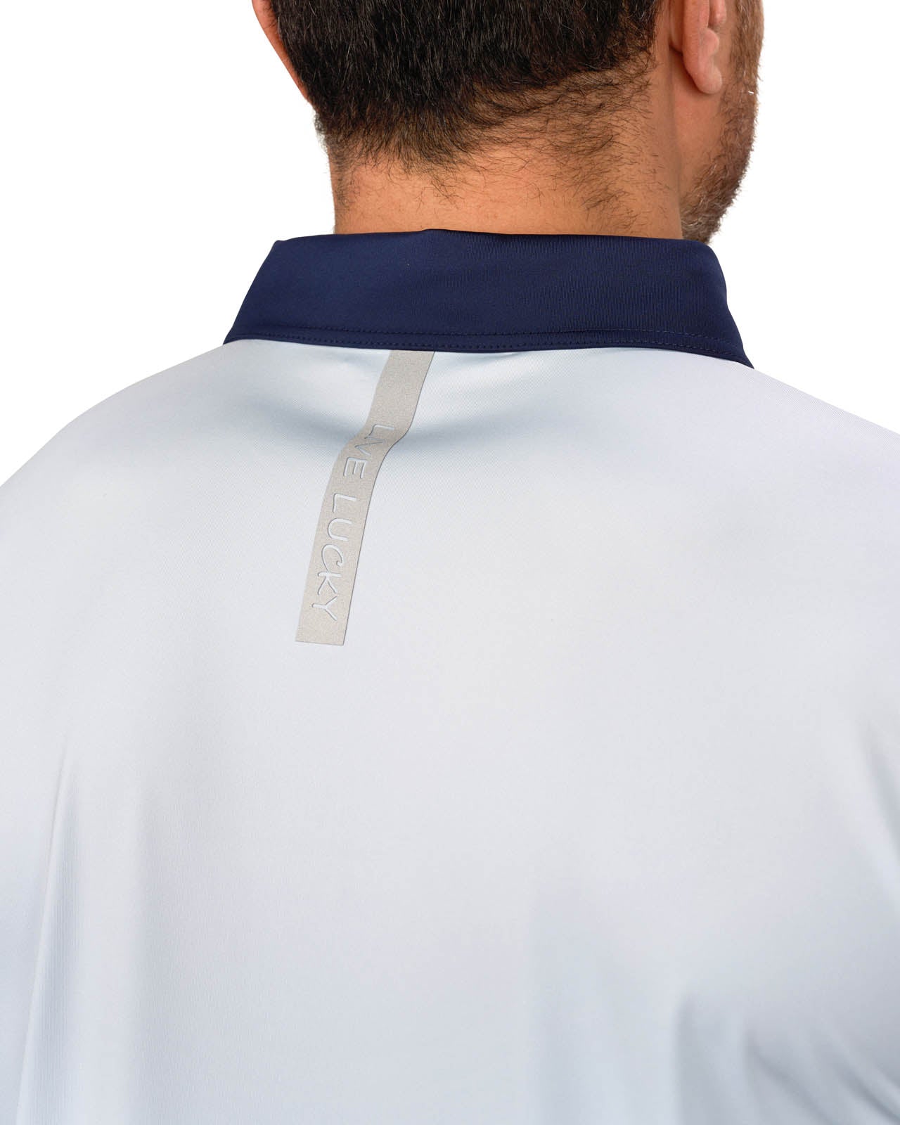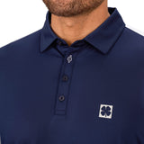 Our two-toned Archie Polo combines bold style with performance. Featuring a navy front, ice blue back, iconic clover on the front, and "Live Lucky" on the back, it's crafted from a poly spandex blend with shape retention, a wrinkle-free finish, and 4-way stretch. A perfect blend of comfort and style for any occasion.