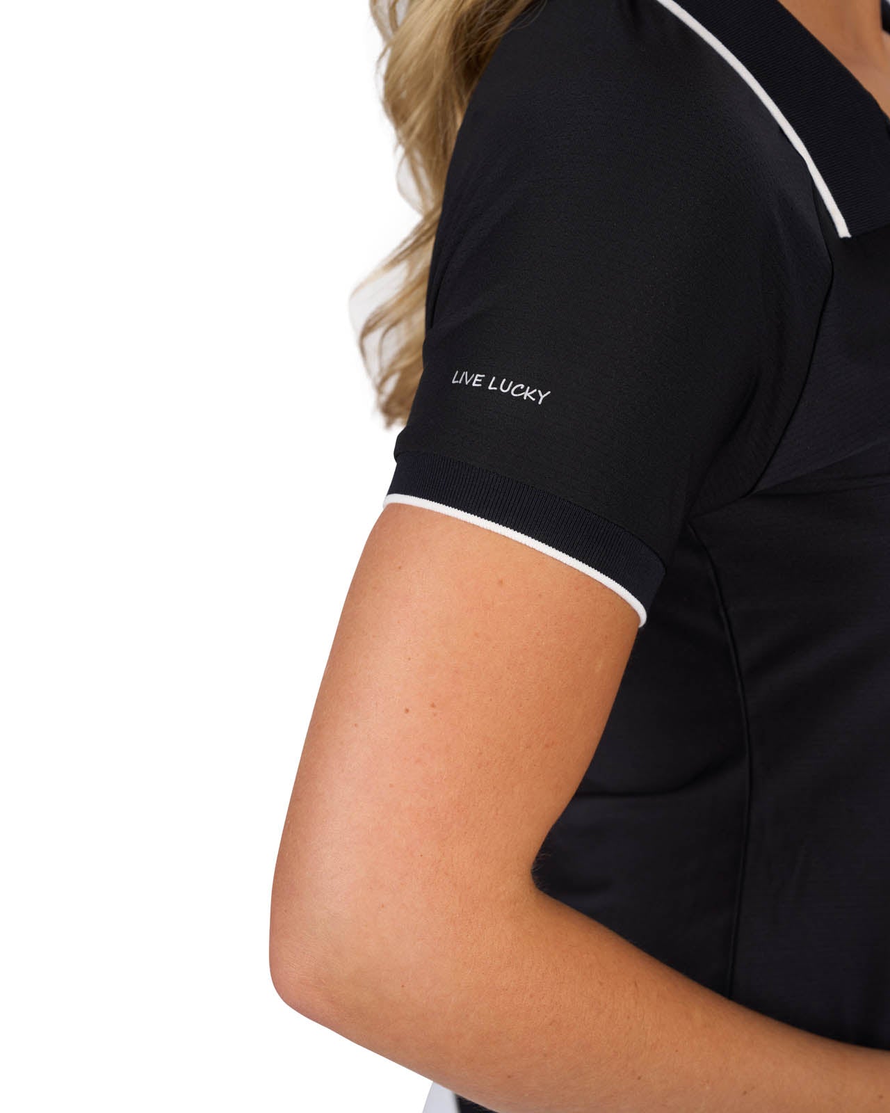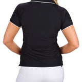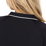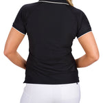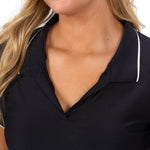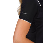 Introducing the Aria Polo, where sleek design meets ultimate comfort. This women’s polo features a solid black accented with white piping on the collar and cuffs for a polished look. With a chic open V-neck and crafted from breathable performance mesh stretch, it’s super soft and perfect for any occasion.