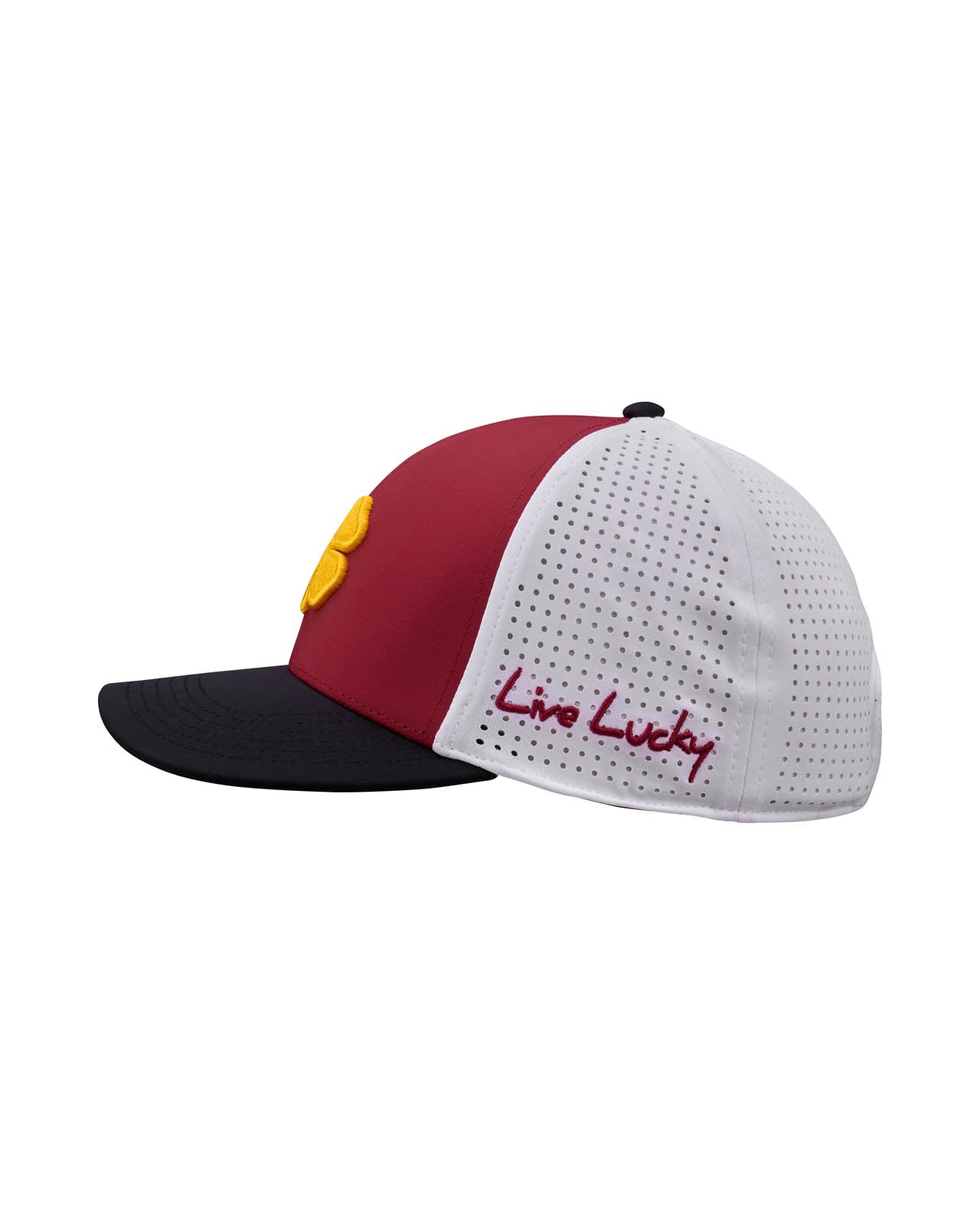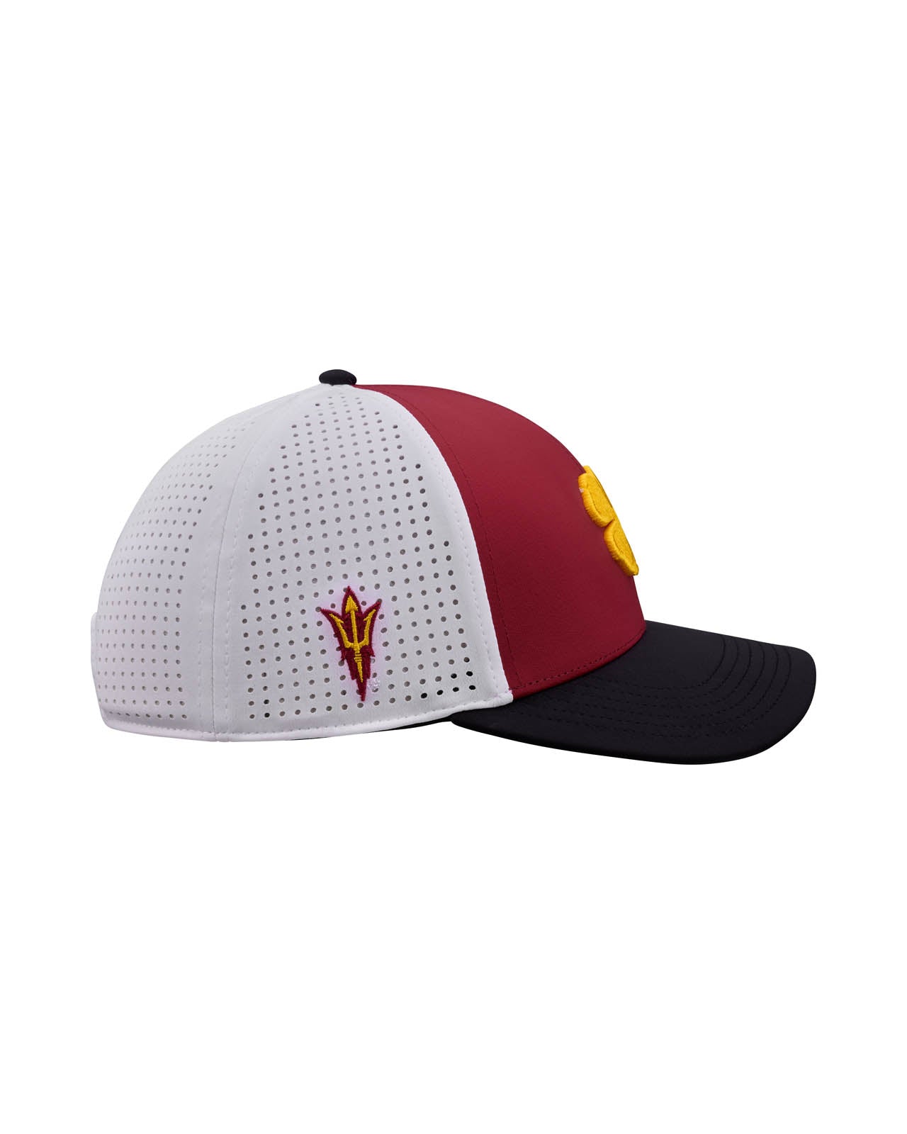 Cheer on the Sun Devils with a hat that delivers on school spirit and high performance. The Arizona State Benchmark features a maroon, black, and white laser-cut design, topped off with a bold gold 3D clover that brings the heat. Perforated for breathability and built with an ultra-comfortable fit, this ASU snapback keeps things cool while locking in the perfect look.