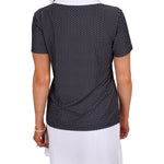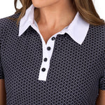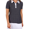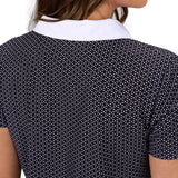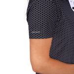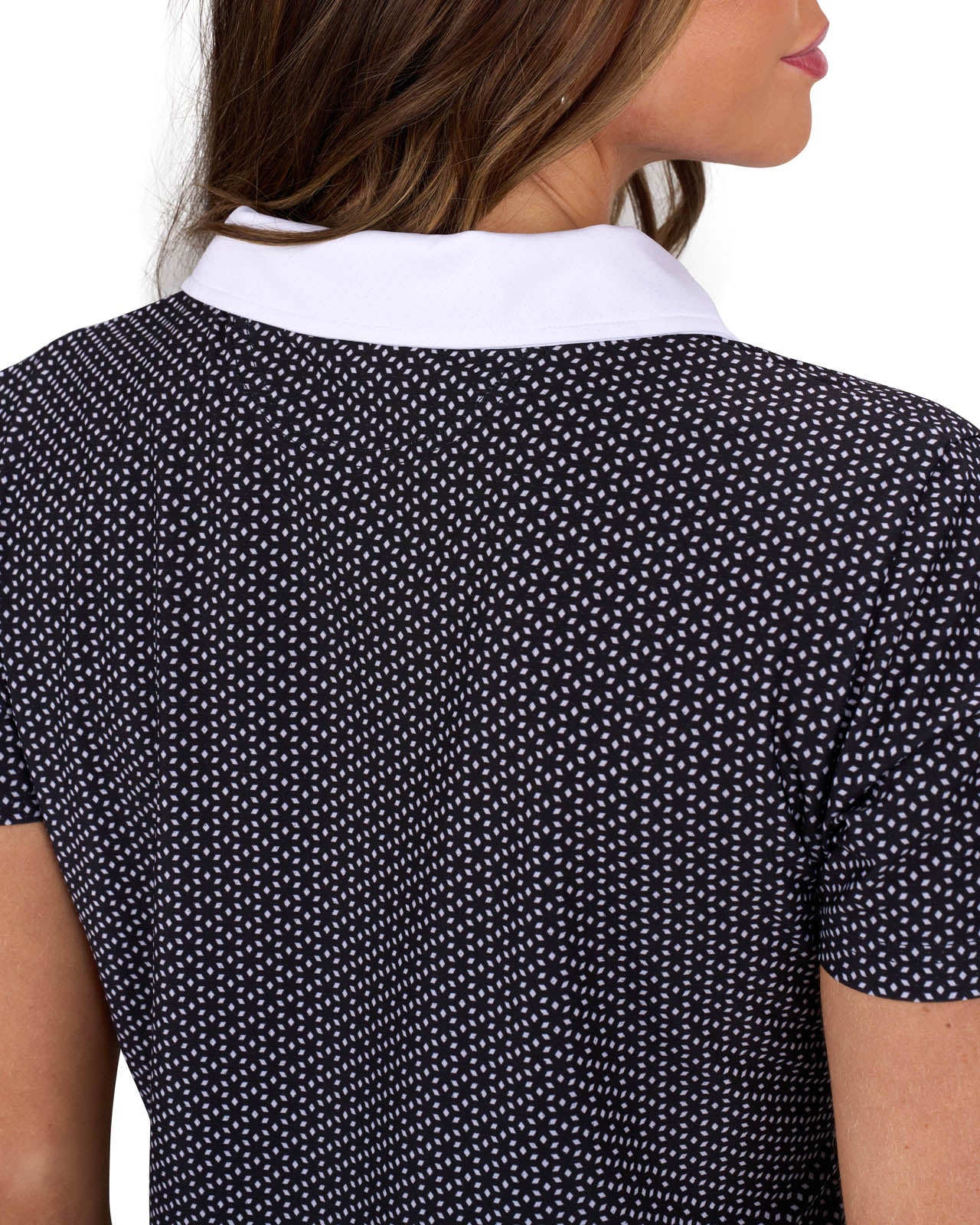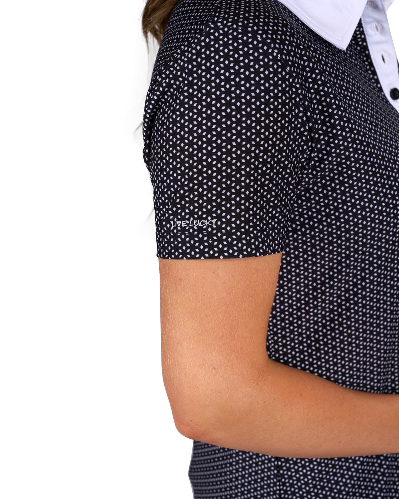 Our women's Asteria Polo combines timeless elegance with modern performance. Featuring a black design with a subtle white pattern, black collar and 5-button placket, it’s crafted from poly spandex performance mesh stretch. Super soft, breathable, and with 4-way stretch, it offers style and mobility.
