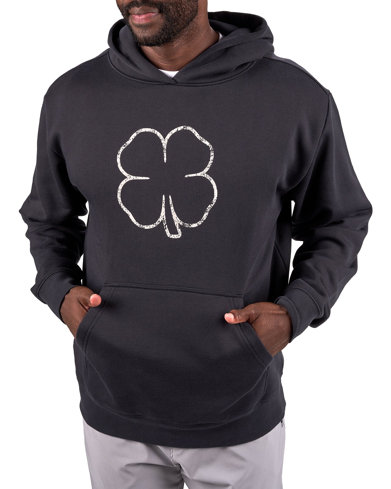 The Clover Luck Hoodie is a must-have men’s black hoodie designed for both performance and everyday wear. Made from a luxury cotton and polyester blend, this athletic hoodie delivers ultimate comfort with built-in stretch and shape-retention technology to wear on repeat. The low-shrinkage fabric makes it easy to care for, while its textured finish adds a premium touch to your casual or active wardrobe. A white clover outline stands out on the chest, paired with a sleek black clover logo on the back of the hood for a clean, confident look. Perfect as a golf hoodie, gym layer, or casual hoodie for men.