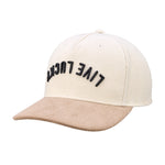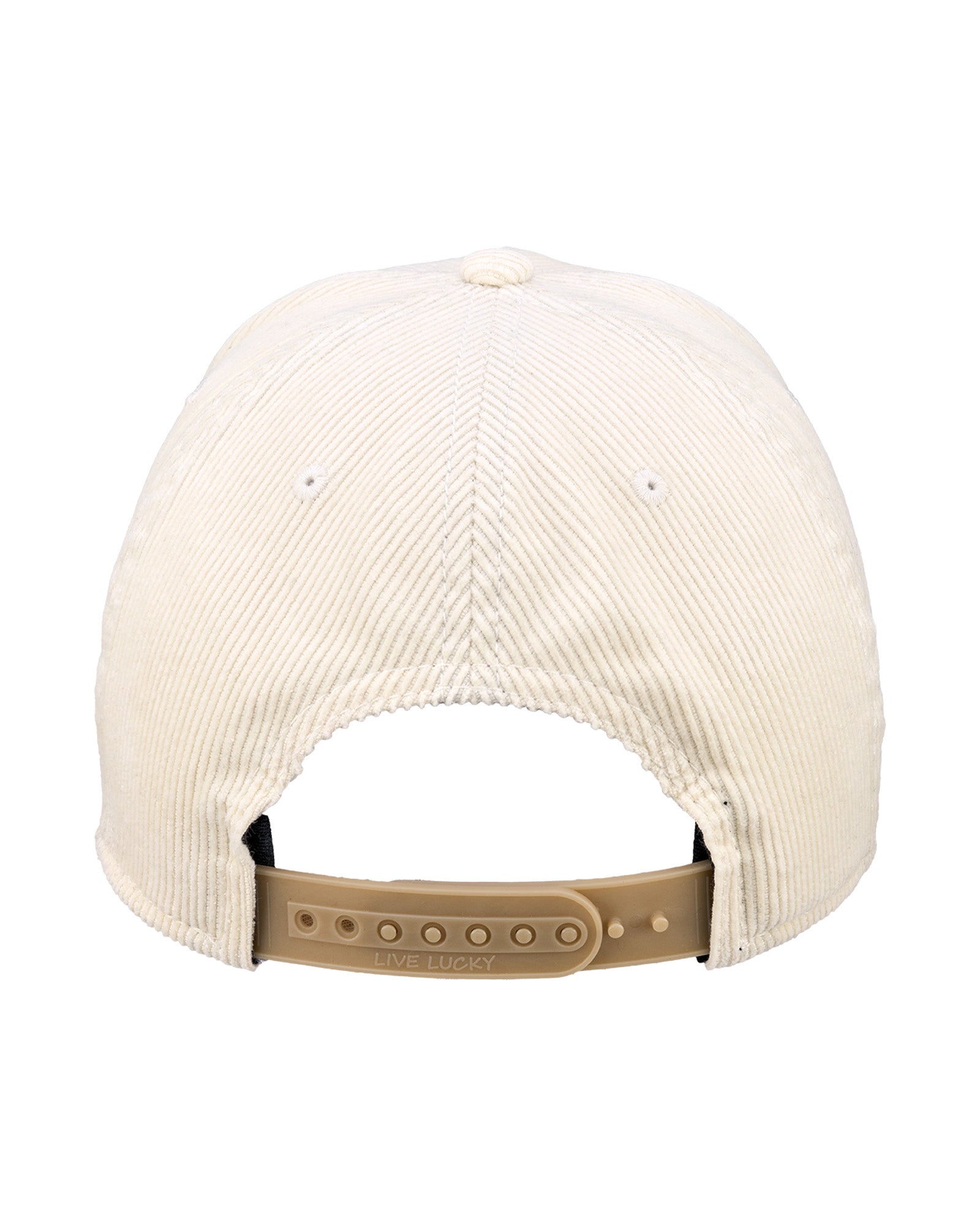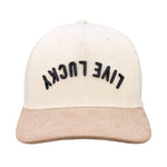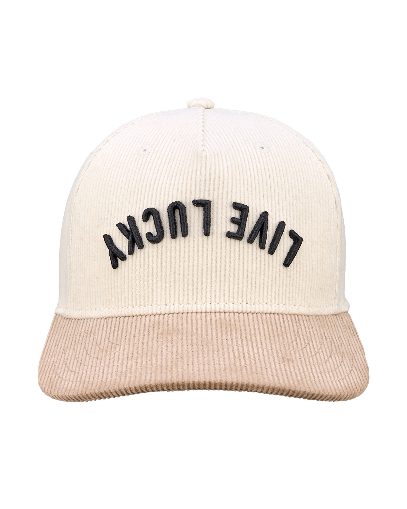 Top off your look with this vintage-inspired snapback hat. Featuring an adjustable fit, our Cord Upside Down Luck 1 boasts a creme crown with a contrasting light brown brim and bold 3D embroidery. The design showcases our motto 'Live Lucky' in an upside down style, offering a perfect blend of classic style and modern edge.