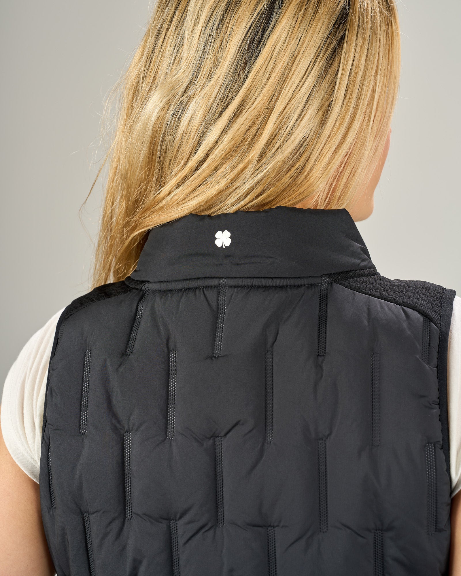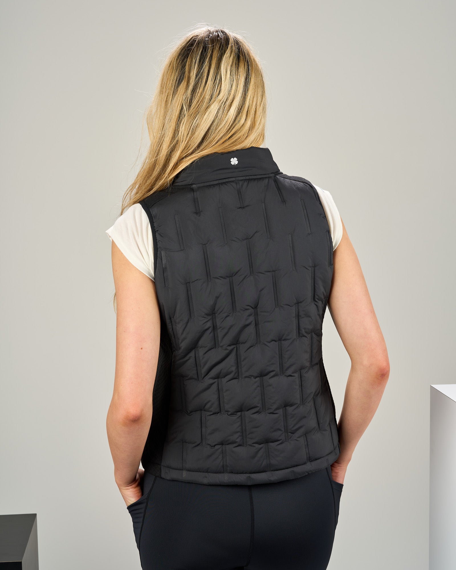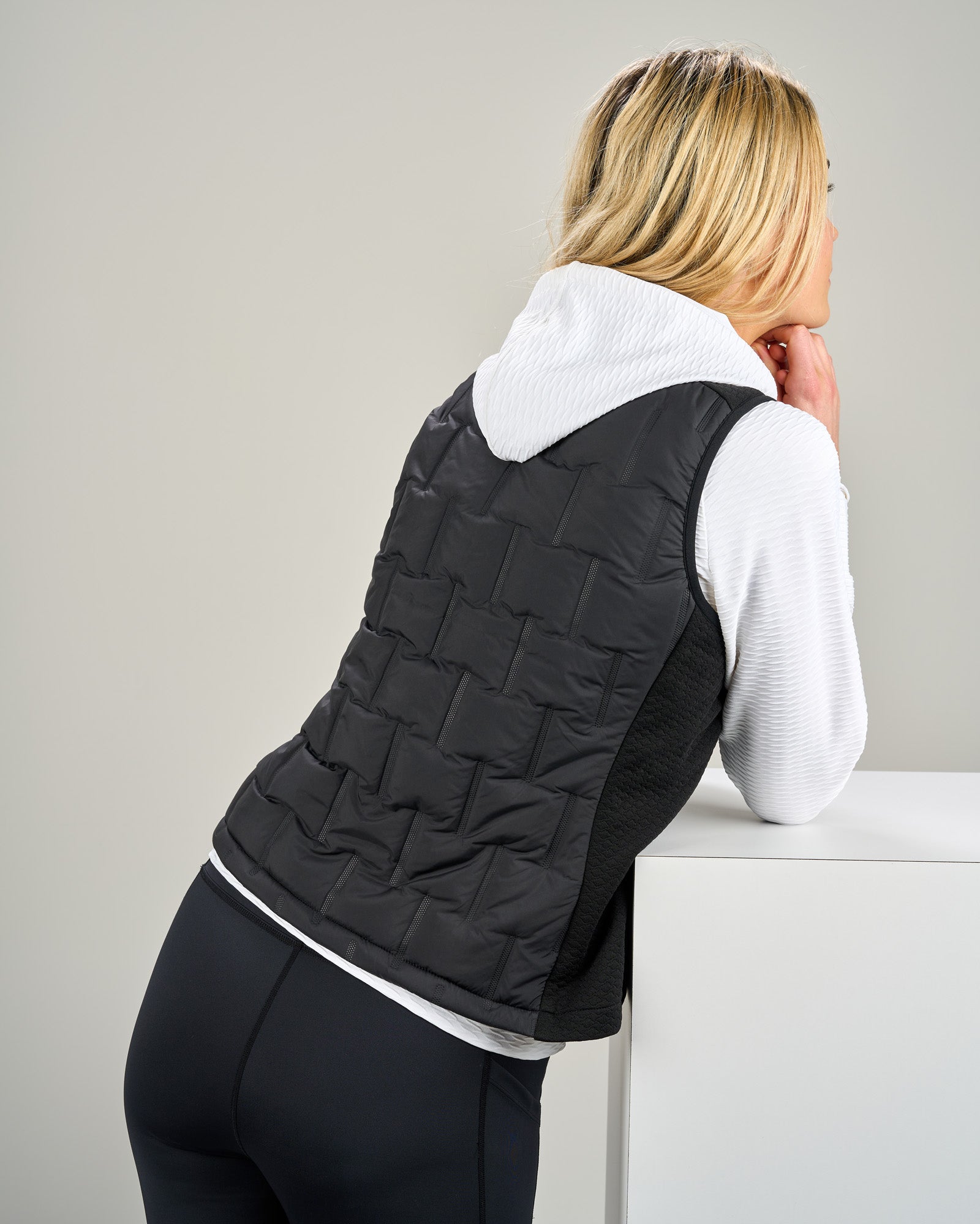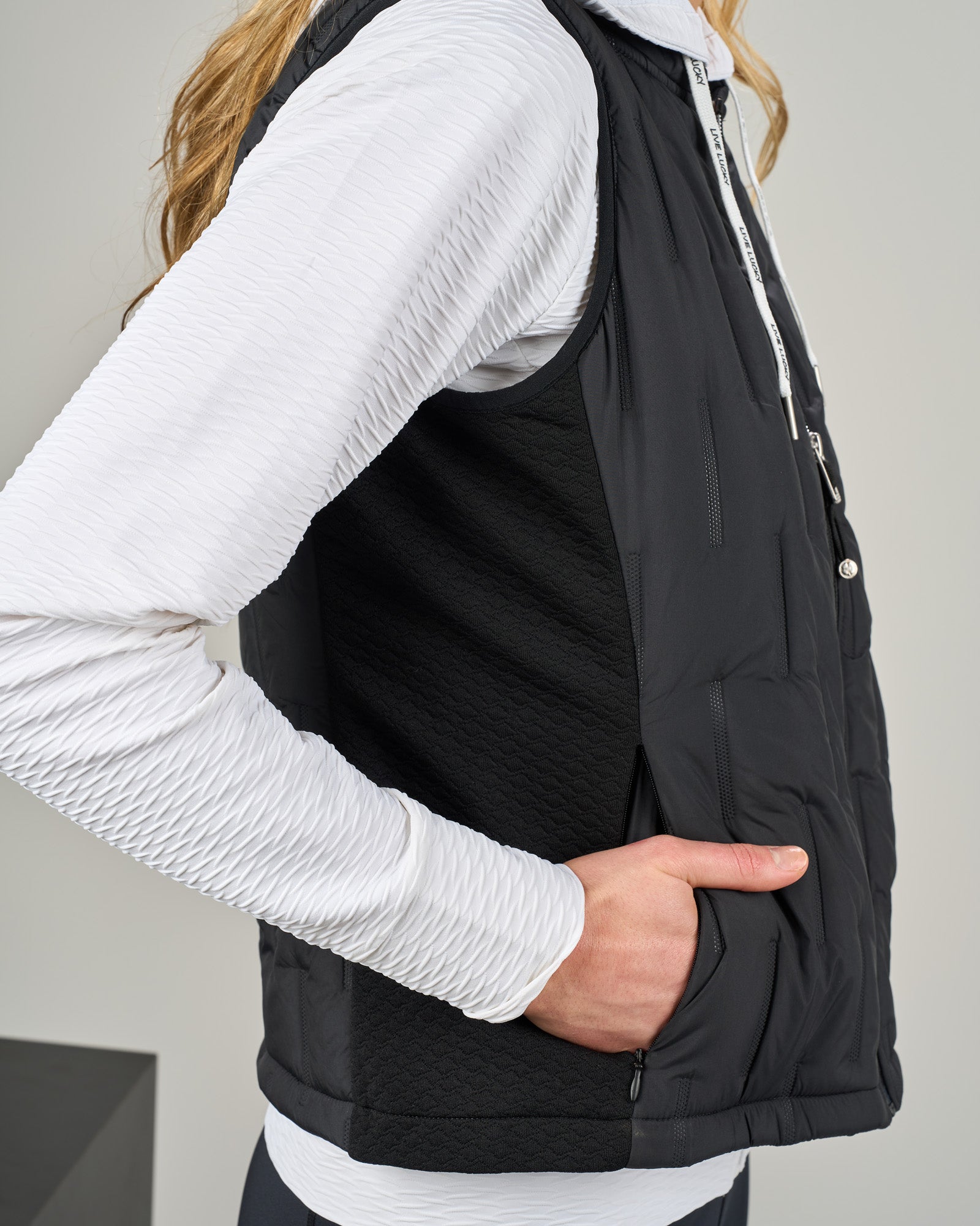 Take on winter and cool weather with our Delia Puff Vest in black, perfect for cute winter style while staying comfortable and warm. Designed with a 100 percent polyester quilted jacquard body and stretch-enhanced side panels, this women’s black puffer vest delivers breathable comfort, high moisture transport, and all day wearability. Ideal for layering over your favorite polos or long sleeves, this vest is made to move with you from course to street.