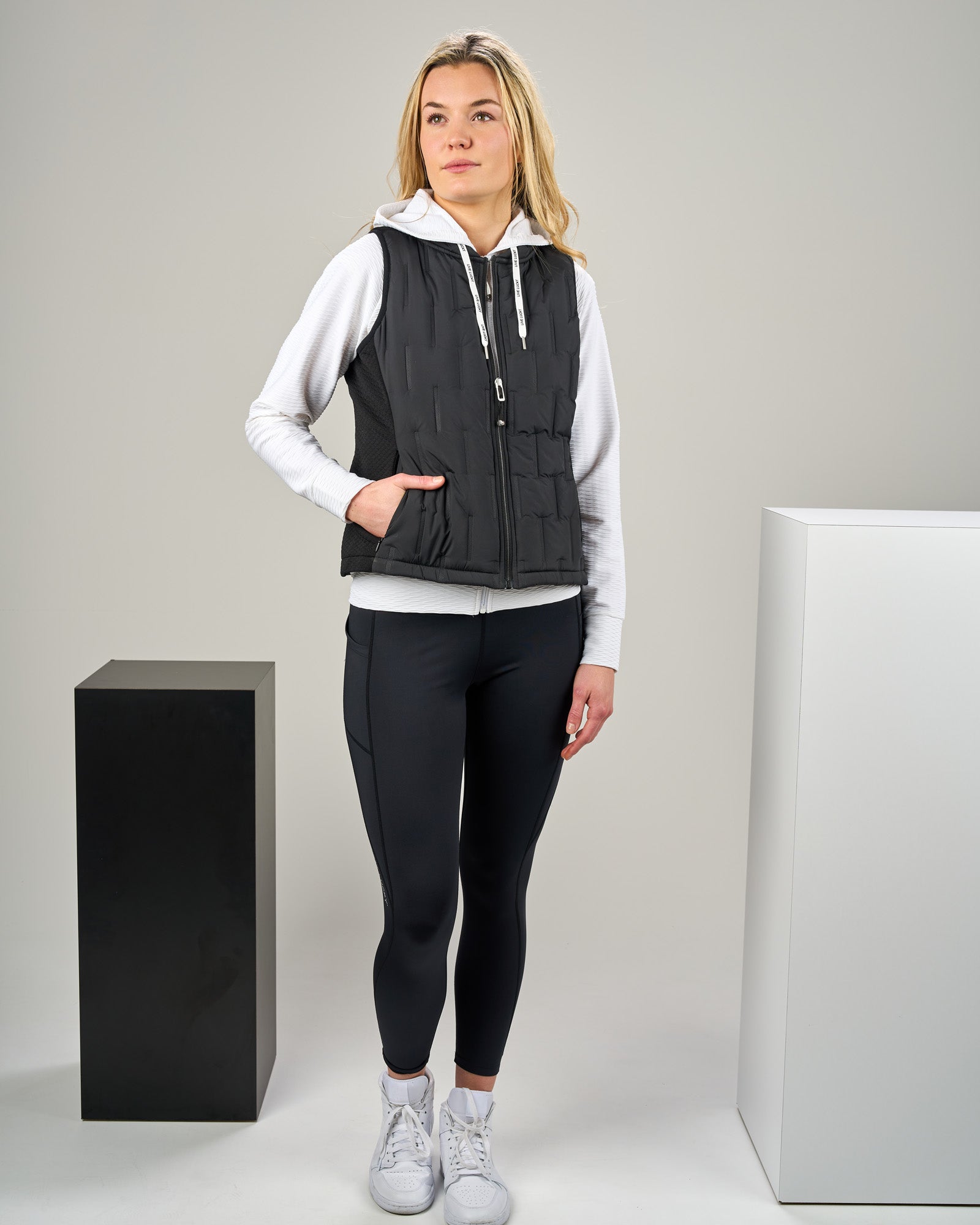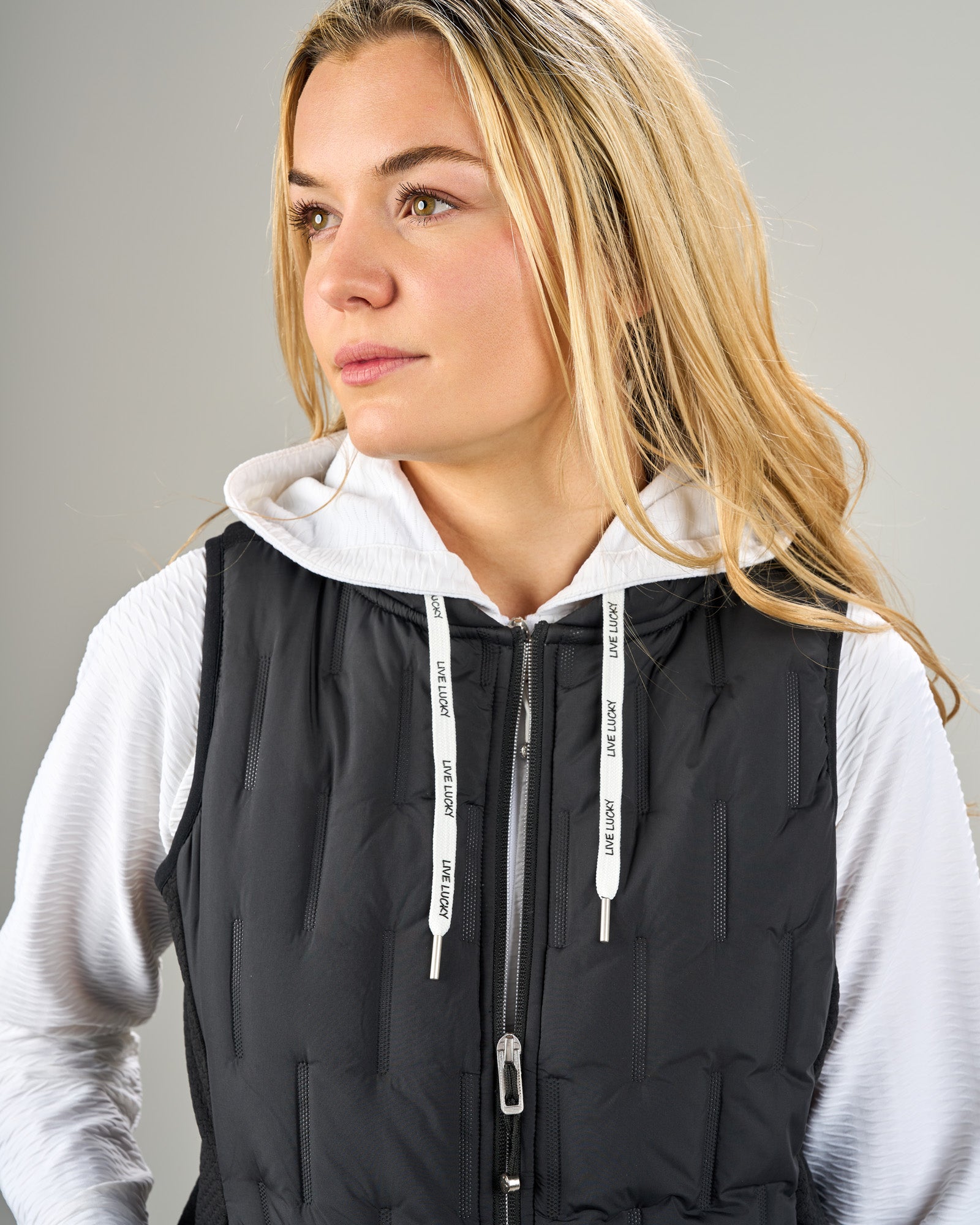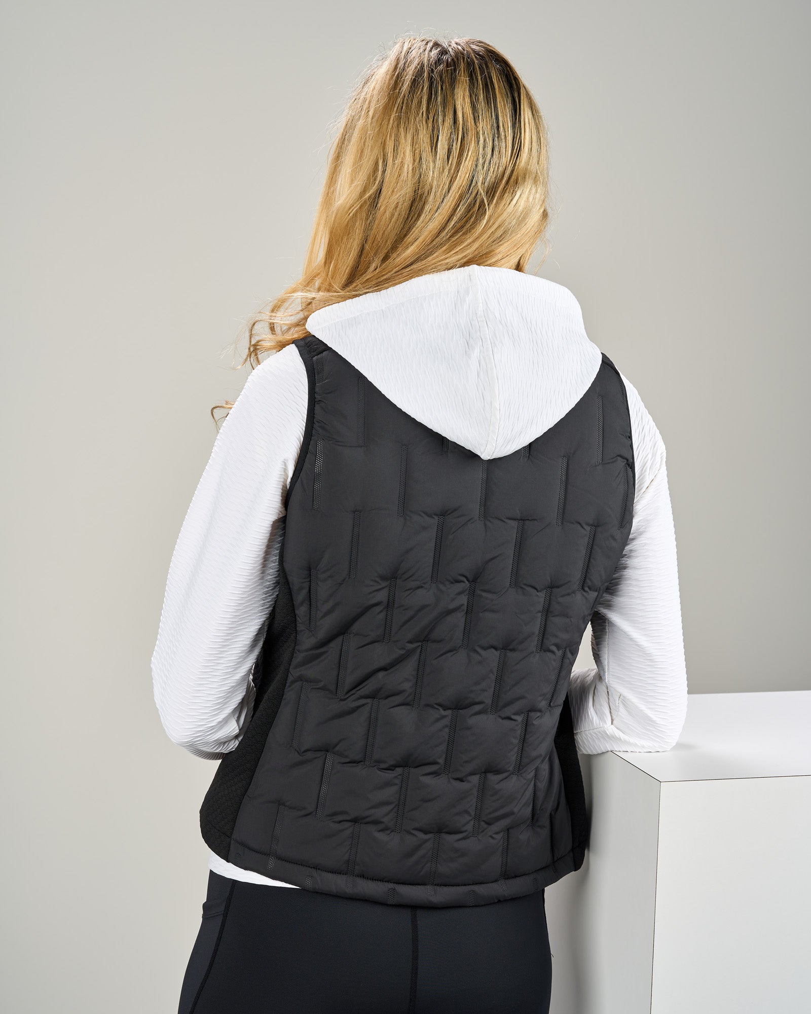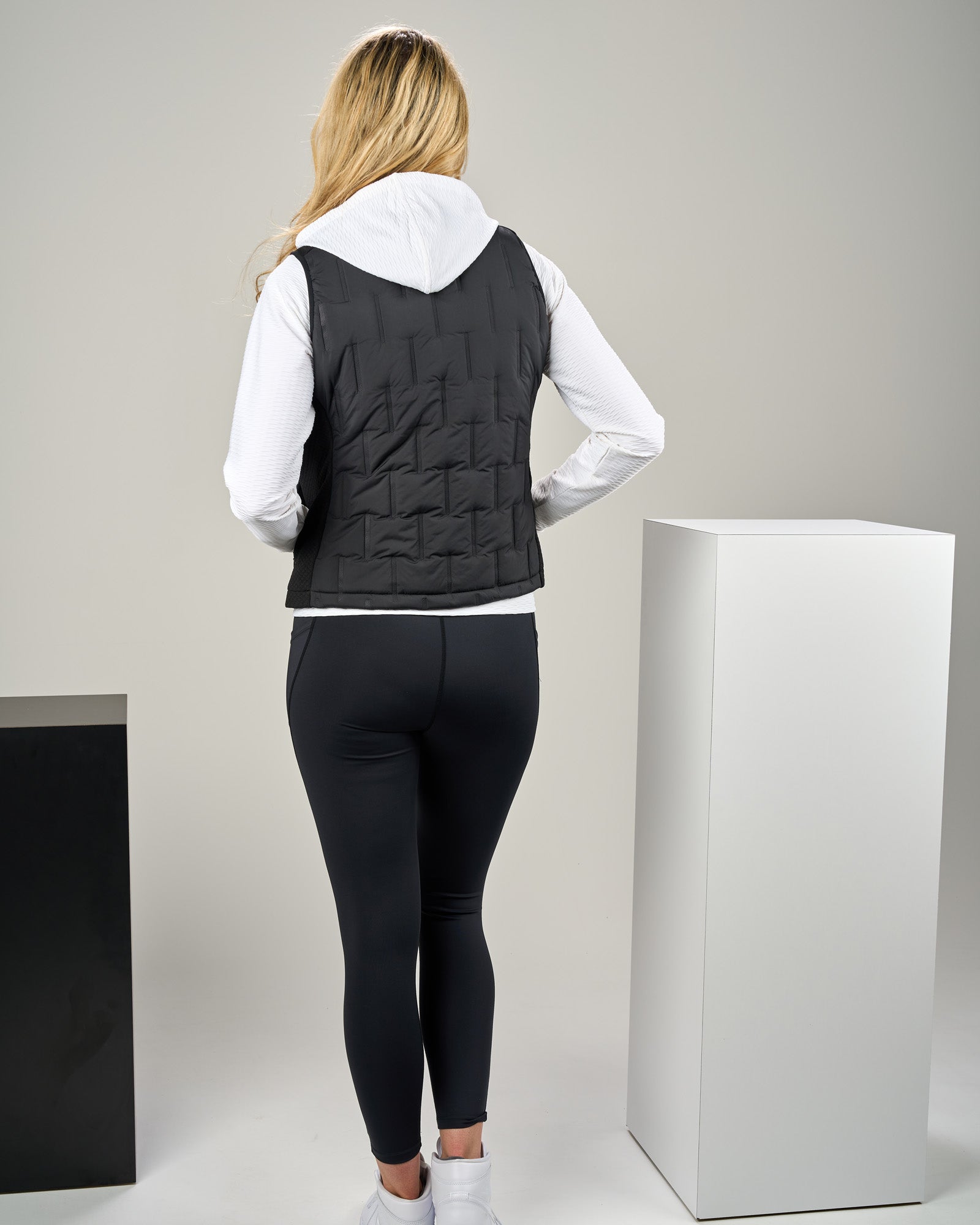 Take on winter and cool weather with our Delia Puff Vest in black, perfect for cute winter style while staying comfortable and warm. Designed with a 100 percent polyester quilted jacquard body and stretch-enhanced side panels, this women’s black puffer vest delivers breathable comfort, high moisture transport, and all day wearability. Ideal for layering over your favorite polos or long sleeves, this vest is made to move with you from course to street.