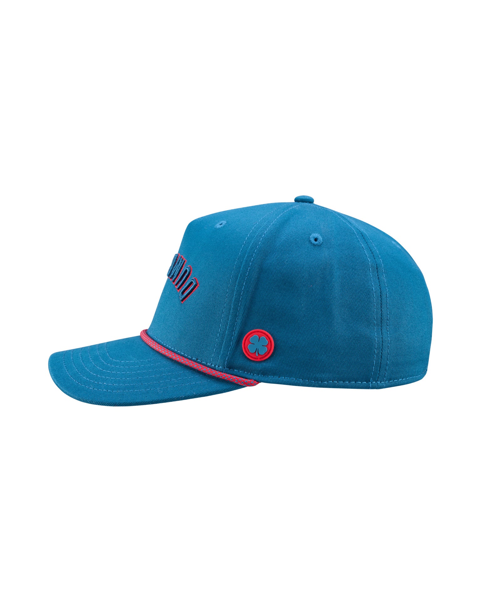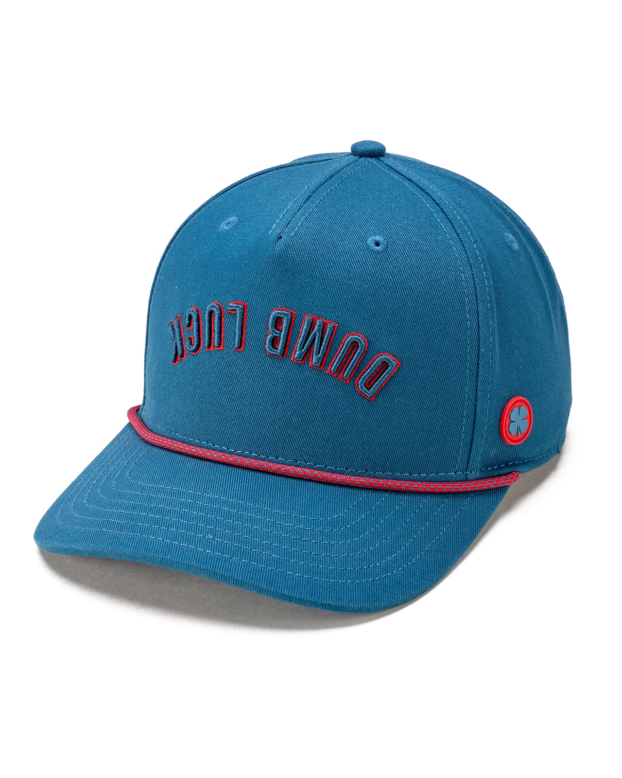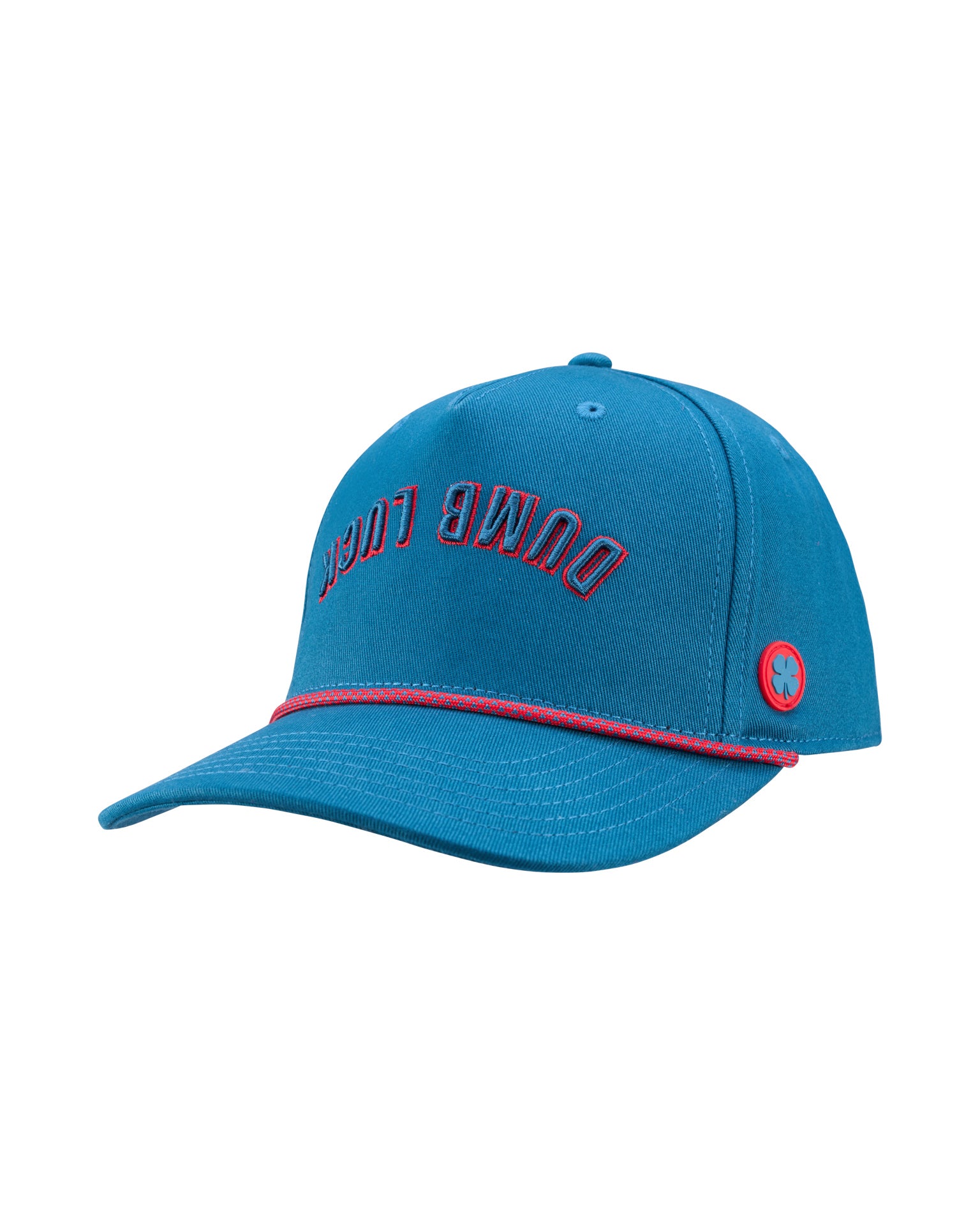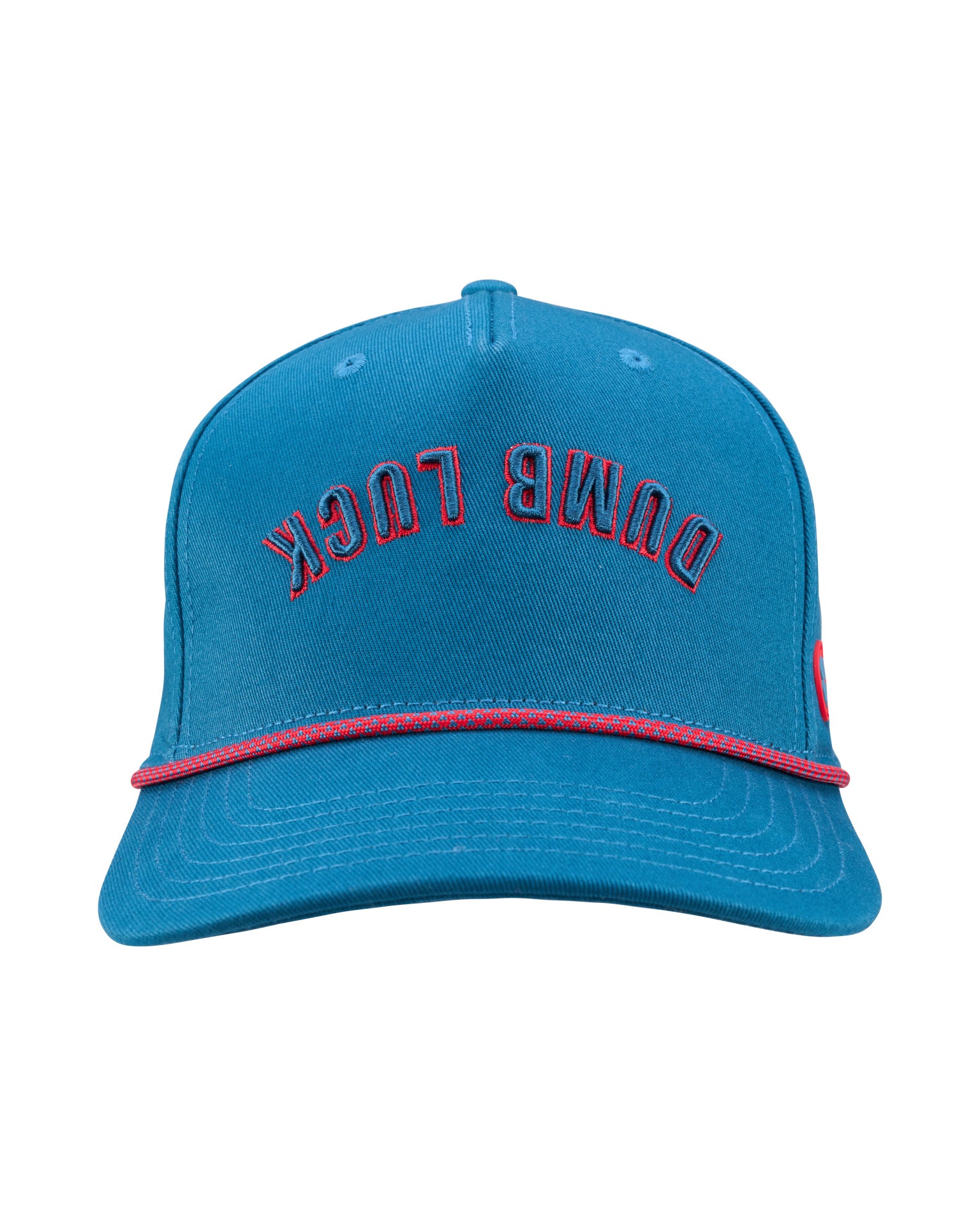 Top off your look with this vintage-inspired snapback hat. Featuring an adjustable fit, our Dumb Luck 1 boasts a blue crown, a contrasting red brim rope, and bold 3D embroidery in cobalt blue and red. The design showcases a playful slogan "Dumb Luck" in an upside down style, offering a perfect blend of classic style and modern edge.