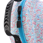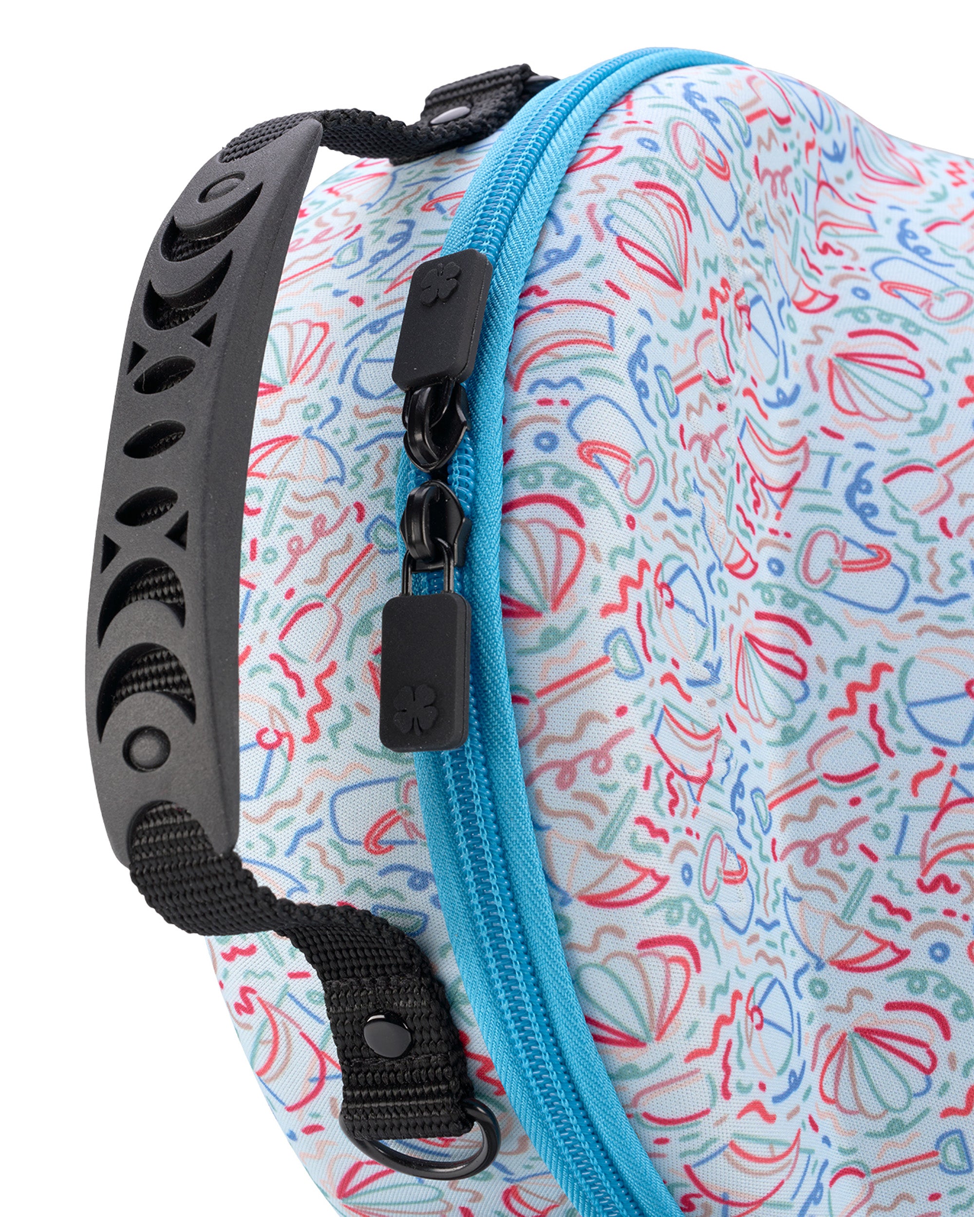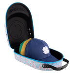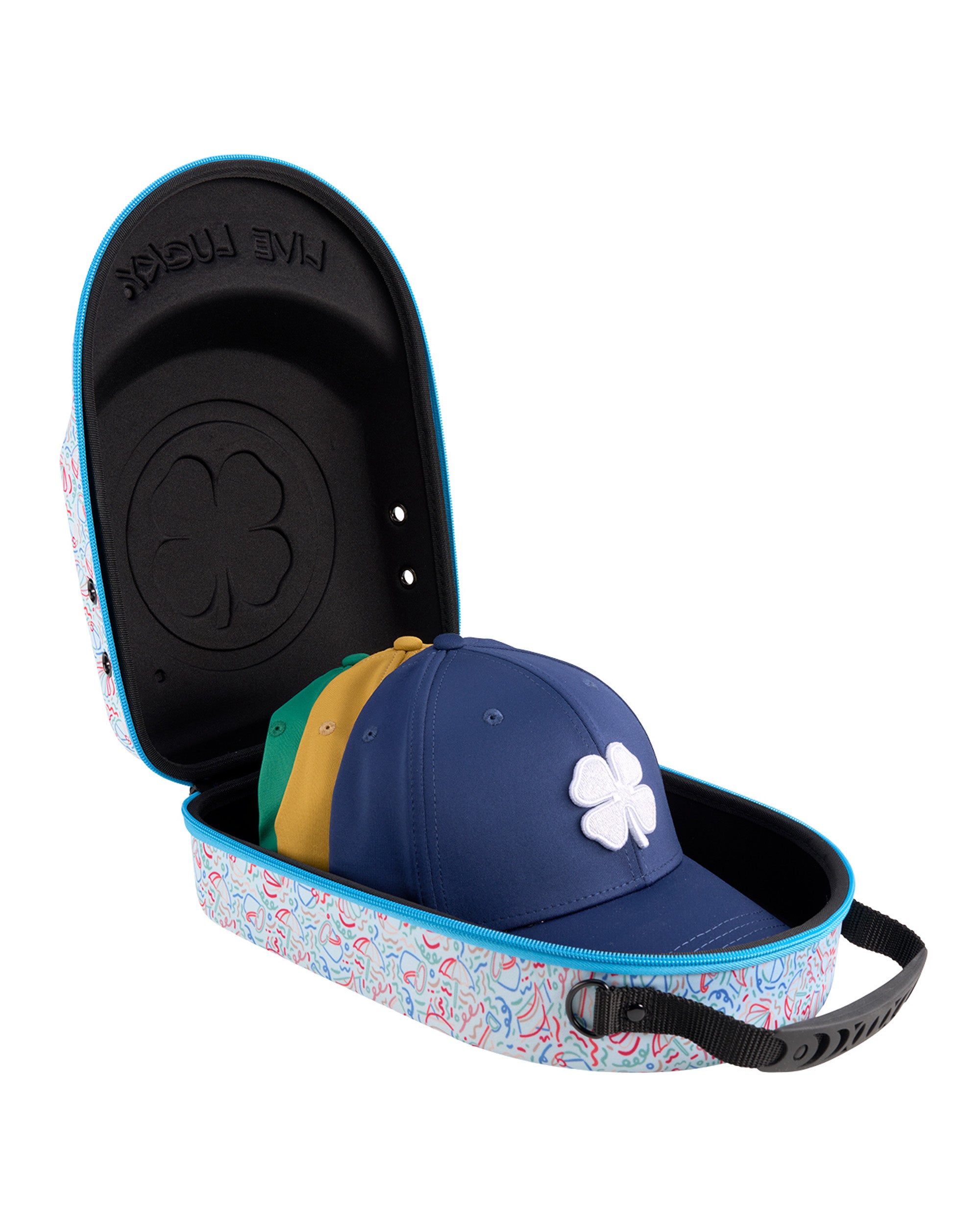 Store your favorite Black Clover headwear in style with our stylish, hat caddie, featuring beach icons on ice blue. Featuring dual zippers, shock-absorbent fabric, and air vents, it protects up to 6 hats. Includes an internal sunglasses case, making it perfect for your closet, car, or vacation.