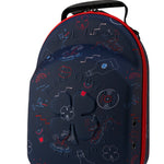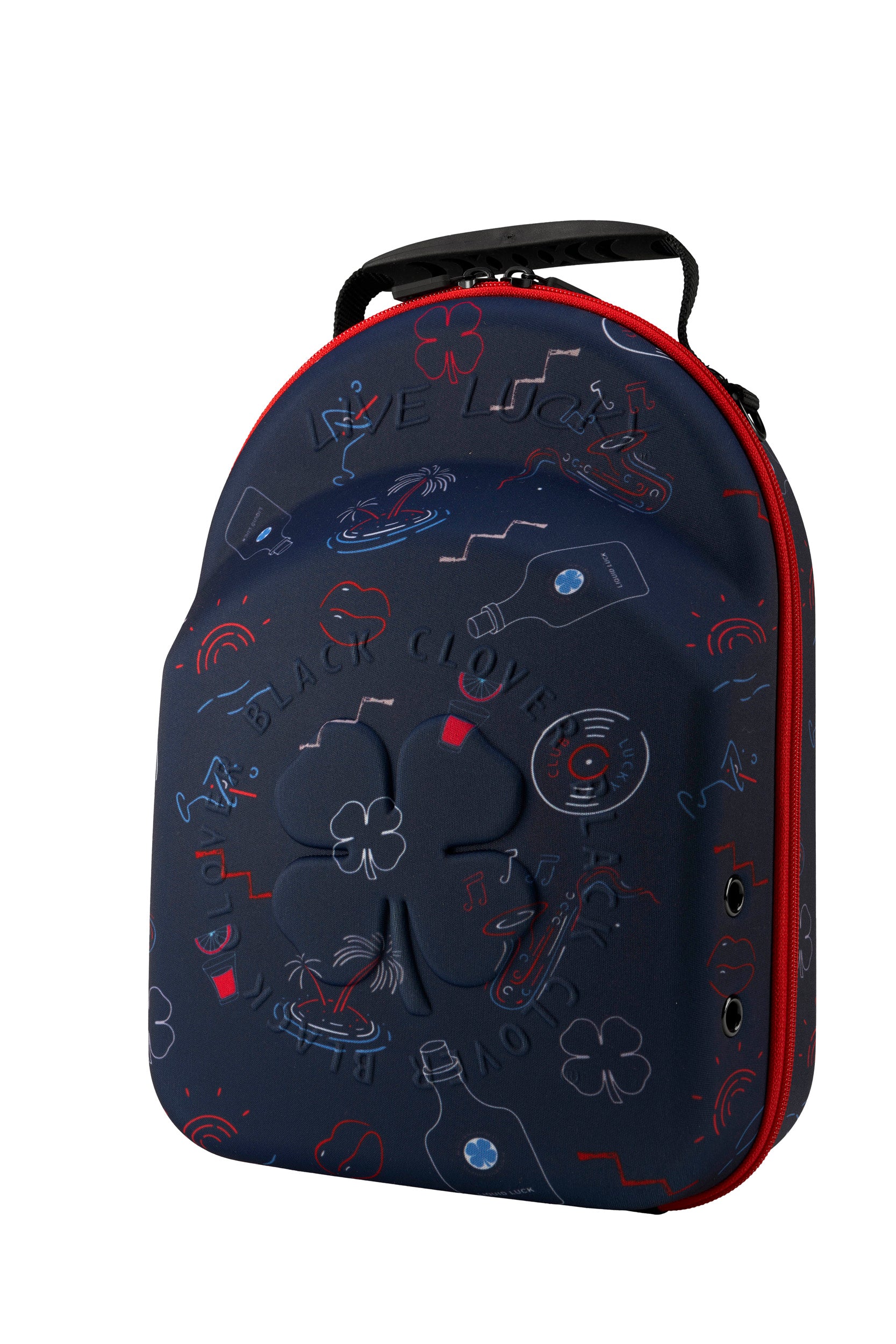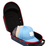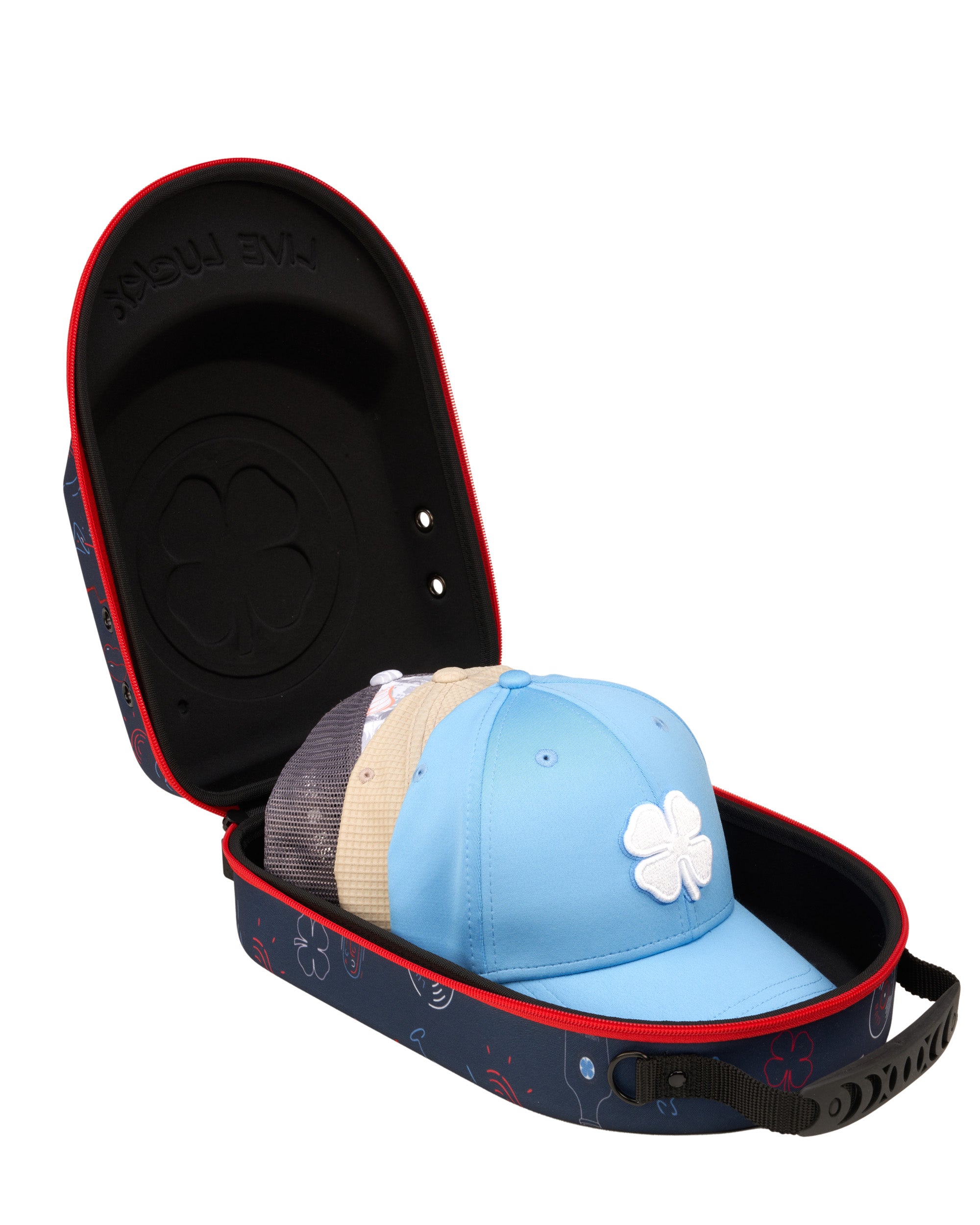 Store your favorite Black Clover headwear with our stylish, hat caddie, featuring fun lifestyle icons on navy blue. Featuring dual zippers, shock-absorbent fabric, and air vents, it protects up to 6 hats. Includes an internal sunglasses case, making it perfect for your closet, car, or vacation.