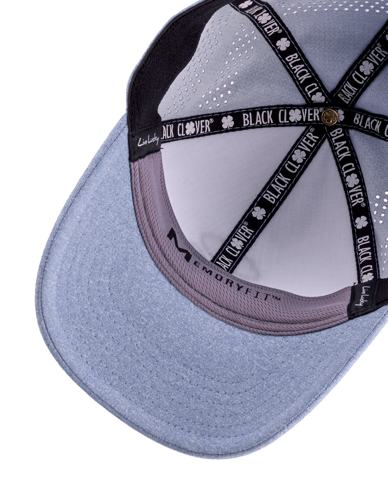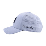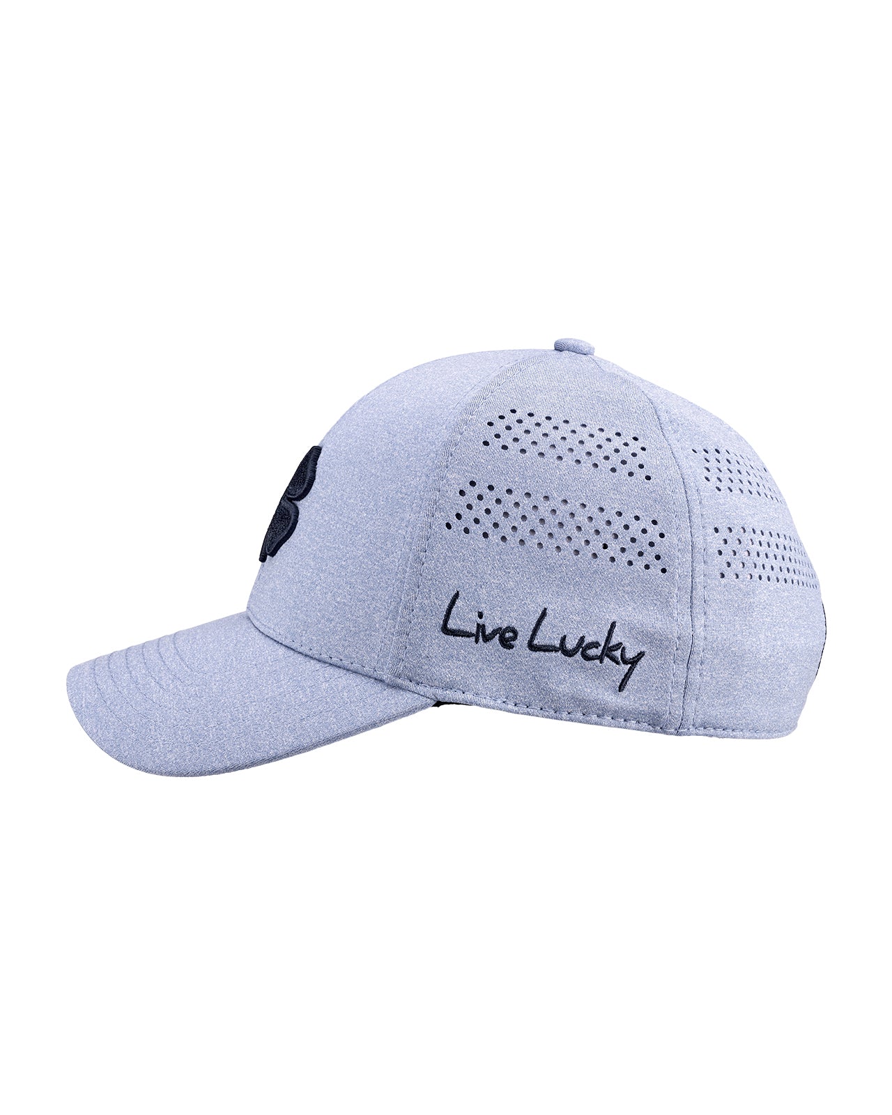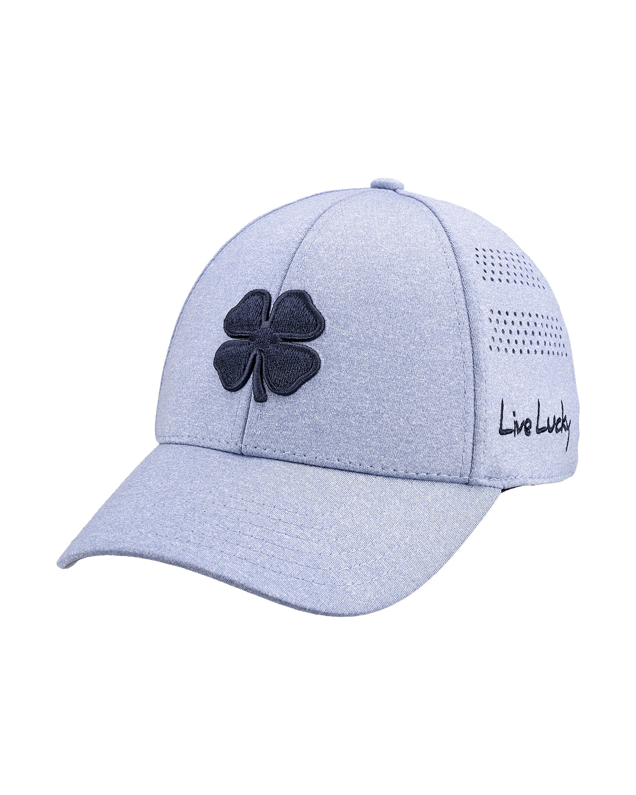 Comfort meets class with our Lucky Heather Laser 5 Hat, part of our new exclusive Memory-Fit™️ athletic headwear. This fitted two-tone hat features heather blue perforated features with a matching periwinkle background, adorned with our black signature clover emblem in 3D. Our unique Memory-Fit™️ technology incorporates high-quality memory foam in the headband, offering a superior fit that molds to your head, enhanced comfort for long-term wear, increased sweat absorption, and exceptional wearability.
