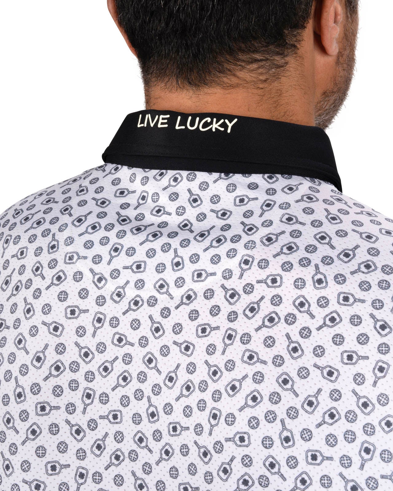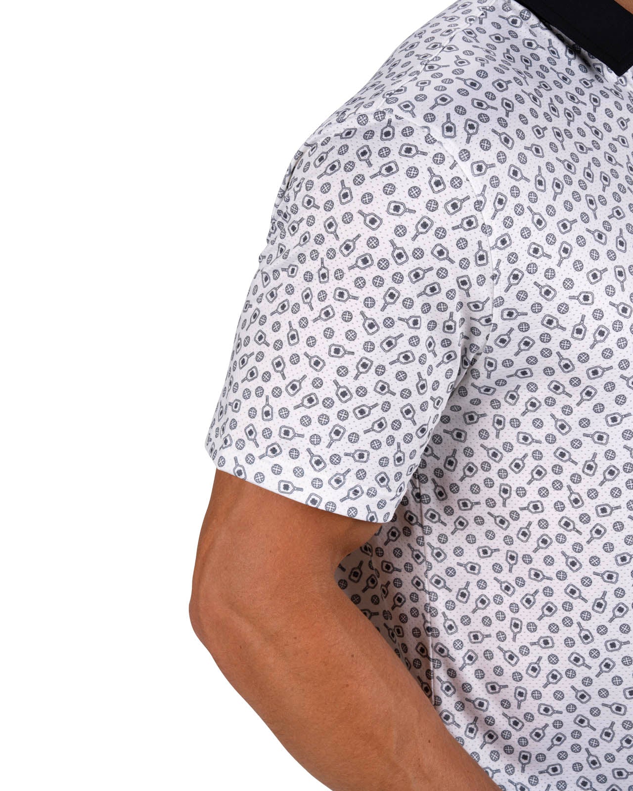 The Lucky Smash Polo brings athletics and performance together with an all-over pickleball paddle and ball pattern in black and white that celebrates the sport. Designed with a Poly Spandex blend and Syntrel stretch mesh, it moves effortlessly with every swing or serve. This pickleball patterned golf polo for men delivers comfort, durability, and a touch of fun on and off the court.