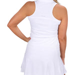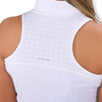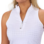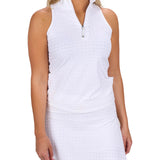 Elevate your game with our white women's Lynx Sleeveless Polo, crafted from poly spandex jacquard stretch in a tonal herringbone. Stylish and flattering, it offers supreme comfort, breathability, and moisture-wicking performance. Perfect for pickleball, tennis, or golf, and pairs perfectly with our Lynx Skort.