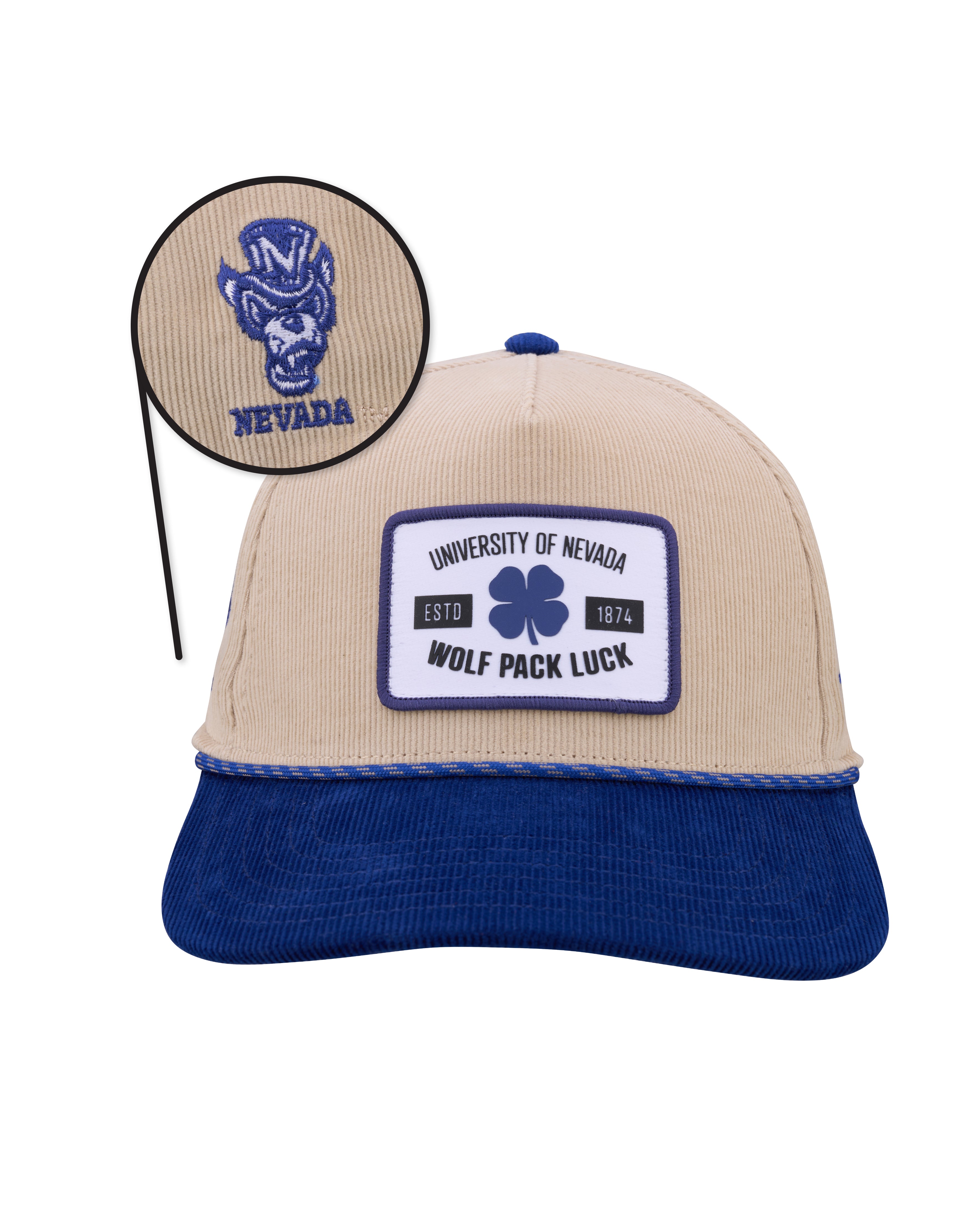 Celebrate Wolf Pack tradition with the Nevada Legacy Hat — a retro cream and navy snapback built for fans who live for game day heritage. Crafted from premium corduroy and finished with rope and an HD clover patch, this University of Nevada snapback blends vintage style with modern comfort, making it a staple from Mackay Stadium to everyday wear.