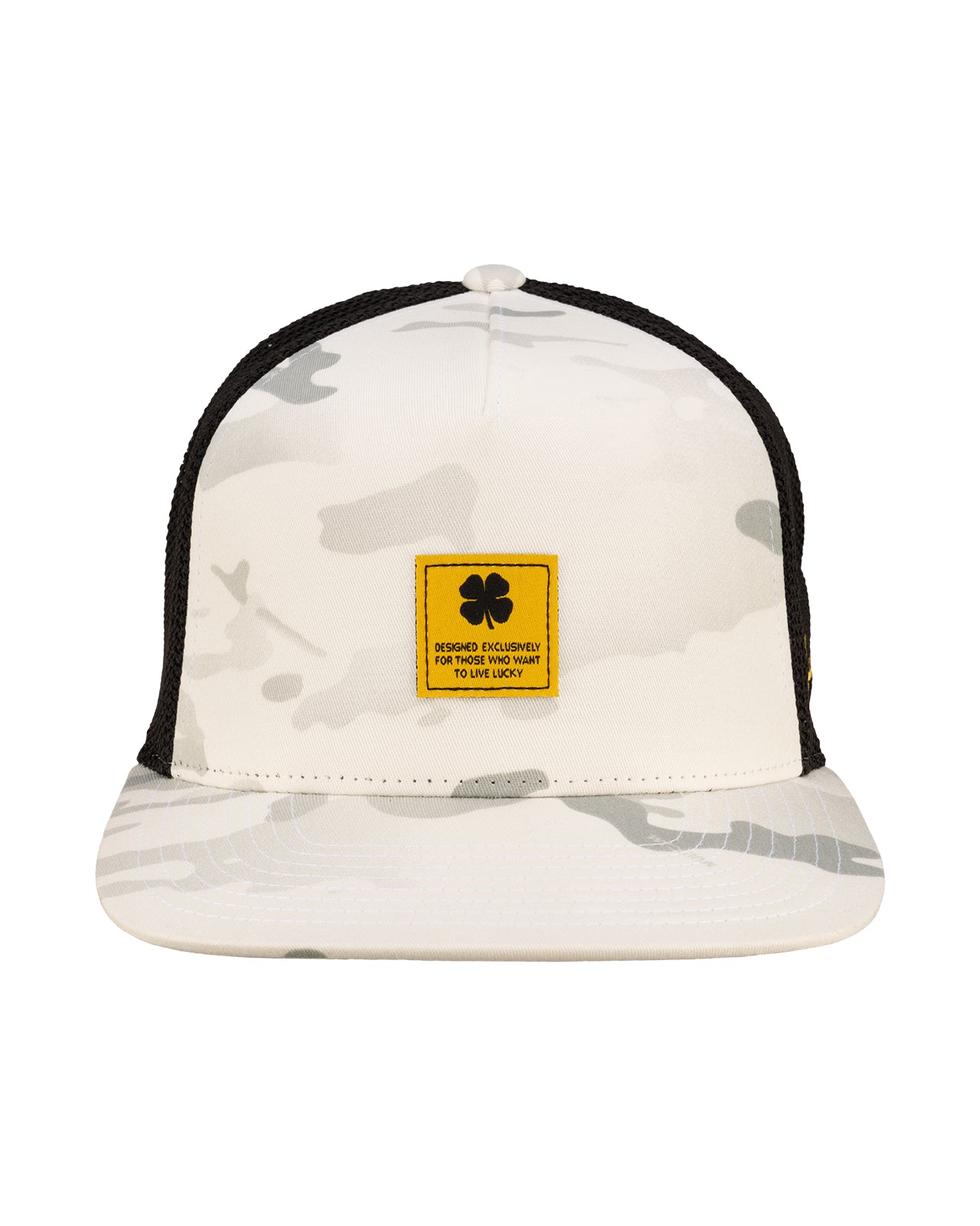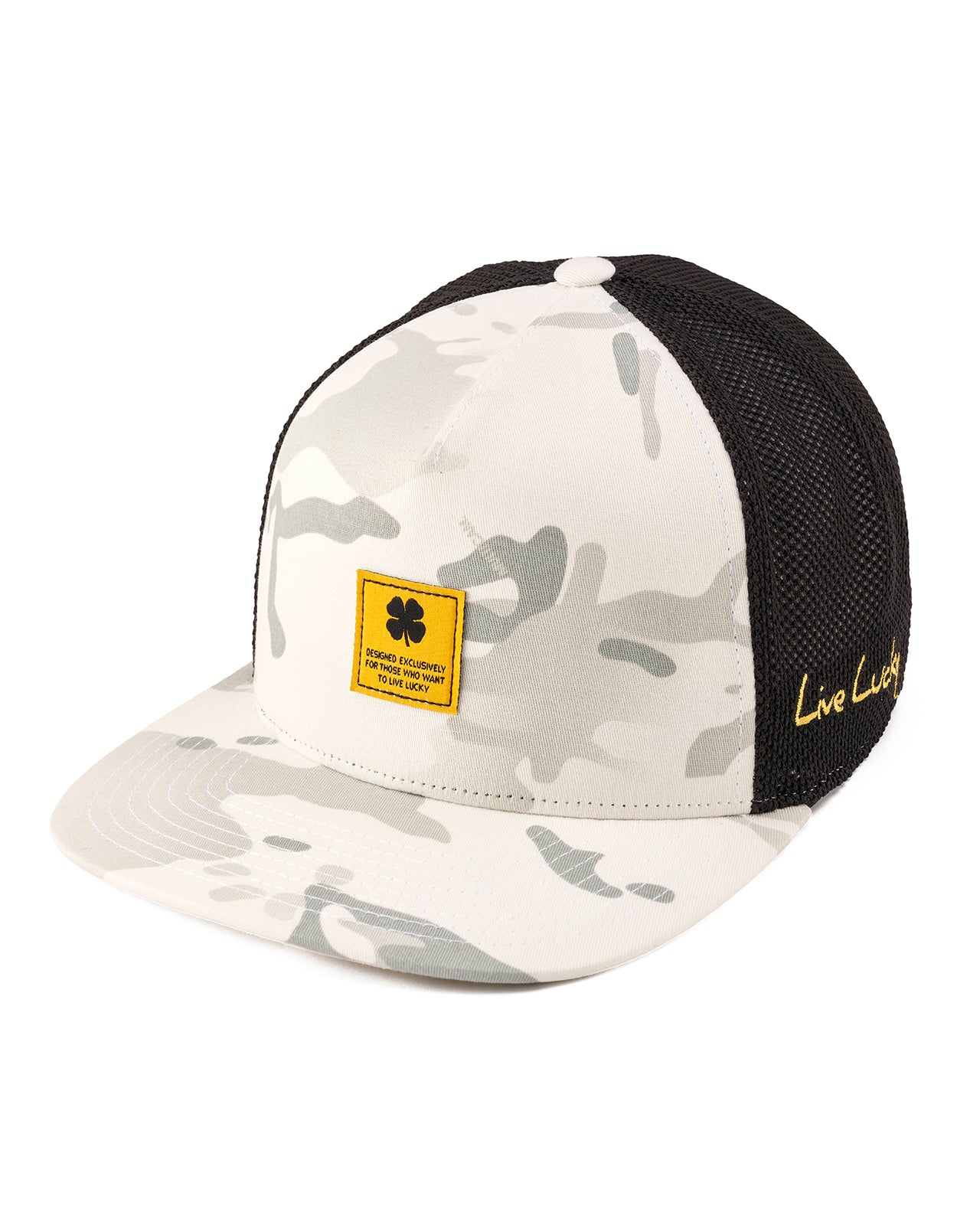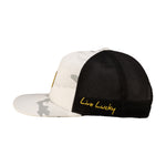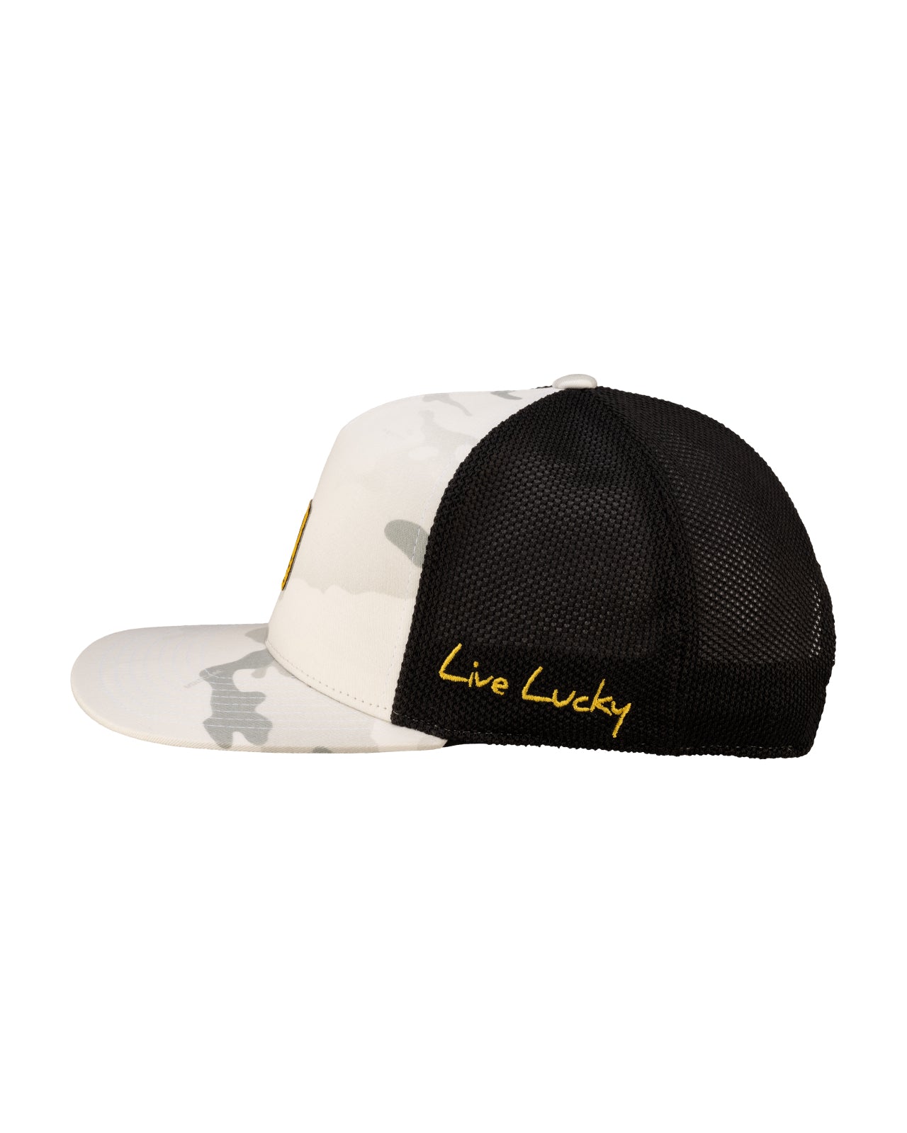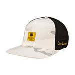 Our adjustable Reign 2 hat is a fantastic addition to any wardrobe. In snow white camo with a black mesh back, this flat-brim five-panel arch fitted hat will keep you stylish, on-trend, and looking like a pro. Perfect for the golf course or for a night on the town, this versatile hat features a yellow woven patch.