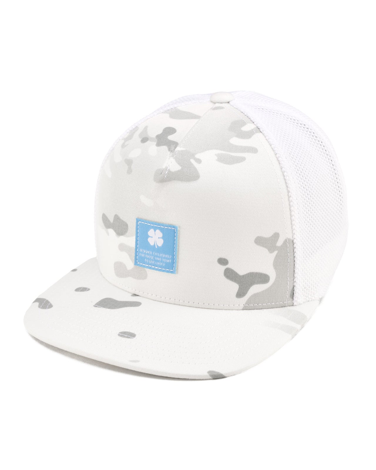 Our adjustable Reign 3 hat is a fantastic addition to any wardrobe. In snow white camo with a white mesh back, this flat-brim five-panel arch fitted hat will keep you stylish, on-trend, and looking like a pro. Perfect for the golf course or for a night on the town, this versatile hat features a blue woven patch.