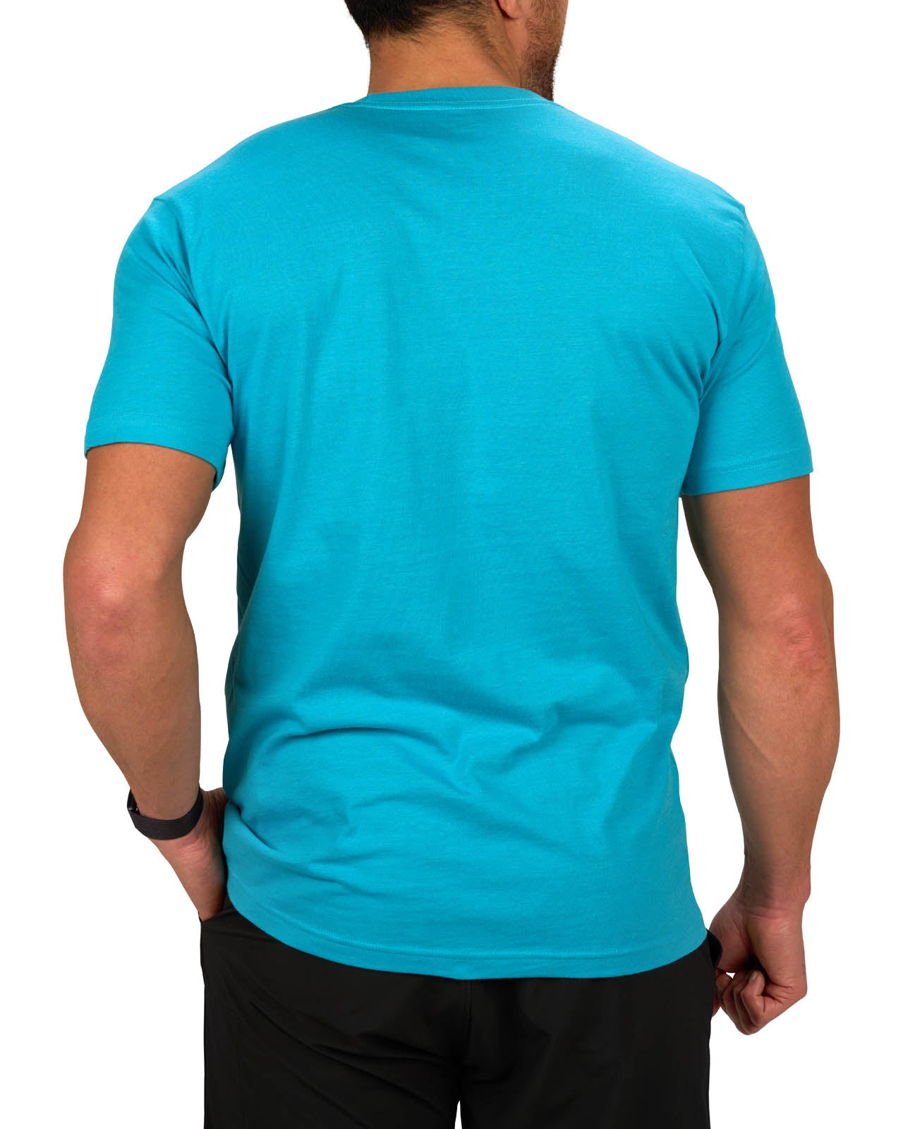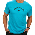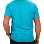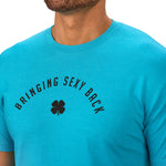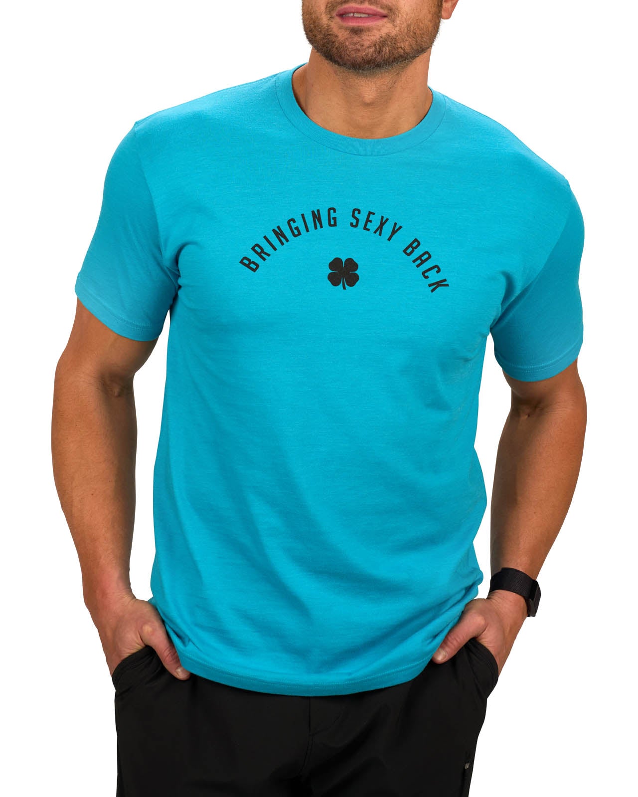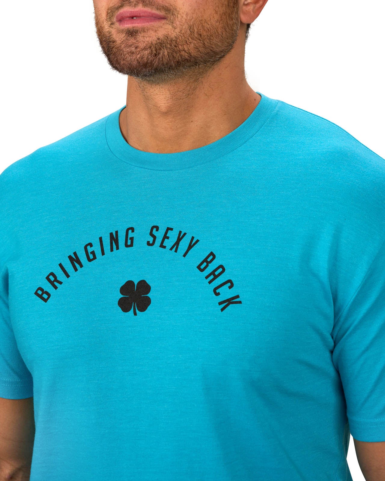 The Sexy Back Tee features black text on a turquoise background. Crafted from a cotton-poly blend, it ensures no-to-low shrinkage, a comfortable fit, and durability. Easy to style, it pairs perfectly with a blazer for a night out or athletic shorts for a casual, active day.