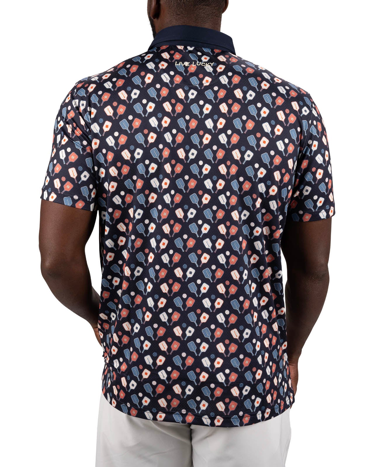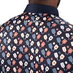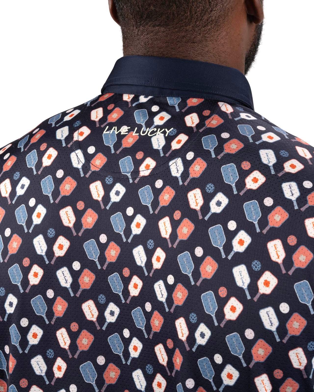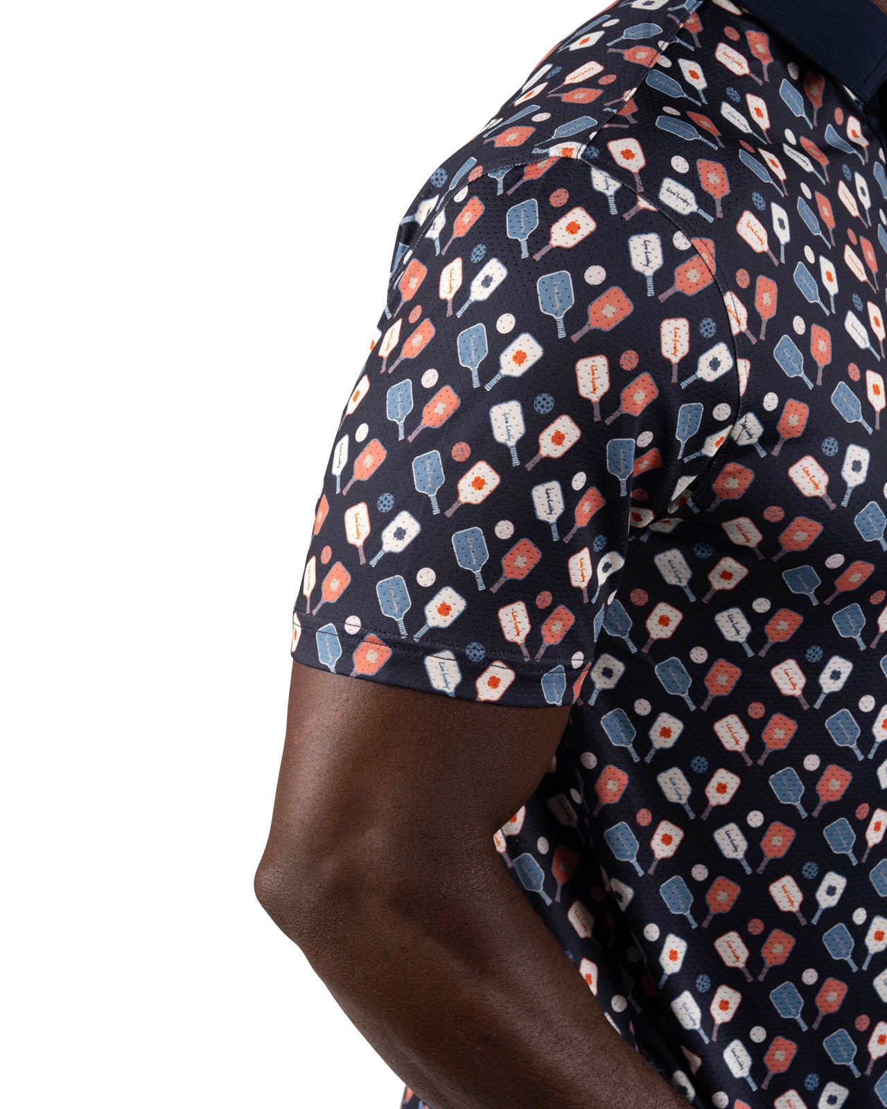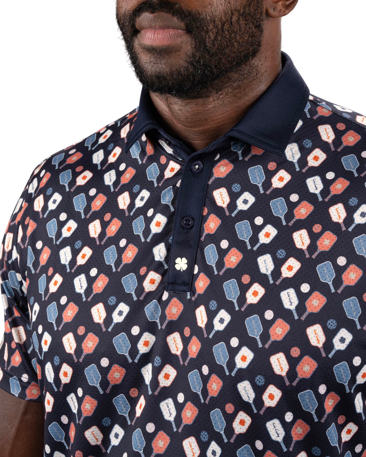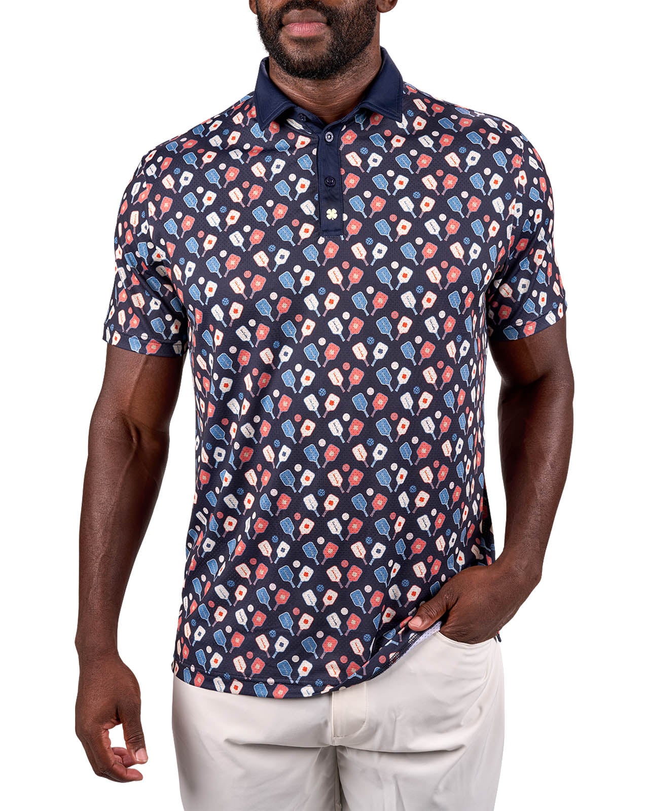 Serve style on and off the pickleball court with the Shake-N-Bake Polo, our navy performance polo featuring an allover pickleball paddle and ball design. Crafted from a breathable poly-spandex double-knit blend, it delivers soft stretch, moisture-managing comfort, and reliable shape retention. The no-curl rib collar and cow-shrinkage fabric keeps your look sharp. Versatile enough to dress up or down, this premium men’s golf polo brings playful energy and all-day performance to every match, meetup, or weekend outing.