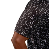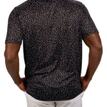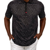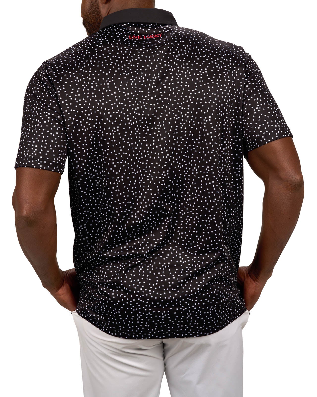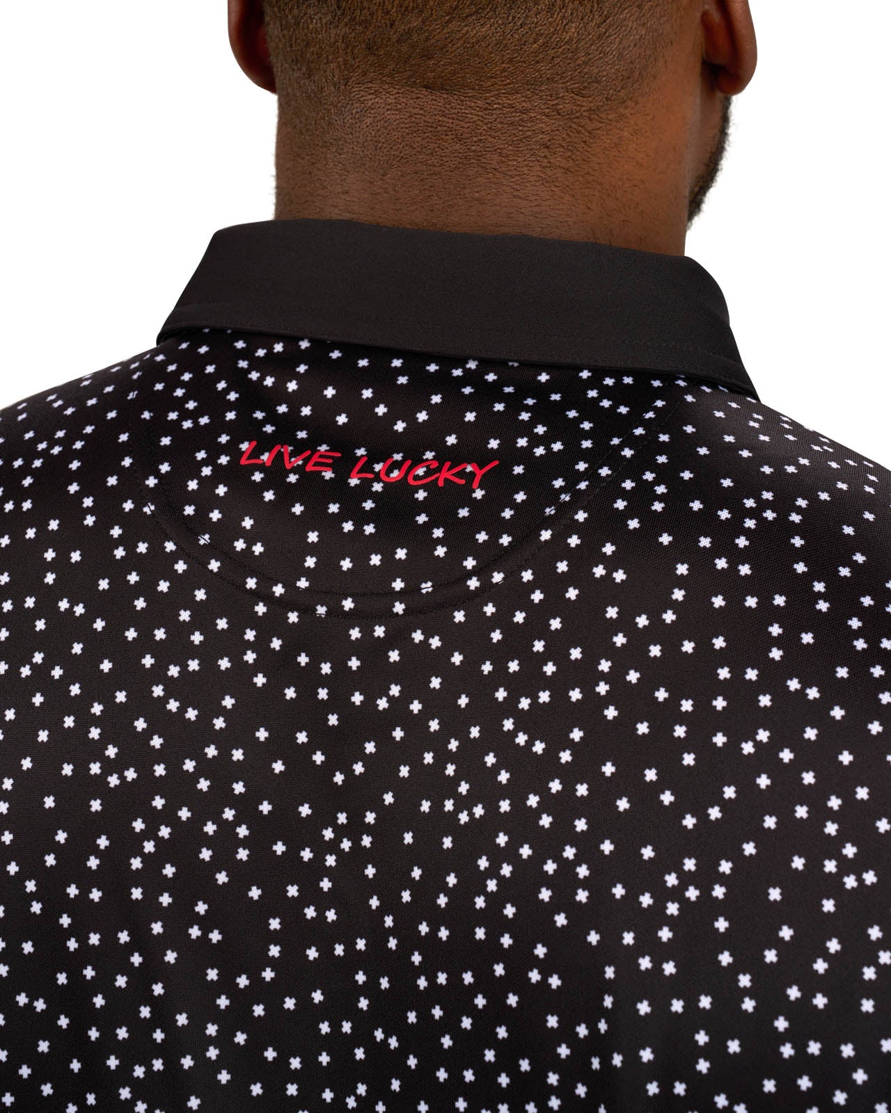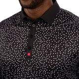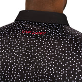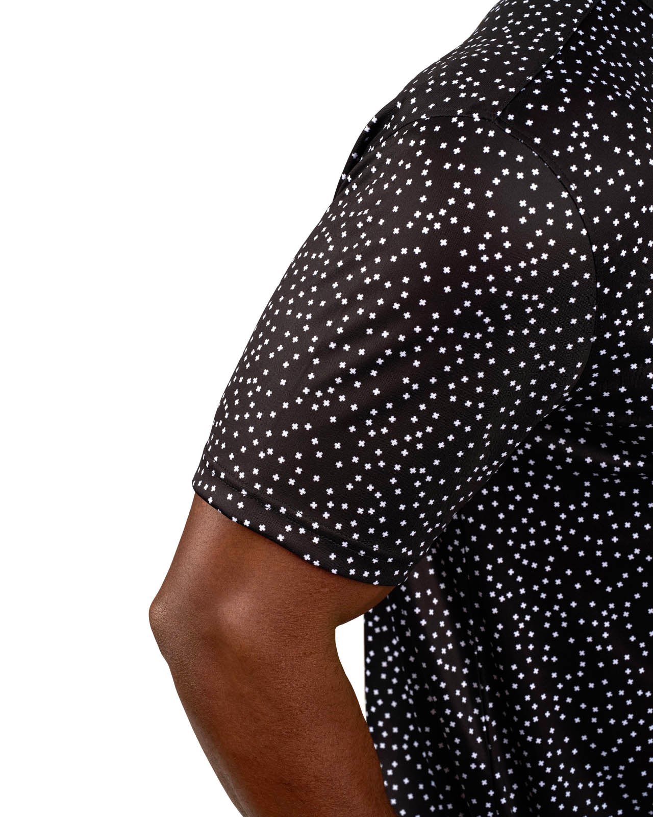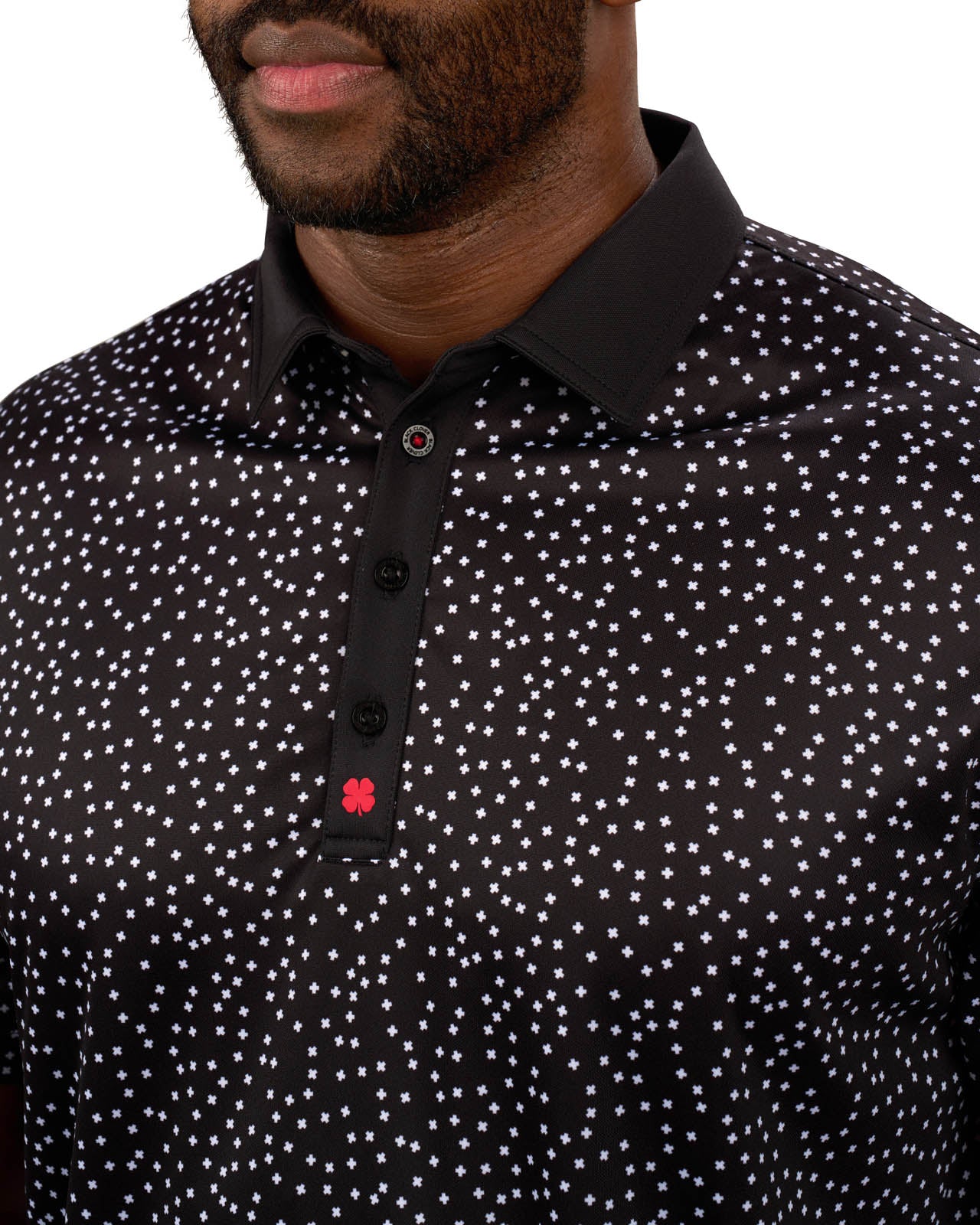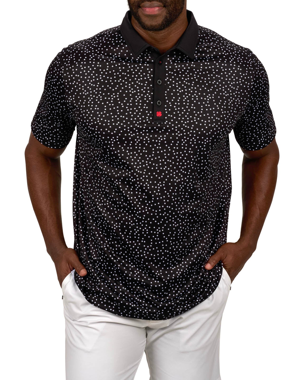 Our Tik Tak polo in black features a white pattern with a red clover embellishment. Crafted from poly stretch Syntrel, it offers breathability, moisture-wicking capabilities, and 4-way stretch. With low shrinkage and shape retention technology, it’s your go-to for all-day comfort and style.
