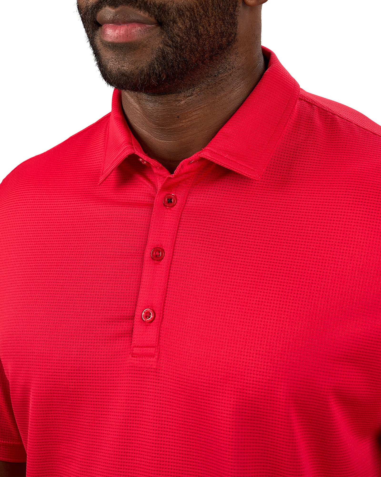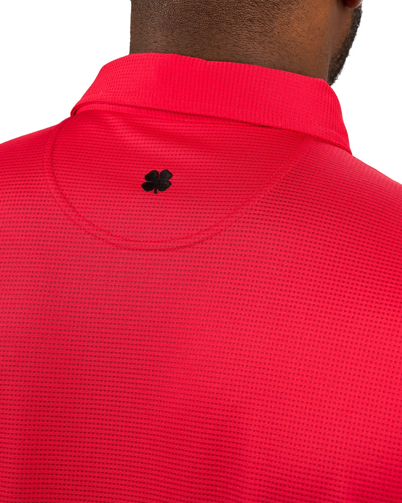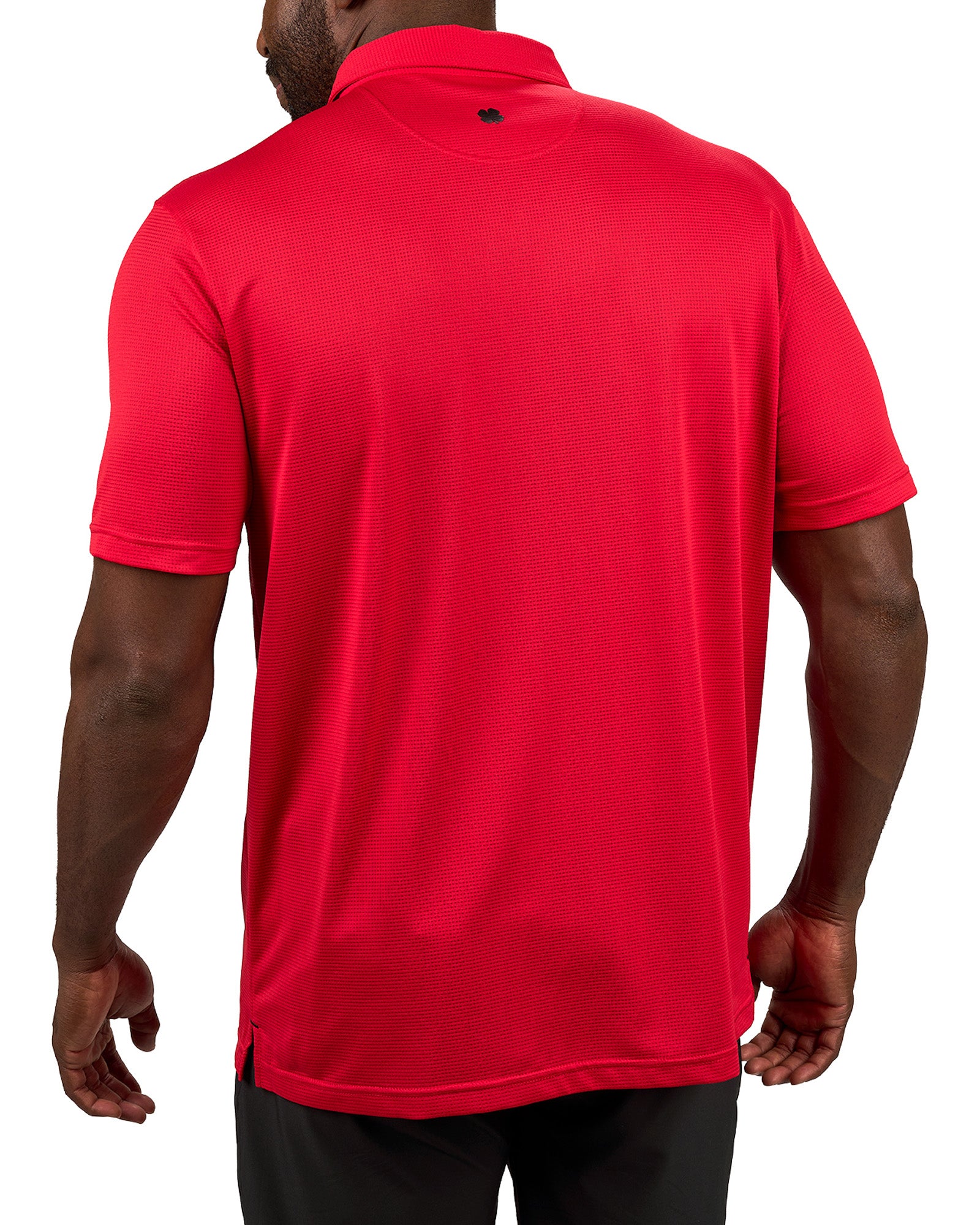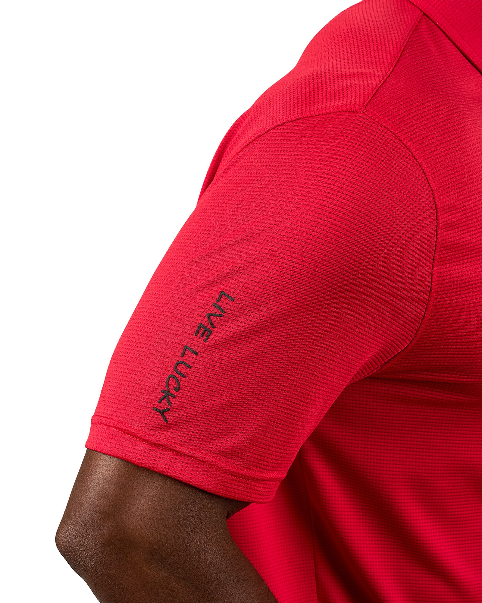 The Tubbs solid red polo combines sleek style with advanced performance. Made from Syntrel spandex double knit stretch, it offers 4-way stretch, breathable moisture-wicking, and shape retention. With low shrinkage, wrinkle-free tech, and “Live Lucky” on the sleeve, it’s perfect for the boardroom or the course.