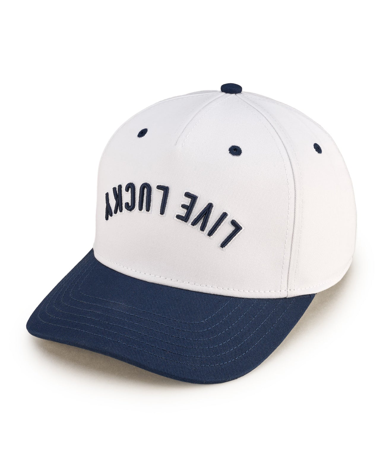 Top off your look with this vintage-inspired snapback hat. Featuring an adjustable fit, our Upside Down Luck 2 boasts a white crown with a contrasting navy brim and bold 3D embroidery. The design showcases our motto 'Live Lucky' in an upside down style, offering a perfect blend of classic style and modern edge.