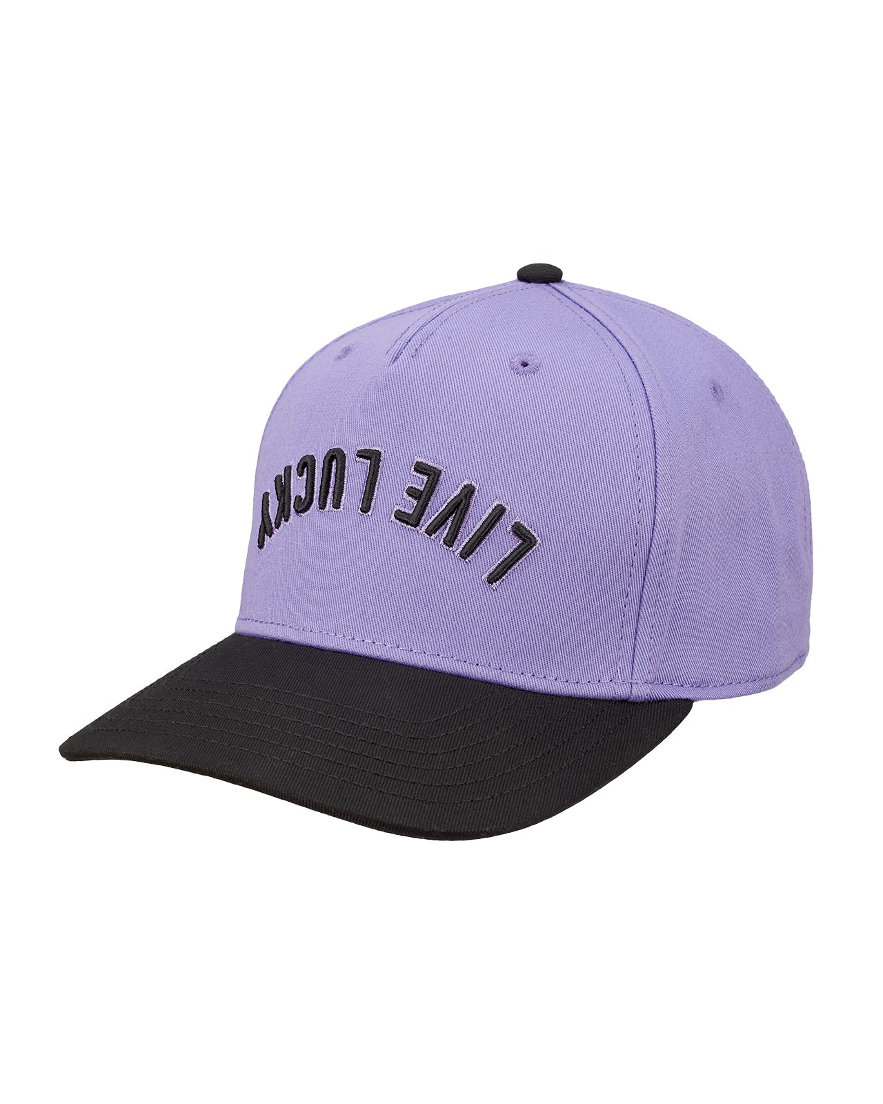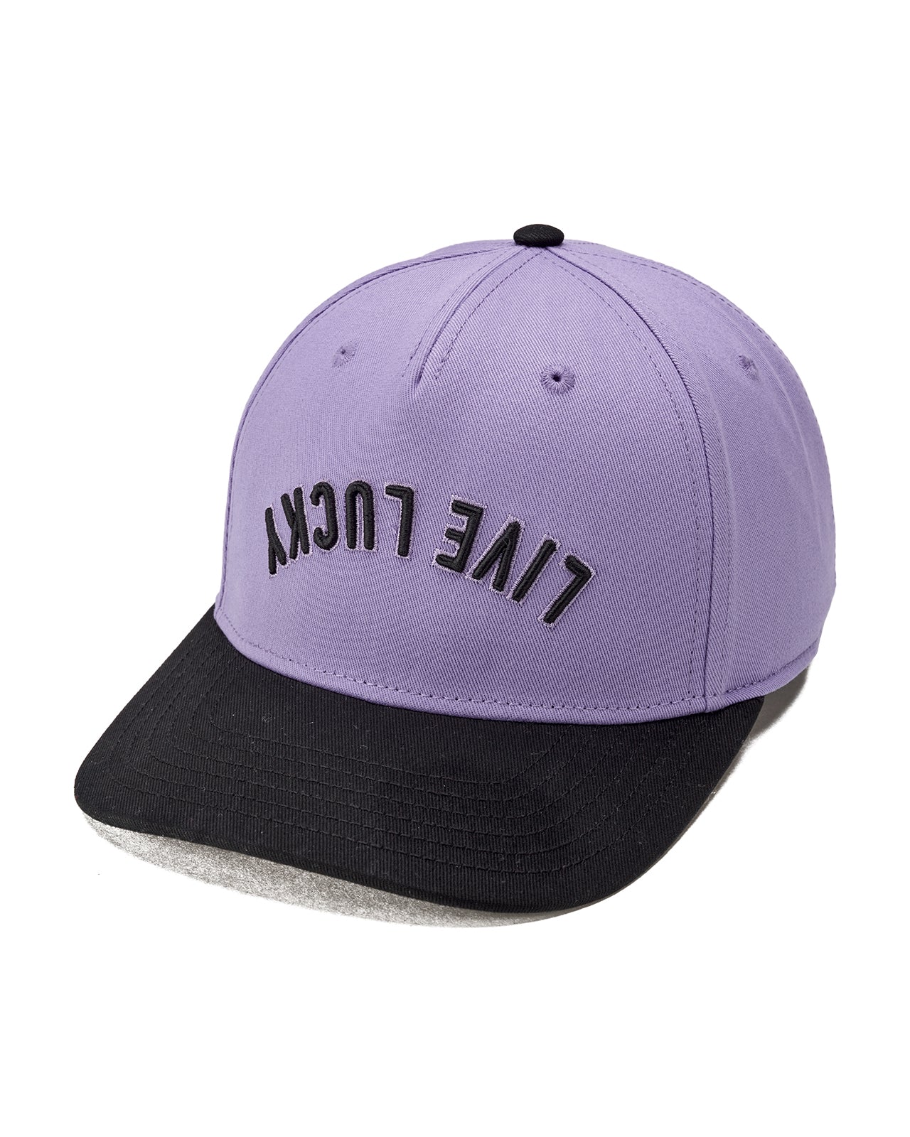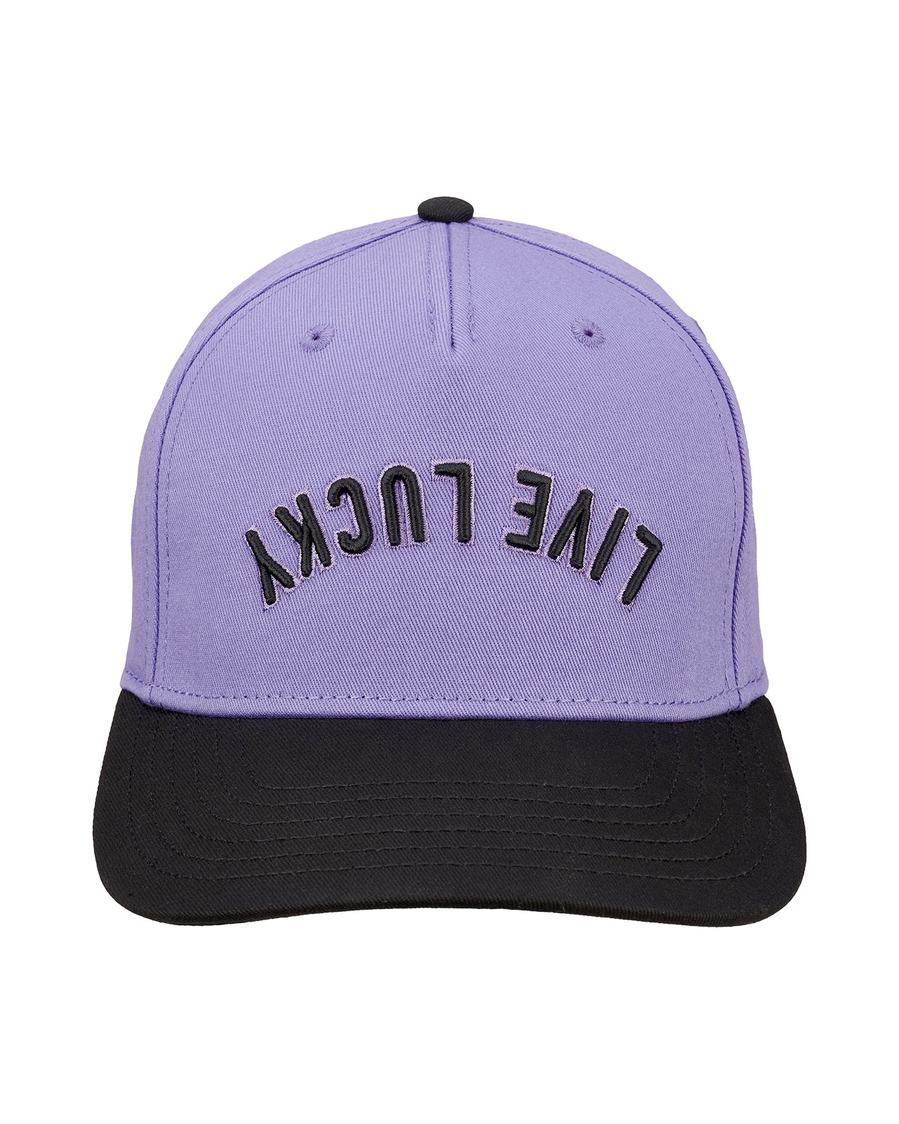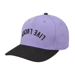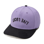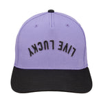 Top off your look with this vintage-inspired snapback hat. Featuring an adjustable fit, our Upside Down Luck 4 boasts a lilac crown with a contrasting black brim and bold 3D embroidery. The design showcases our motto 'Live Lucky' in an upside down style, offering a perfect blend of classic style and modern edge.